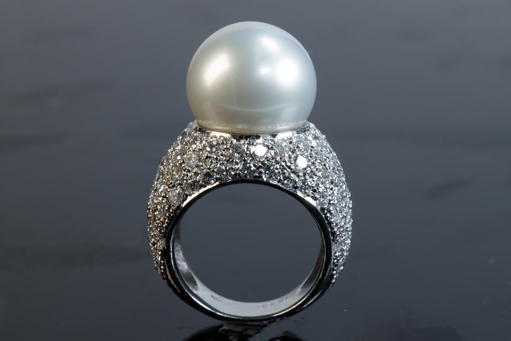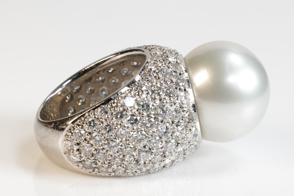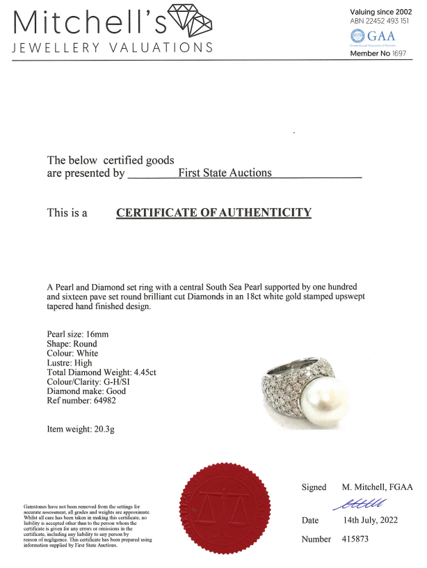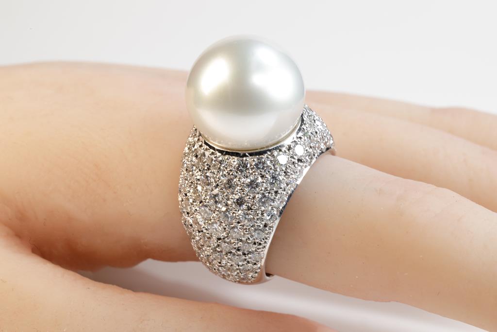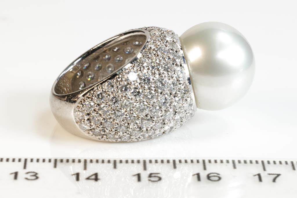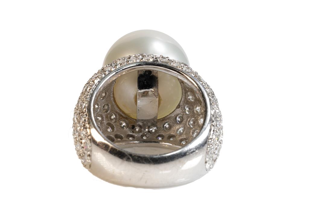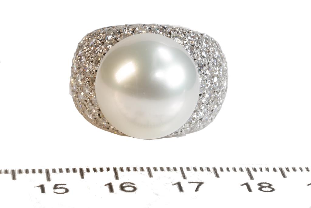 Pearl and Diamond ring with a South Sea Pearl of 16mm and round Diamonds totalling 4.45cts (Estimated grading: G-H SI). 18ct white gold. Ring size N1/2 - ring resizing is not recommended. Weight: 20.3g. With certificate #415873. (Pre-owned)