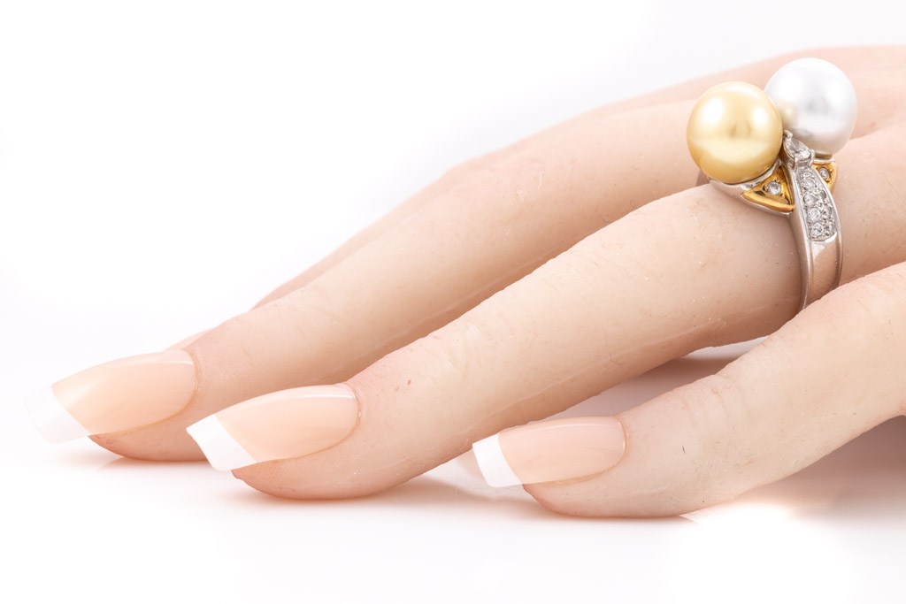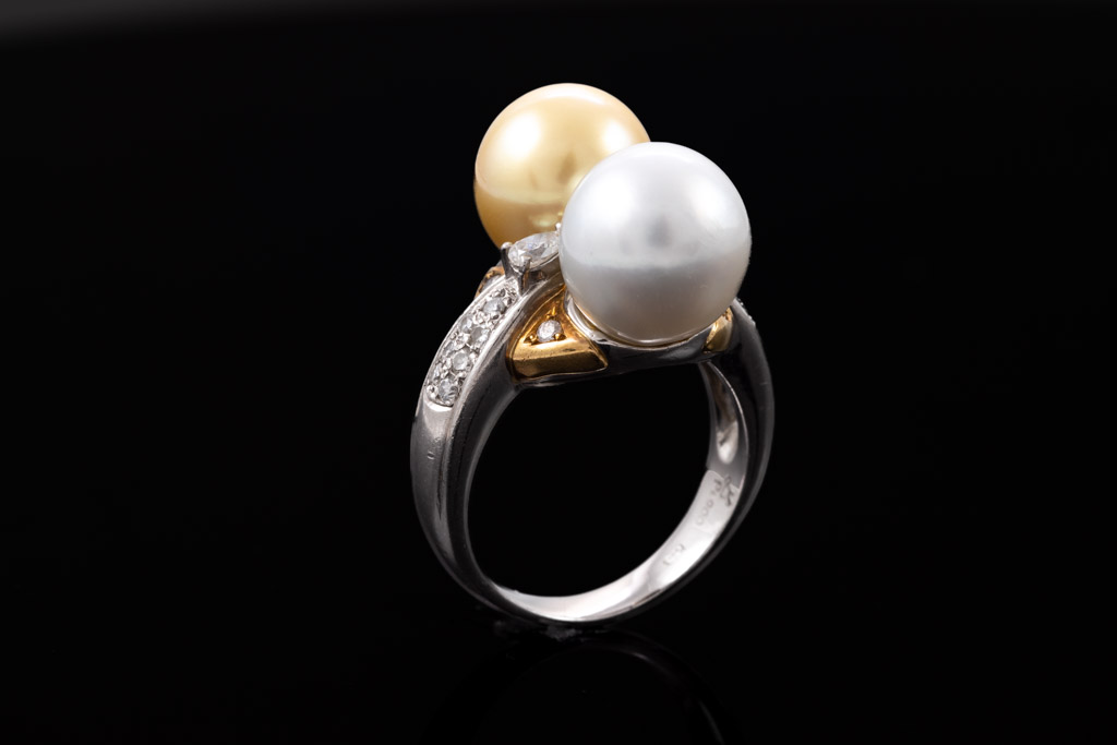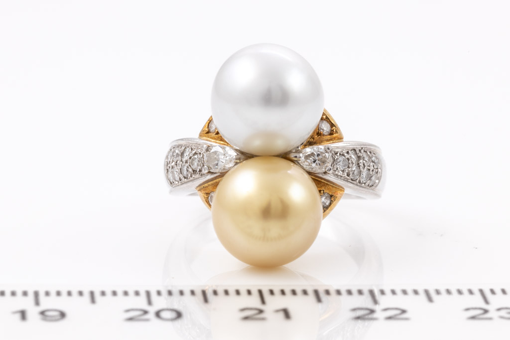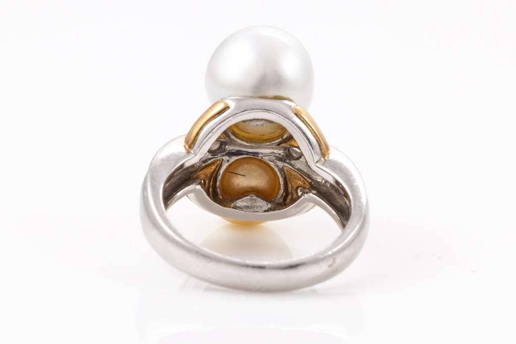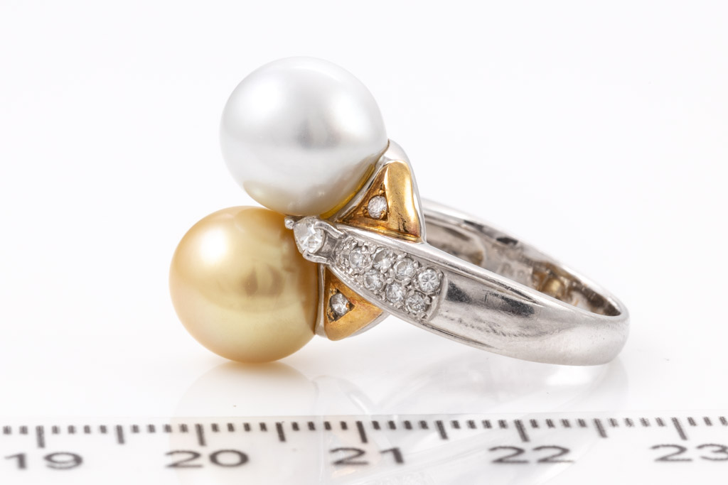 Pearl and Diamond ring with white South Sea Pearl of 10.4mm, golden South Sea Pearl of 10.1mm and round & pear shape Diamonds totalling 0.44cts (Estimated grading: G-H SI). 18ct yellow gold and platinum. Ring size L1/2 - ring resizing is not recommended. Weight: 12.8g. (Pre-owned)