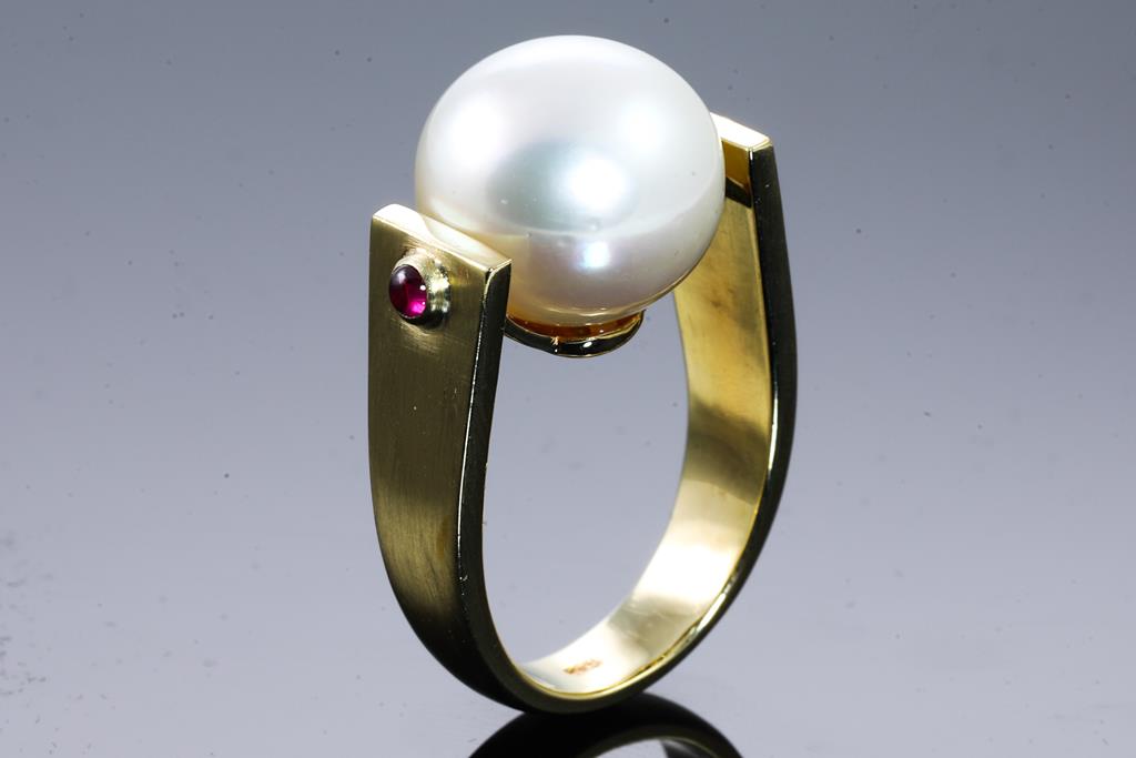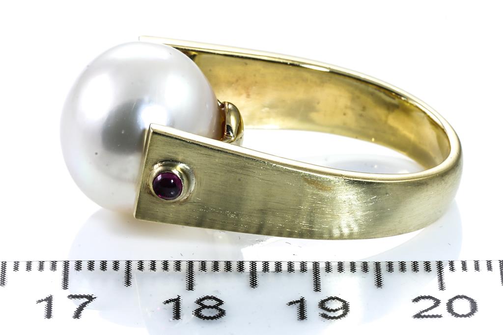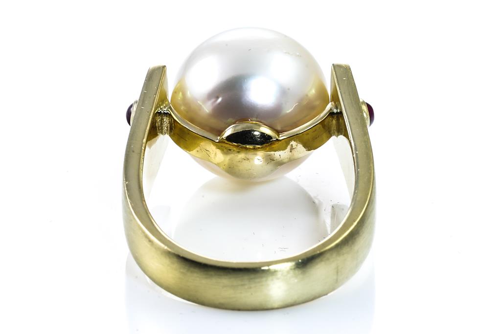 Pearl and Ruby ring with a button shape South Sea Pearl of 14mm and 2 round cabochon cut Rubies totalling 0.21cts. 18ct yellow gold with matte finish outer band. Ring size O1/2 - ring resizing is not recommended. Weight: 16.1g. (Pre-owned)