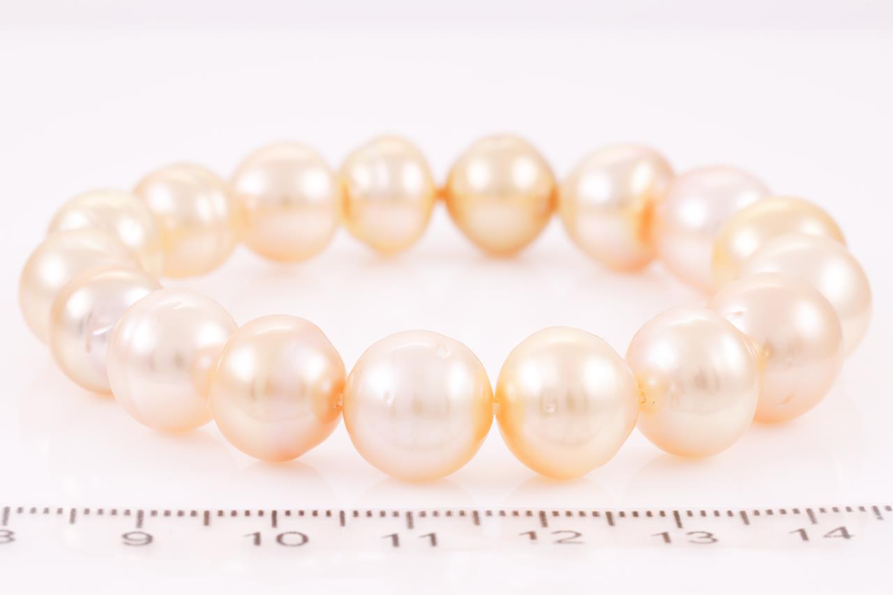 Pearl elasticated stretch bracelet with 17 golden South Sea pearls of 11.8-9.2mm. Circumference: 18cm. Weight: 32.0g. (New)