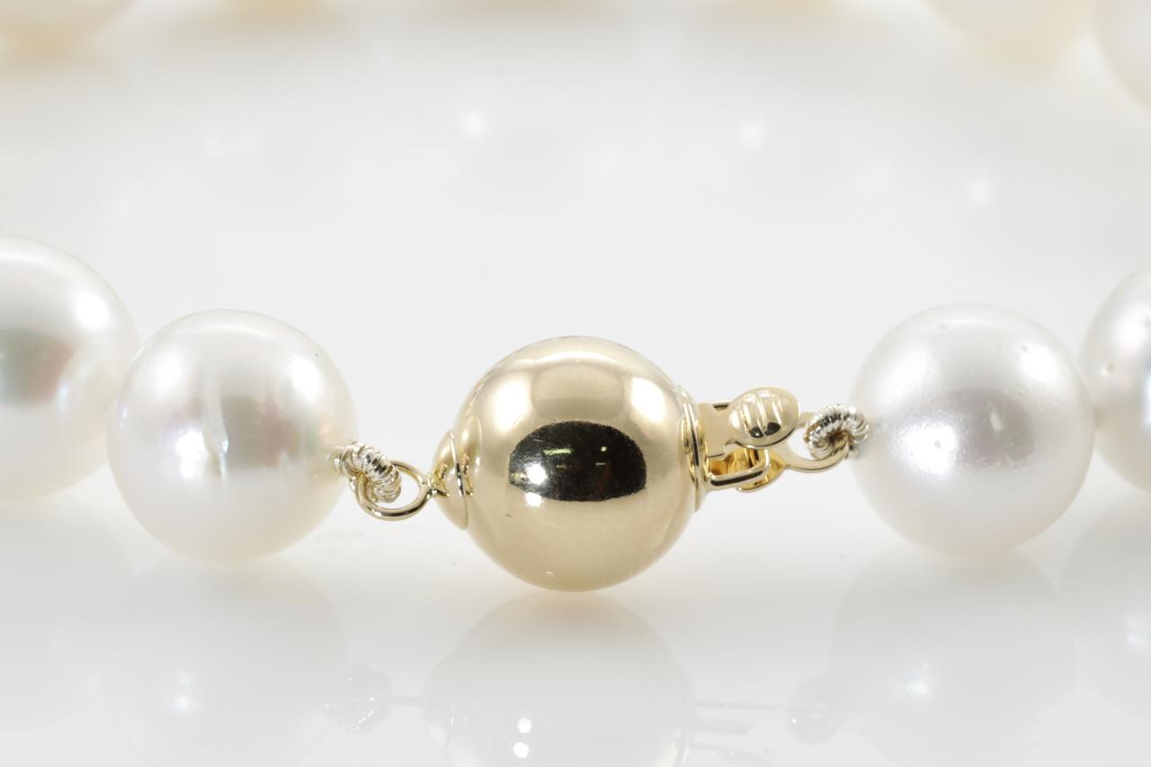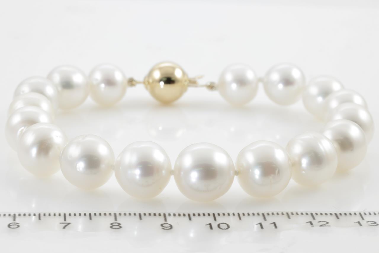 Pearl bracelet with 17 pinkish white Australian South Sea circle pearls of 10mm - 12.1mm. With 14ct yellow gold clasp. Length: 21cm. Weight: 33.2g. (New)