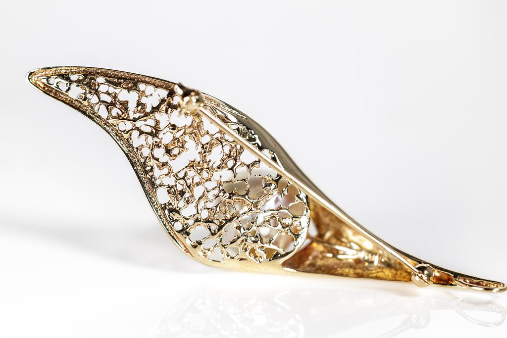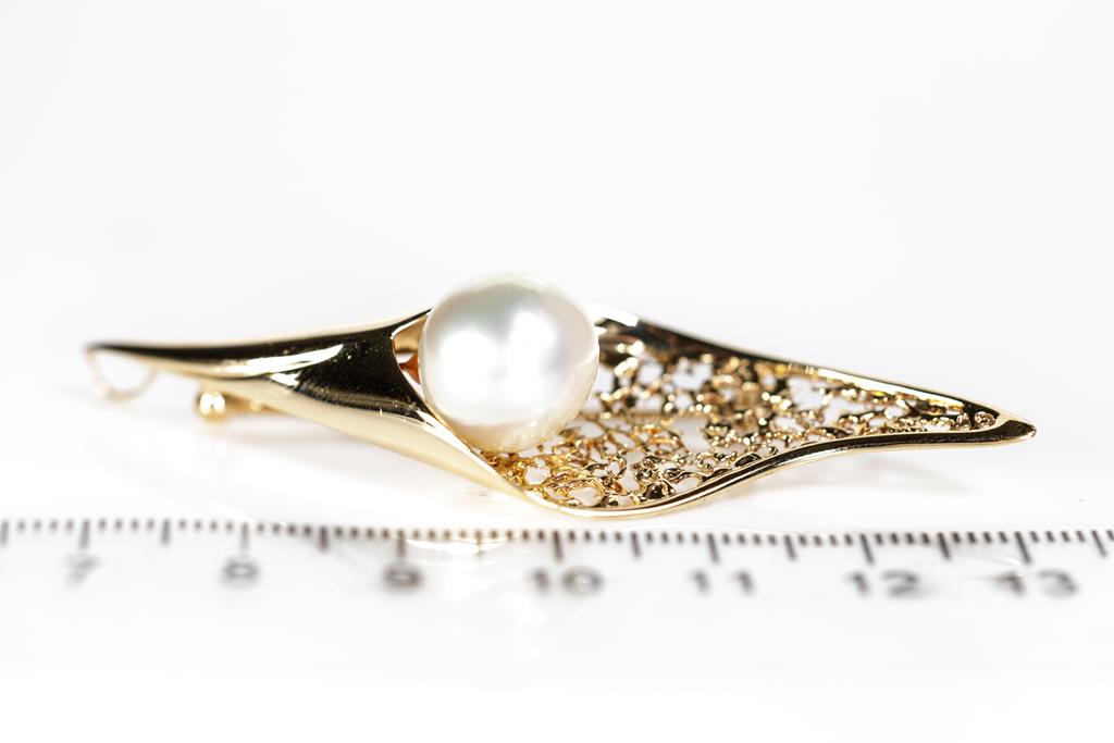 Pearl brooch/pendant with a South Sea Pearl of 11.3mm. 18ct yellow gold. Weight: 8.5g. (Pre-owned)