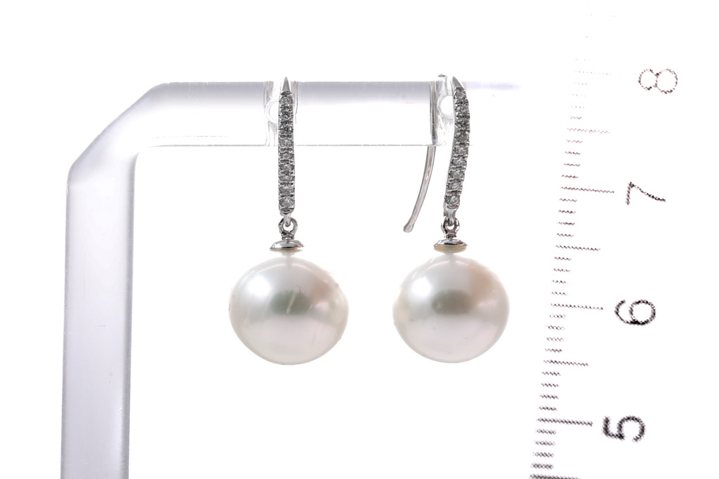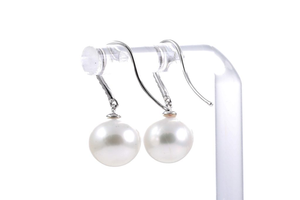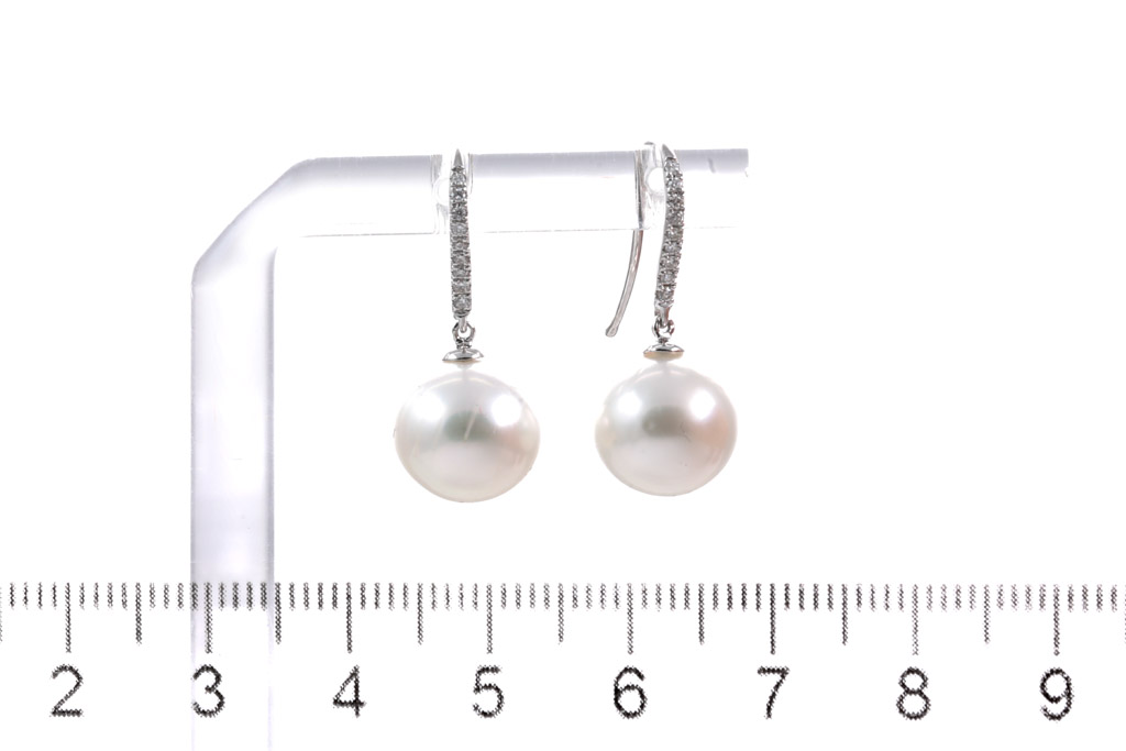 Pearl shepherds hook earrings with South Sea pearls of 10.2mm and round Diamonds totalling 0.20cts. 18ct white gold. Weight: 4.2g. (New)