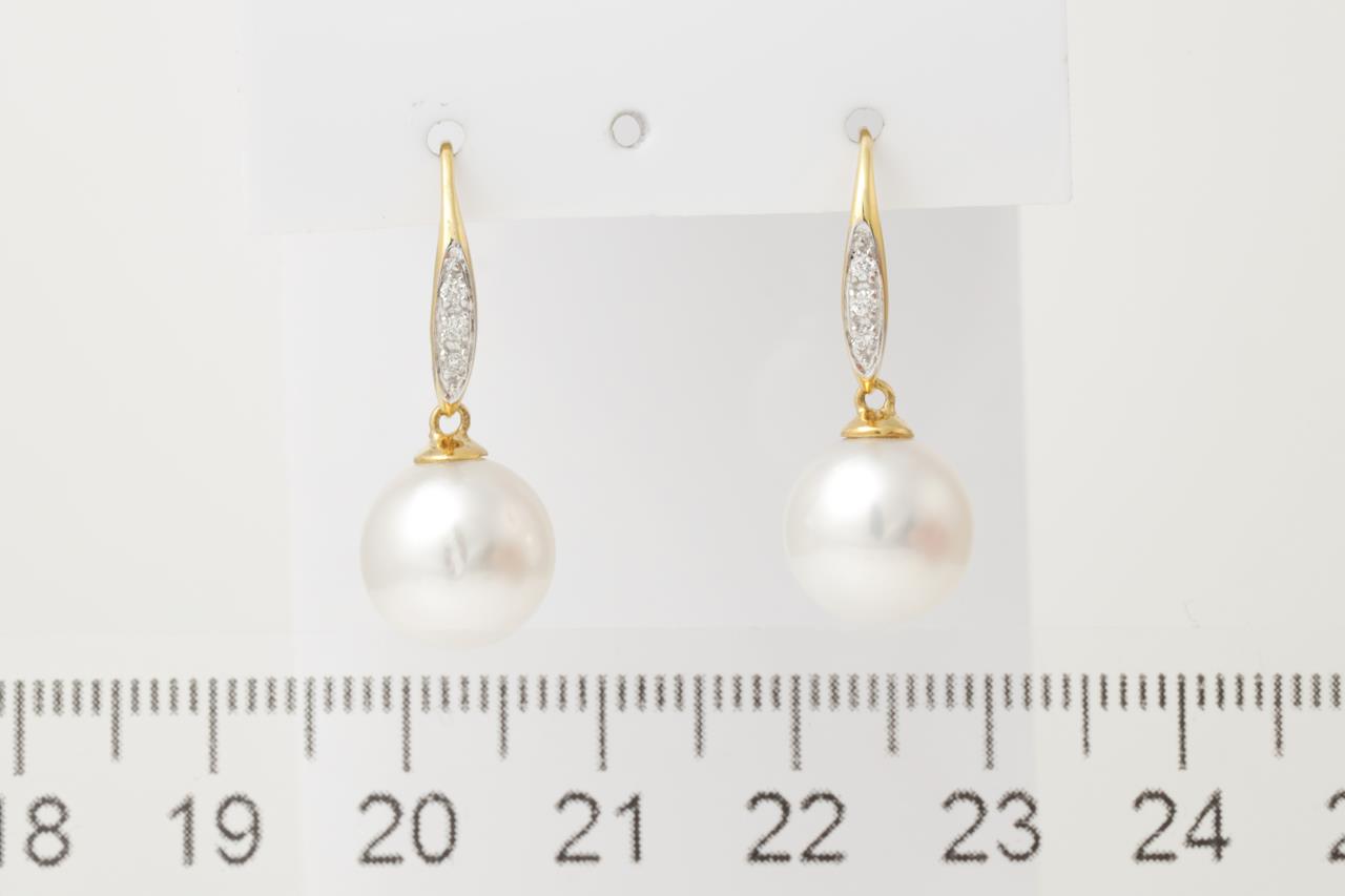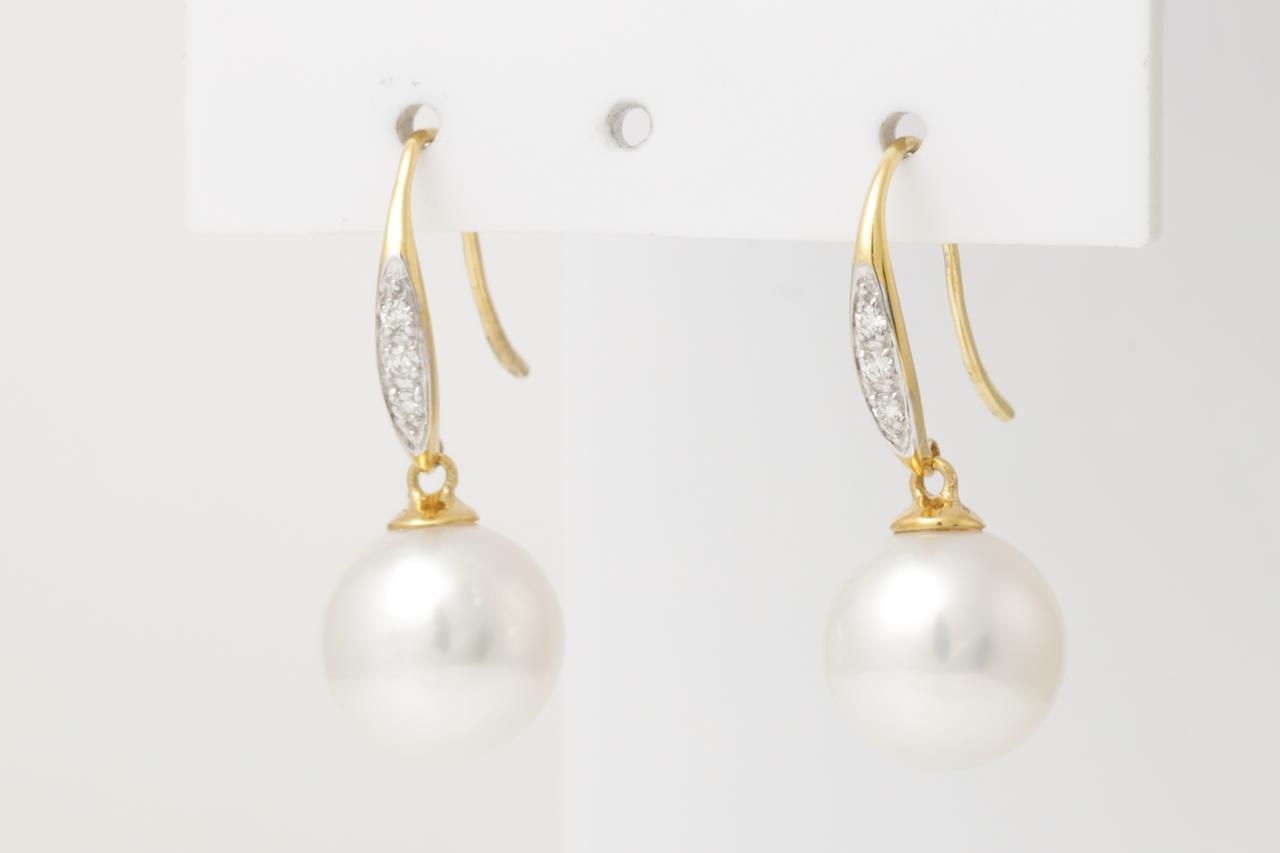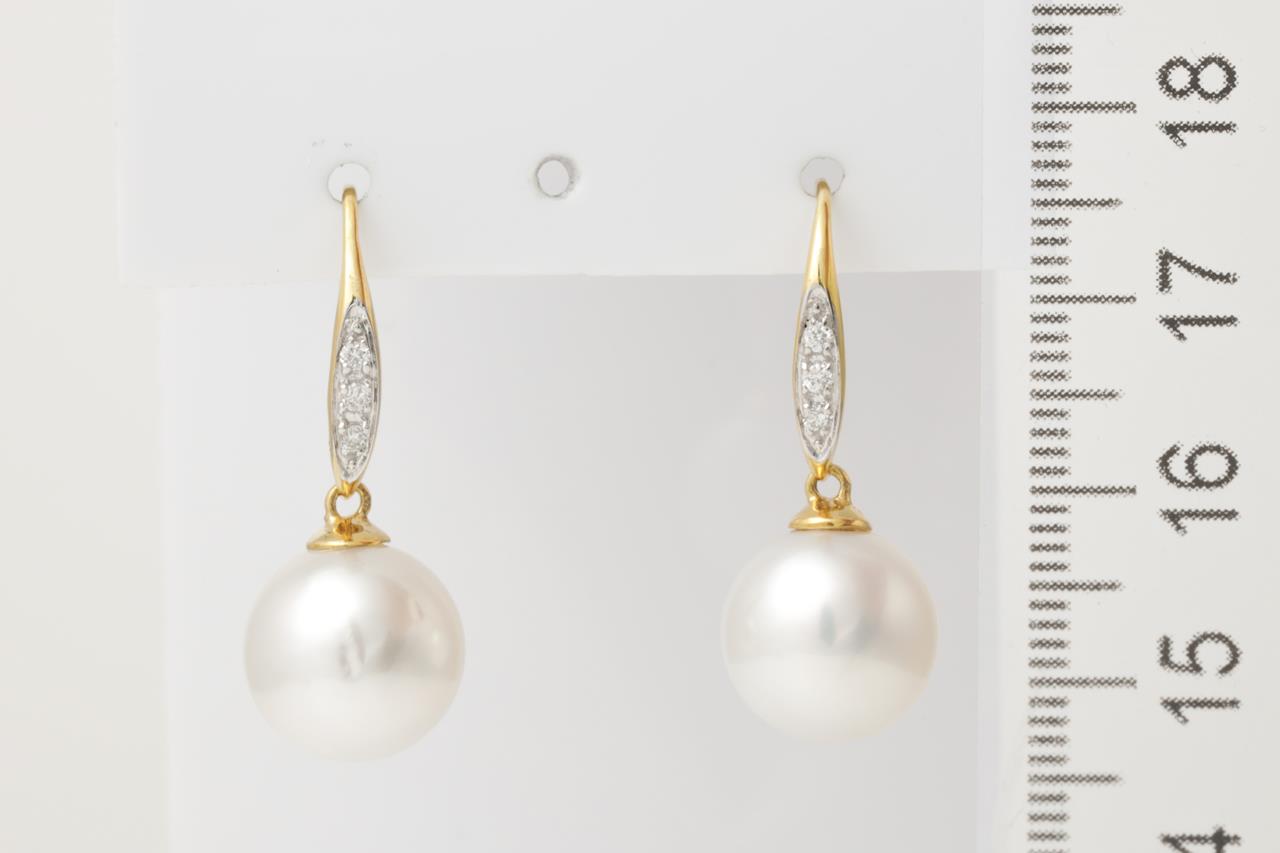 Pearl shepherd hook earrings with white round South Sea Pearls of 11mm, 18ct yellow gold. Weight 4.6g. (As New)