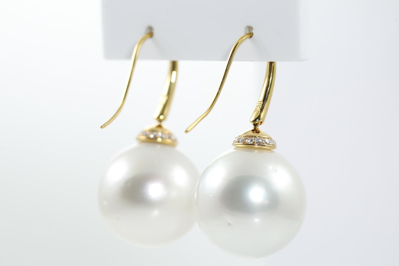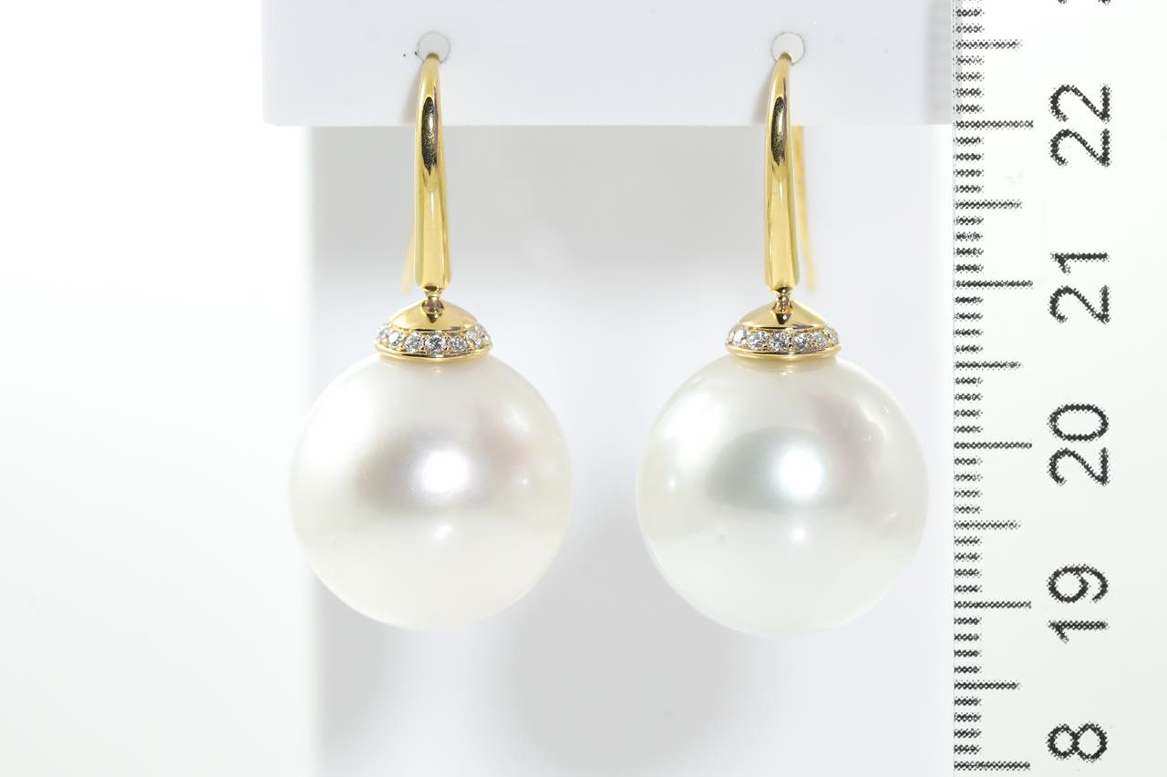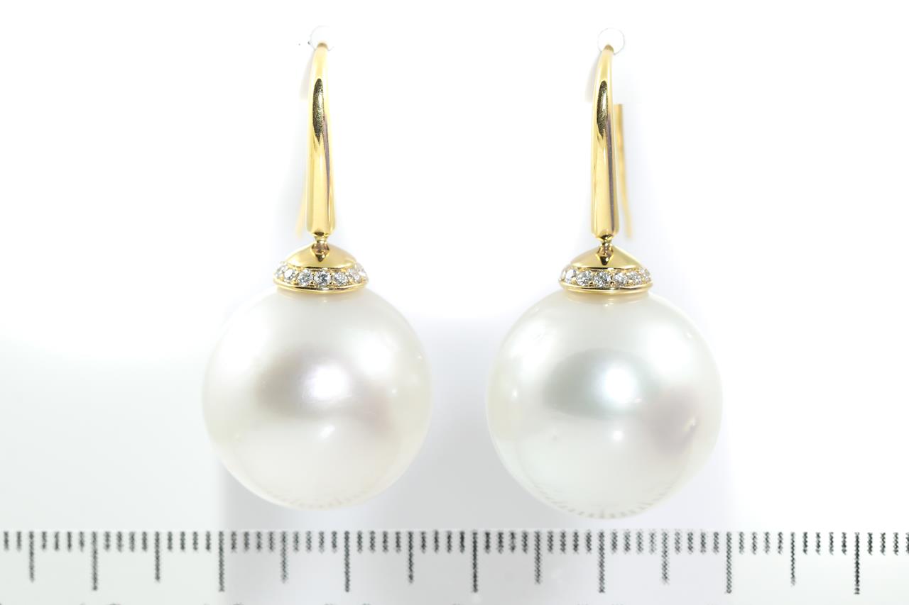 South Sea Pearl earrings of 18-19mm and round Diamonds totalling approximately 0.30cts (Estimated grading G VS). 18ct yellow gold. Weight 21.3g. (New)