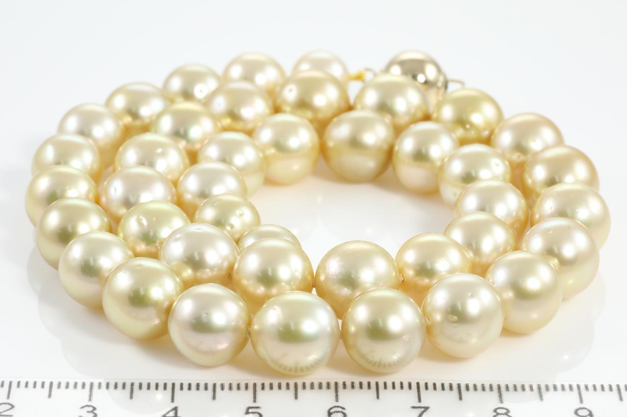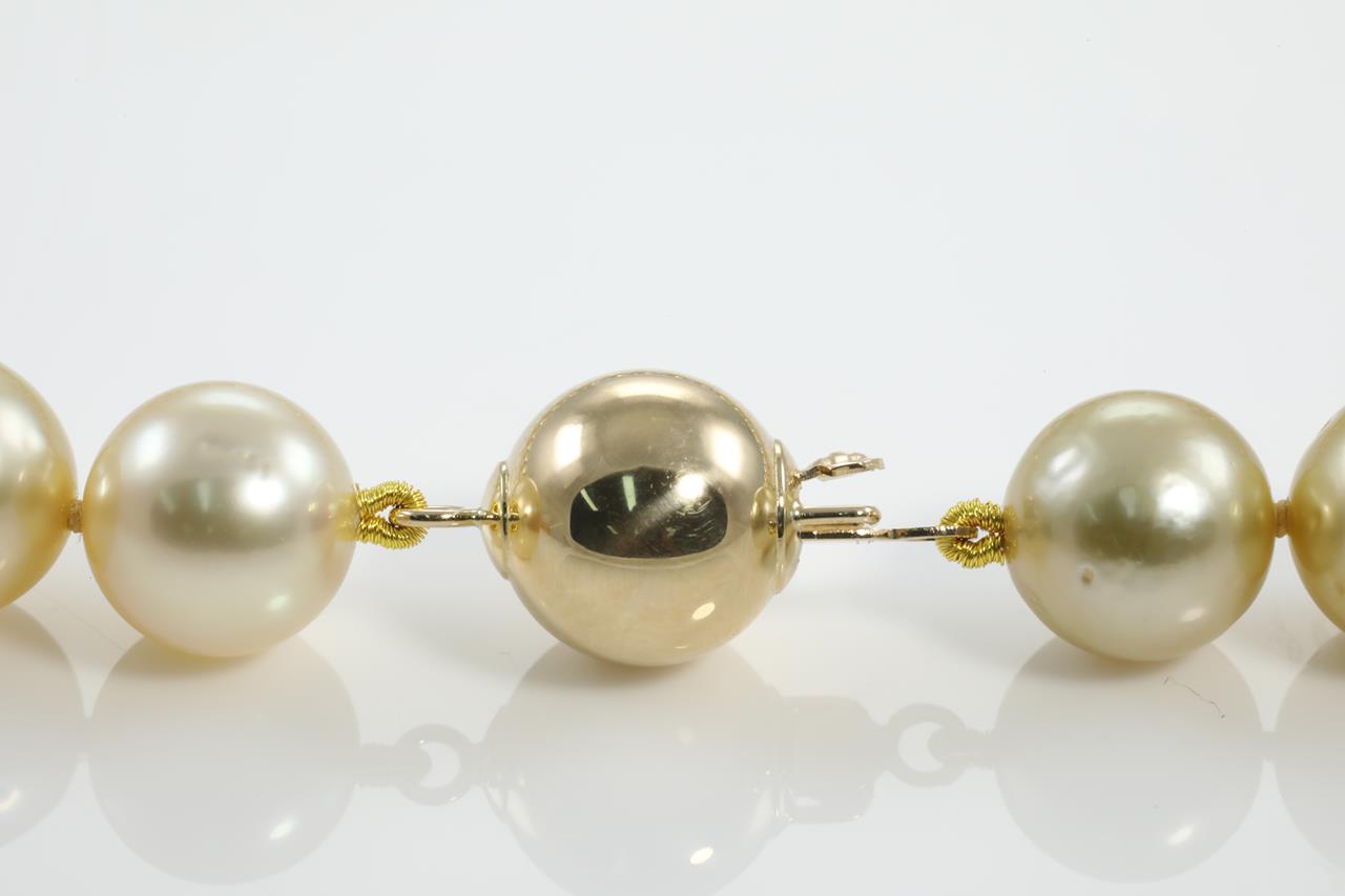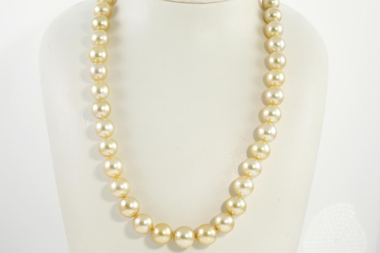 Pearl necklace with 41 slightly graduated Golden South Sea Pearl of 11.5mm - 9.1mm. 14ct yellow gold clasp. Length: 45cm. Weight: 67.2g (New)