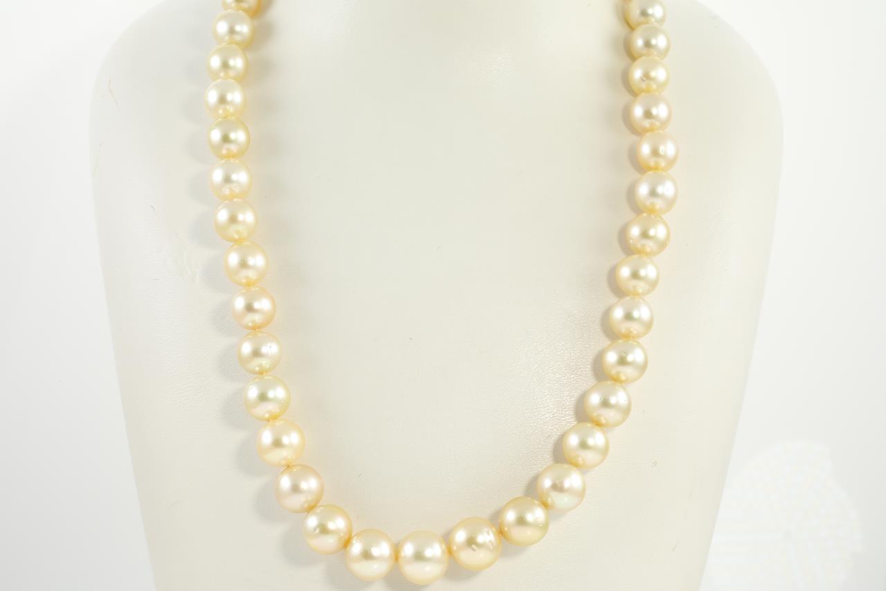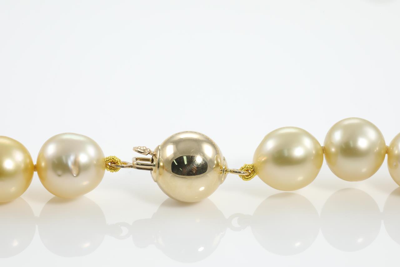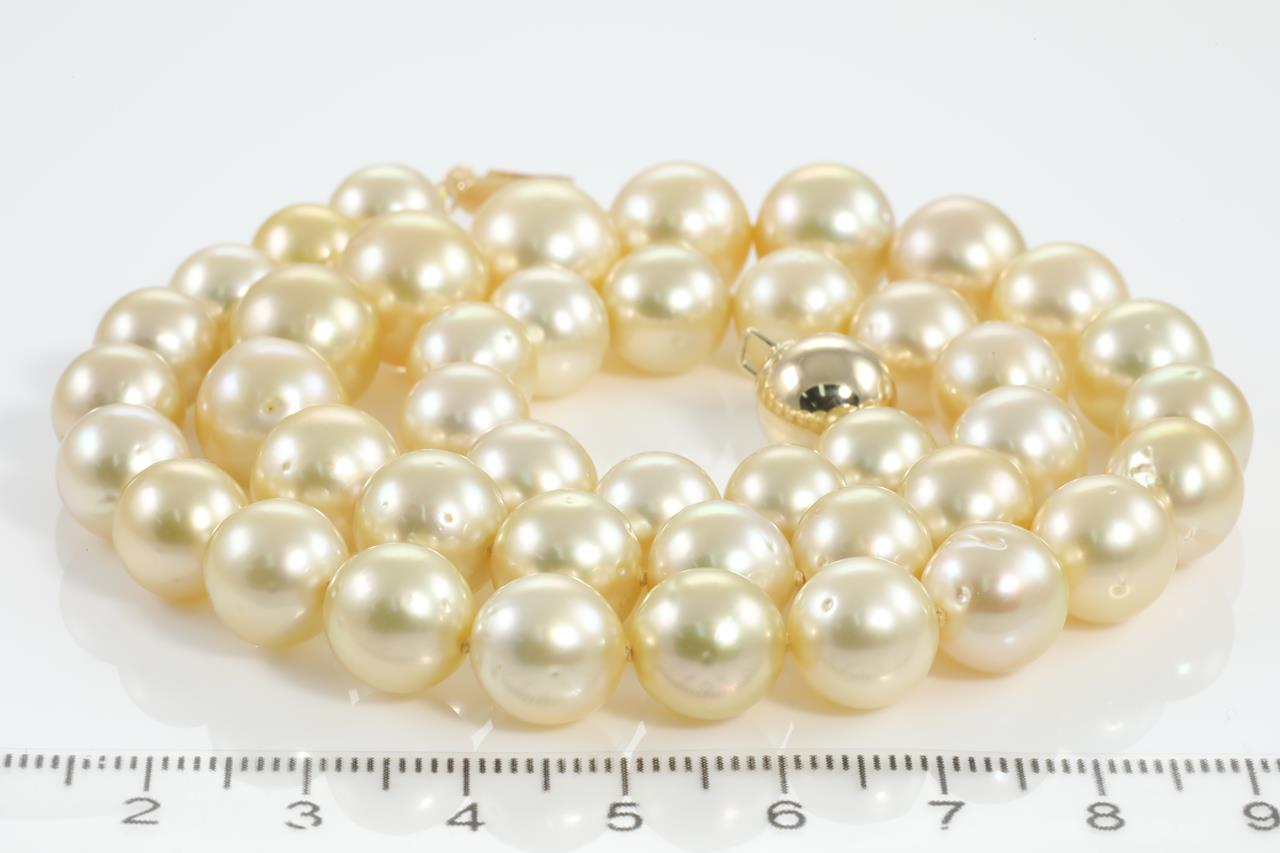 Pearl necklace with 43 slightly graduated light golden South Sea Pearl of 11.7mm - 9.0mm. 14ct yellow gold clasp. Length: 45cm. Weight: 62.7g (New)