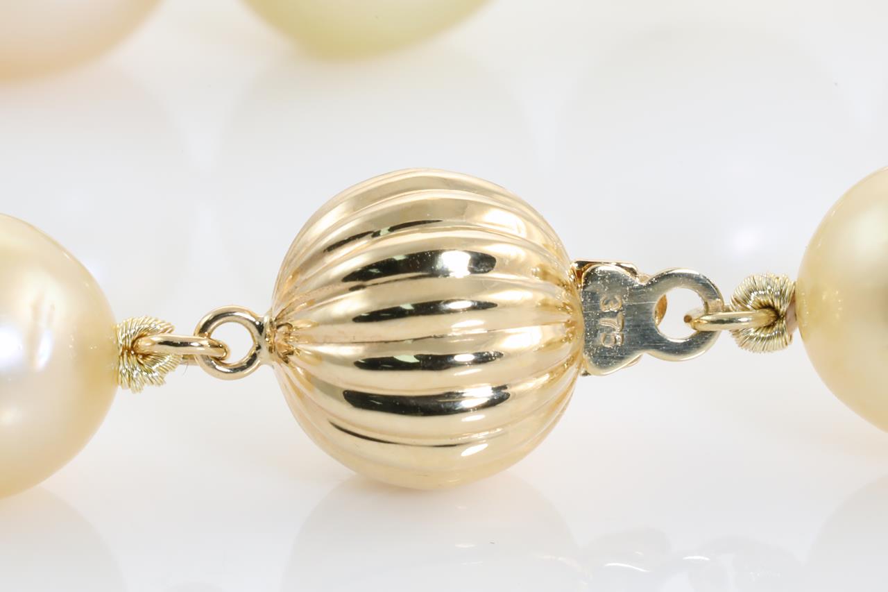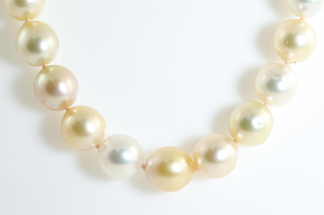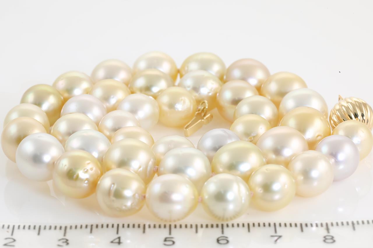 Pearl necklace with 39 mixed shade South Sea Pearls of 8.9mm-11.1mm. With 9ct yellow gold clasp. Length: 44.5cm. Weght: 59g. (New)