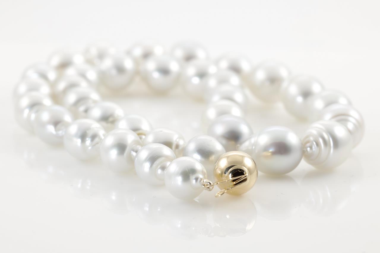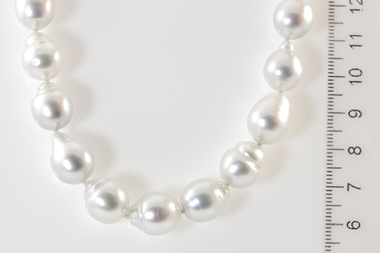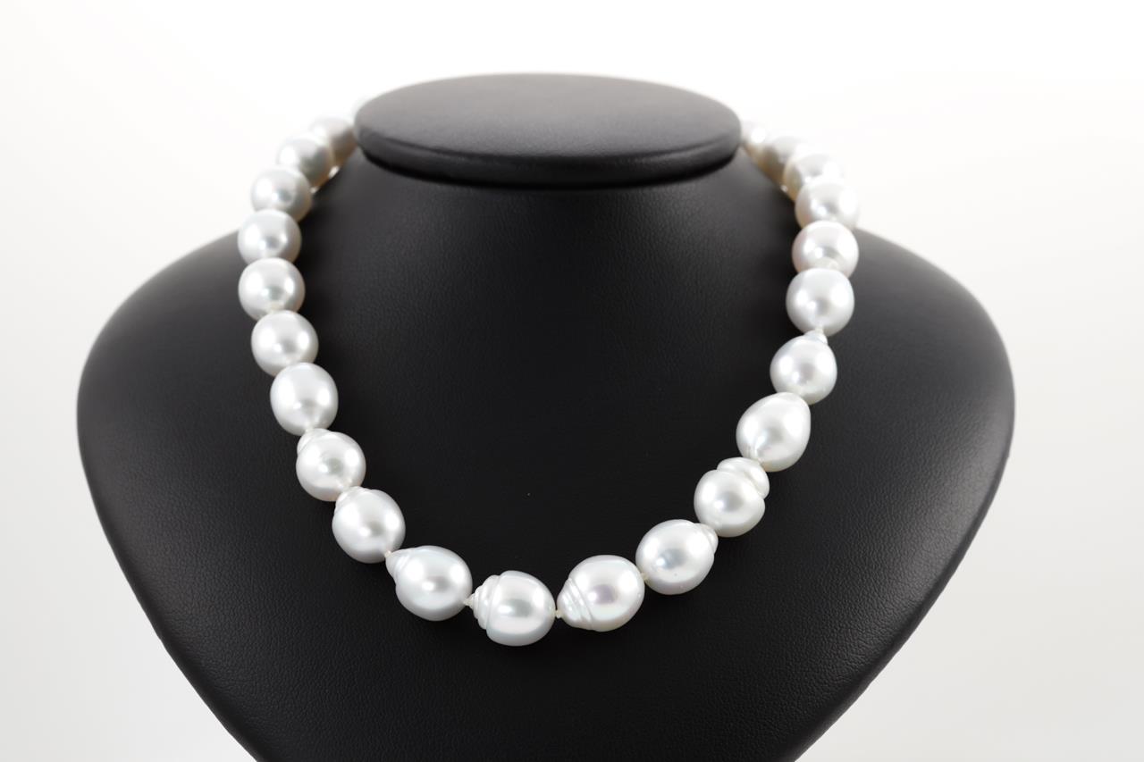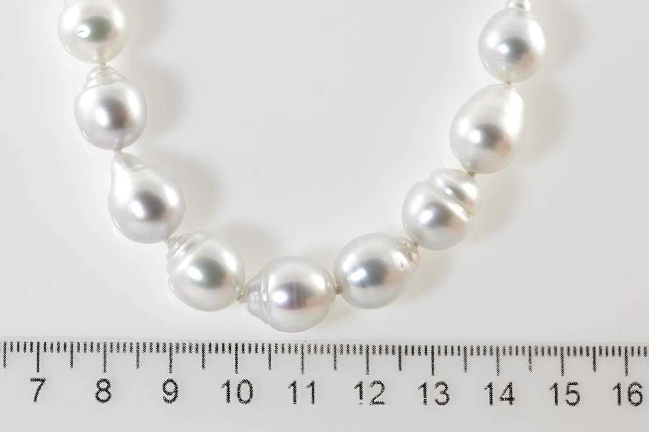 Pearl necklace with 33 semi drop shape silver Australian South Sea Pearls of 9.4mm-11.6mm. 14ct yellow gold clasp. Length: 44cm. Weight: 60.2g. (New)