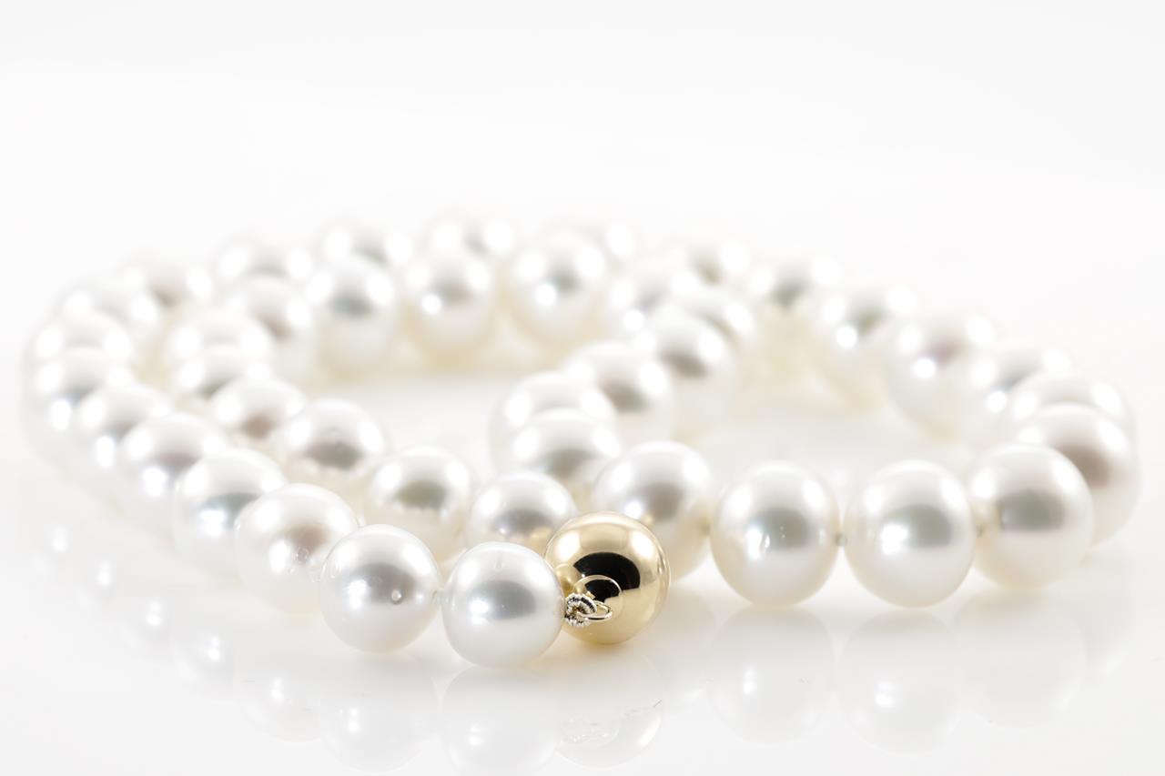 Pearl necklace with 41 button shape Australian South Sea Pearls of 9.4mm-11.8mm. 14ct yellow gold clasp. Length: 45cm. Weight: 67.1g. (New)