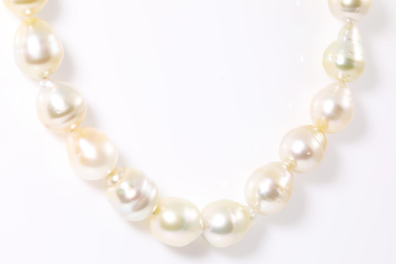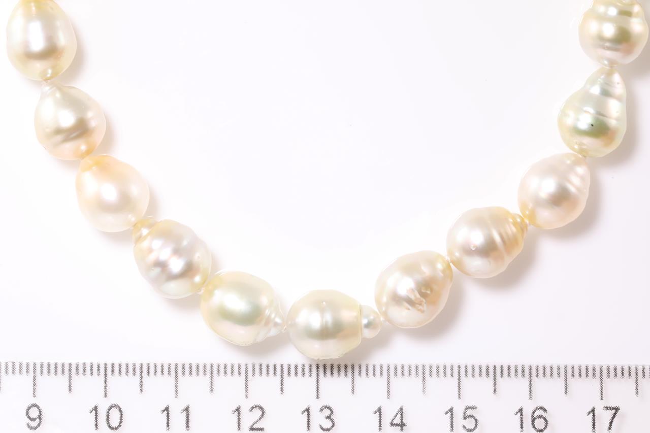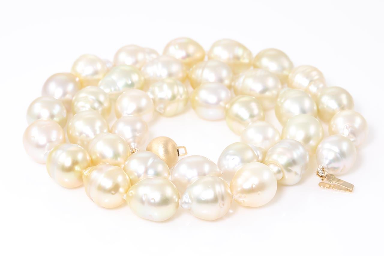 Pearl necklace with 36 light golden South Sea circle Pearls of 9.1mm-9.9mm. 14ct yellow gold 8mm matte finish clasp. Length: 44cm. Weight: 50.6g. (New)