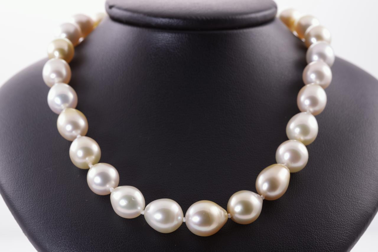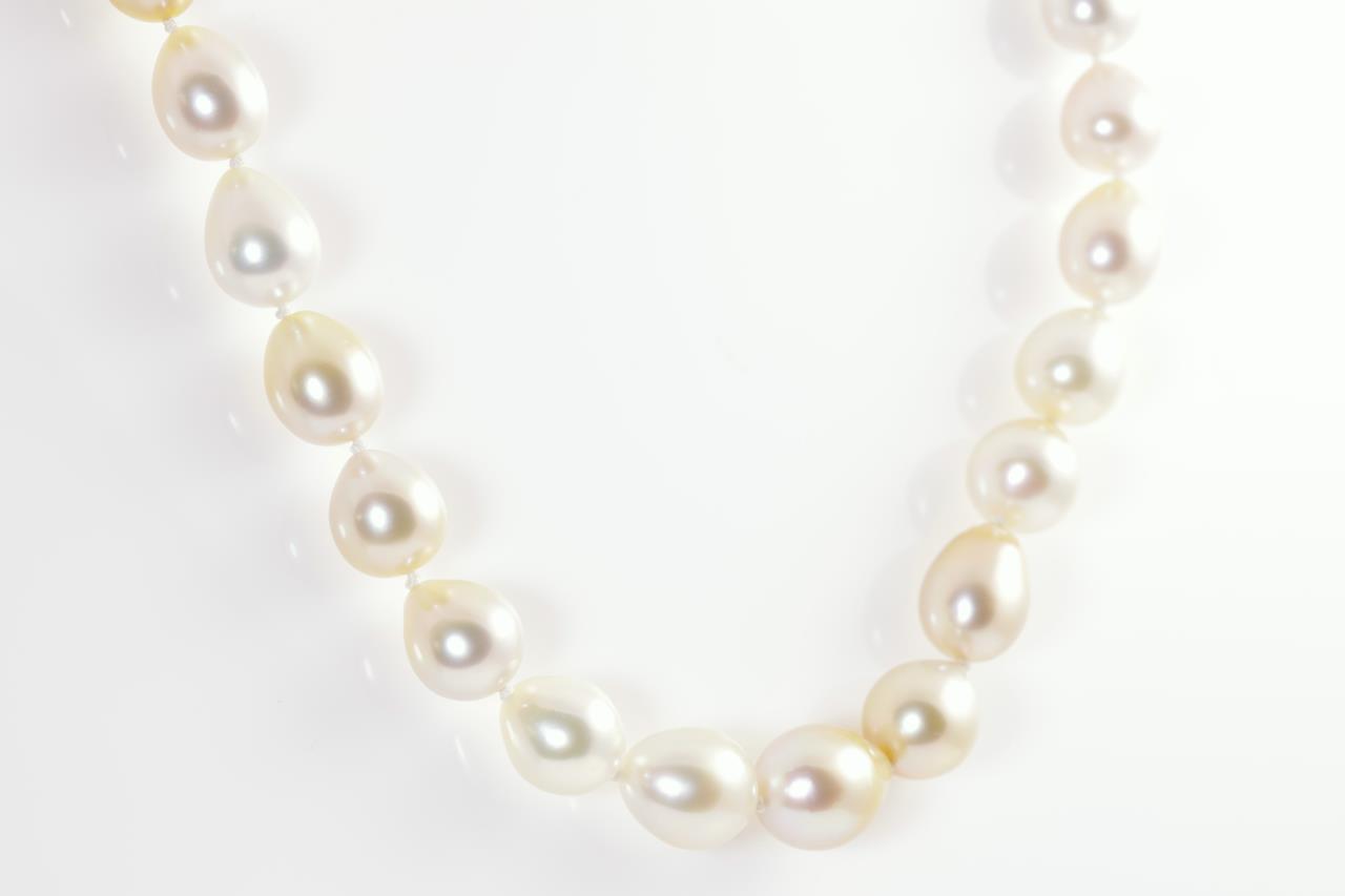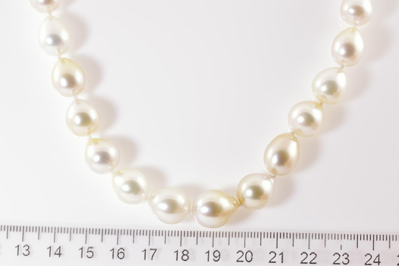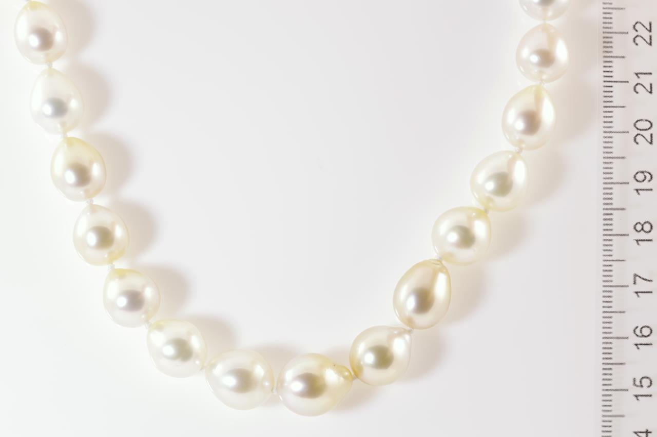 Pearl necklace with 35 graduated light gold drop shape South Sea pearls of 12.1mm-9.0mm. With 18ct yellow gold clasp. Length: 48cm. Weight: 64.8g. (New)