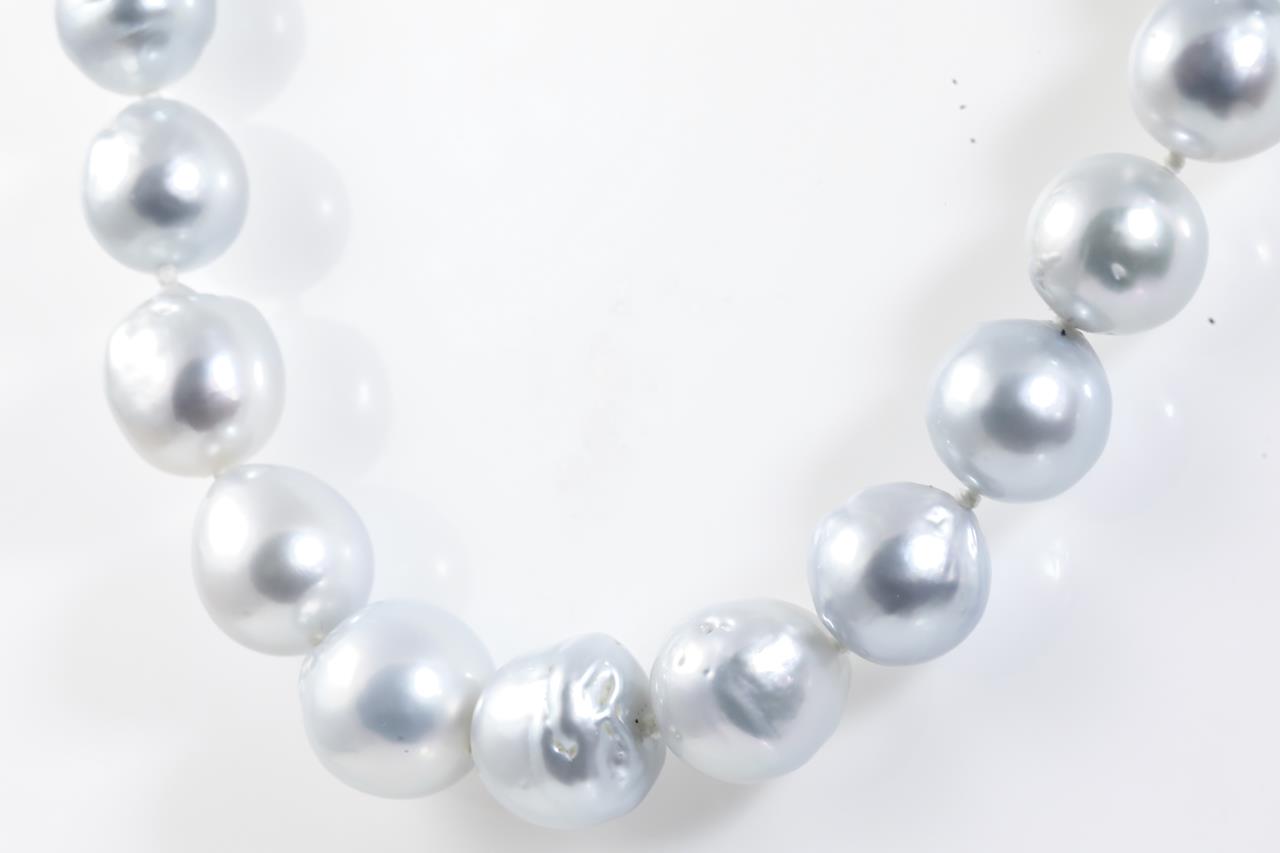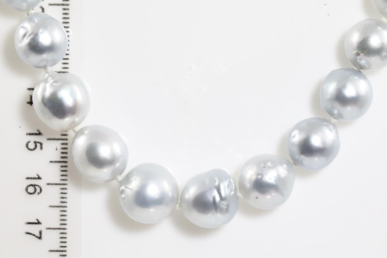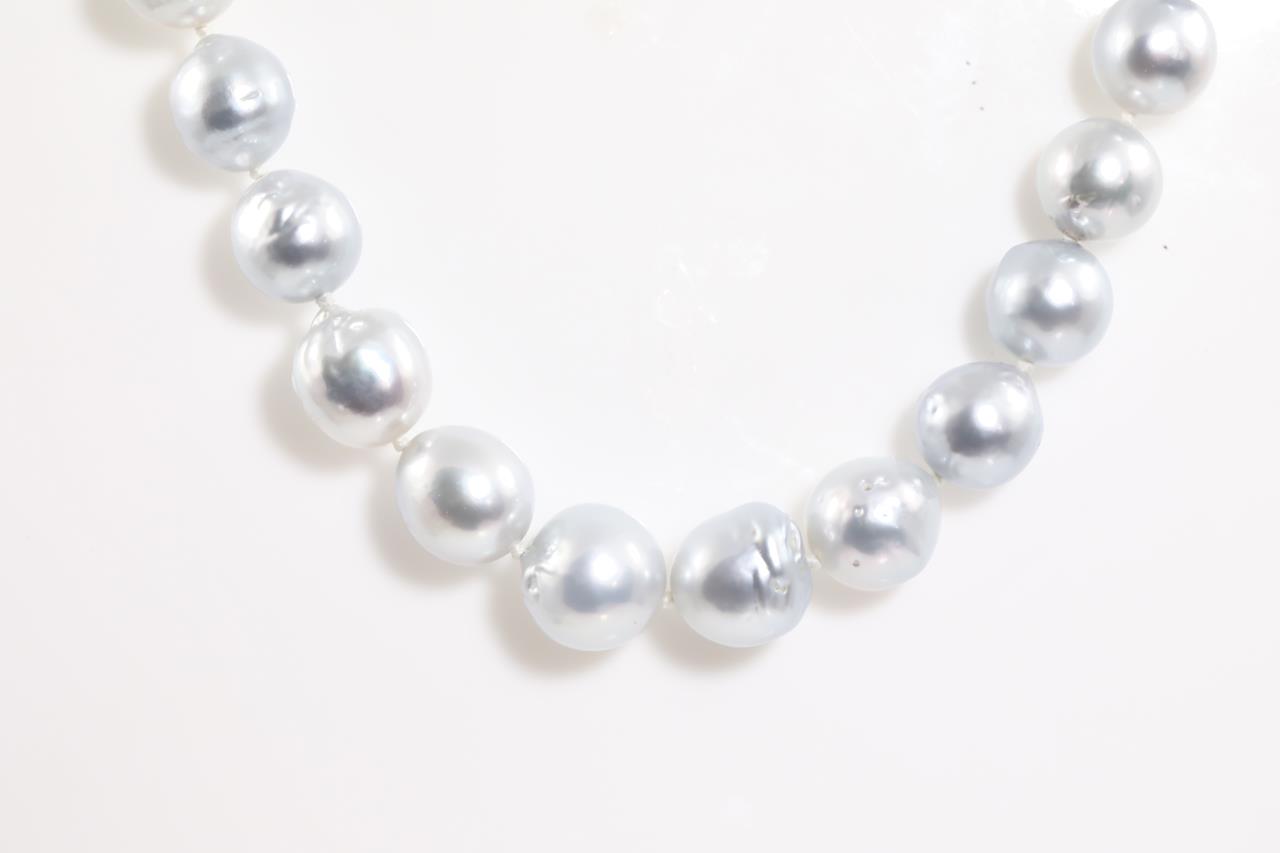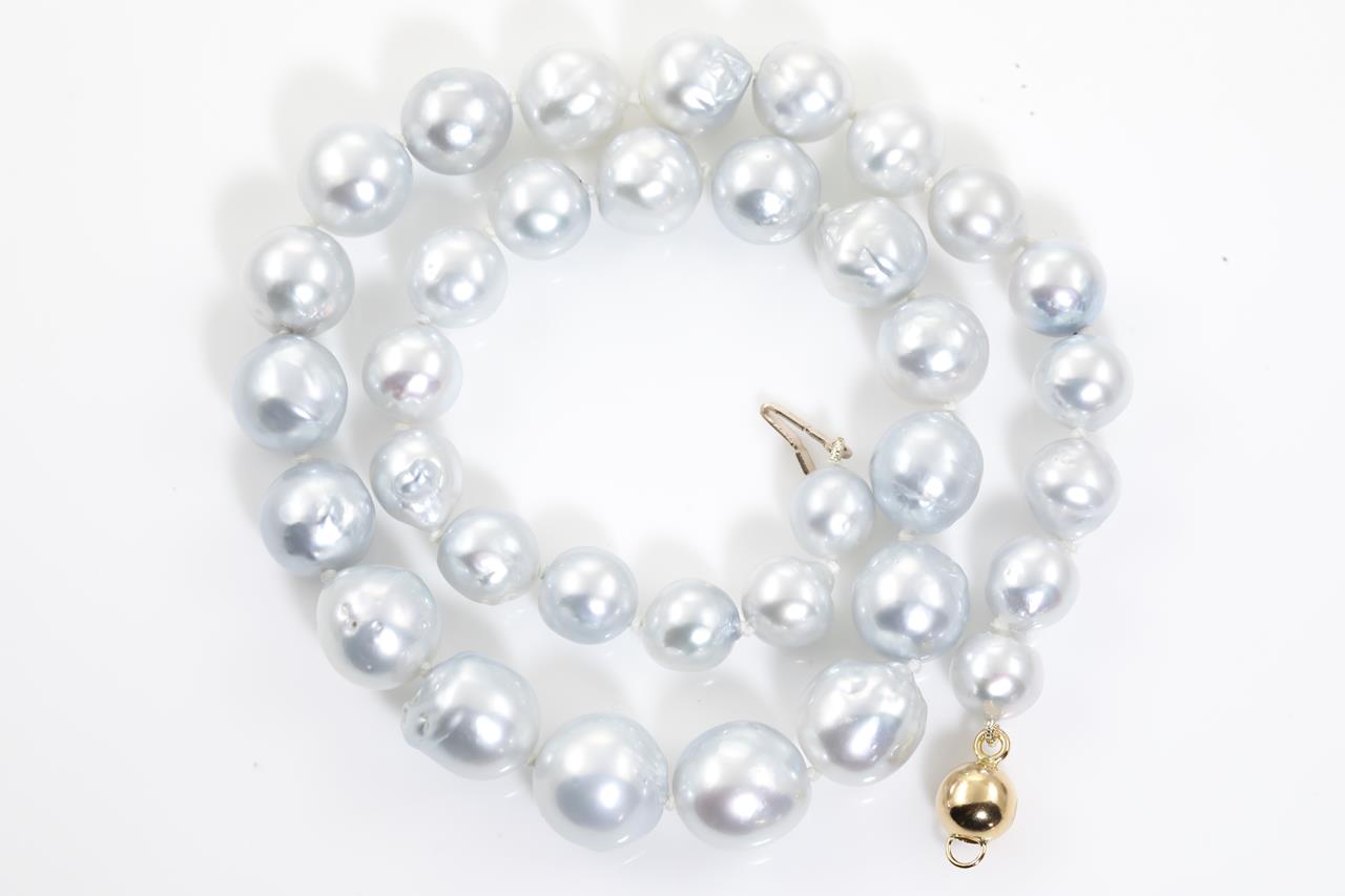 Pearl necklace with 35 graduated silver Australian South Sea pearls of 12.6-8.7mm. With 18ct yellow gold clasp. Length: 54cm. Weight: 64.9g. (New)