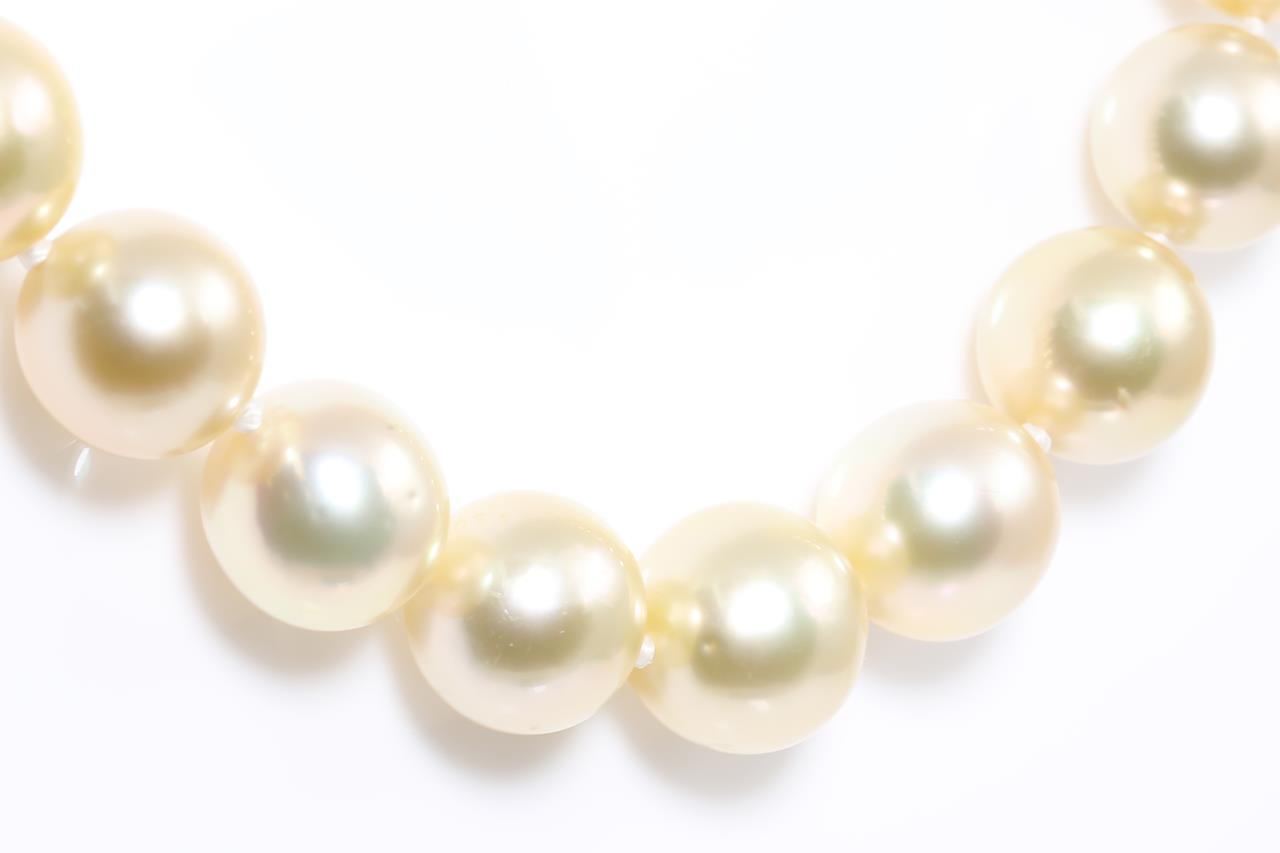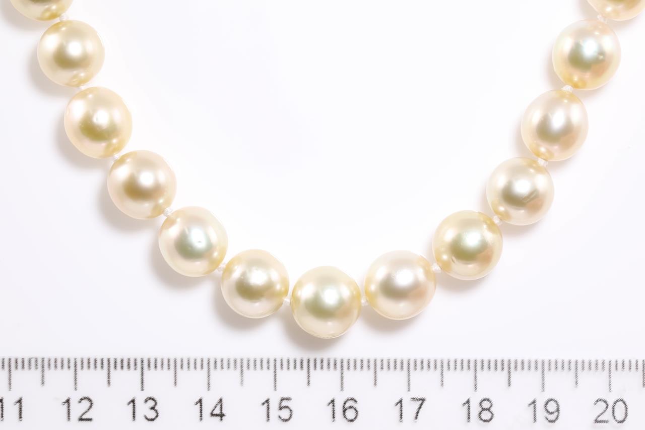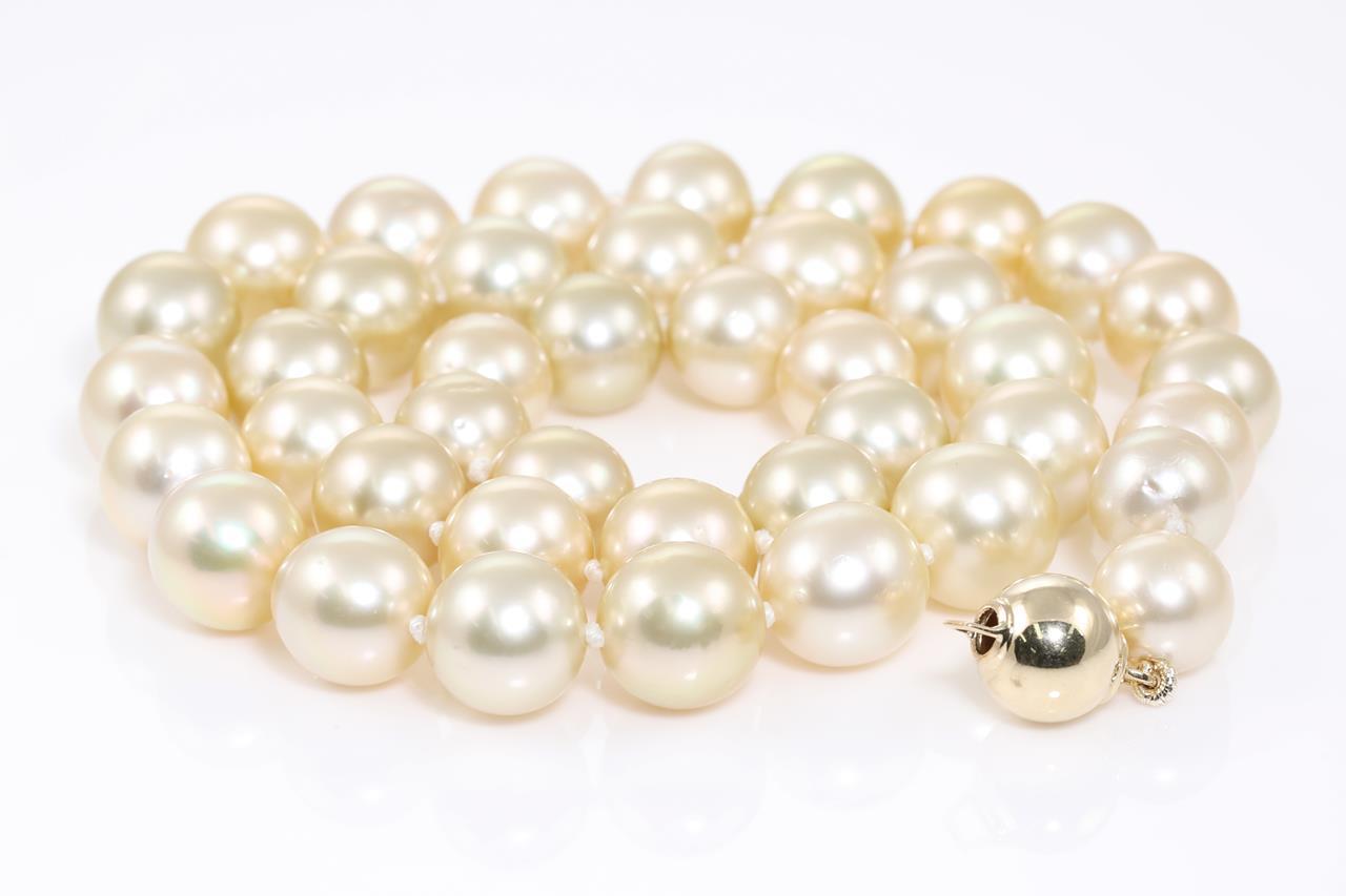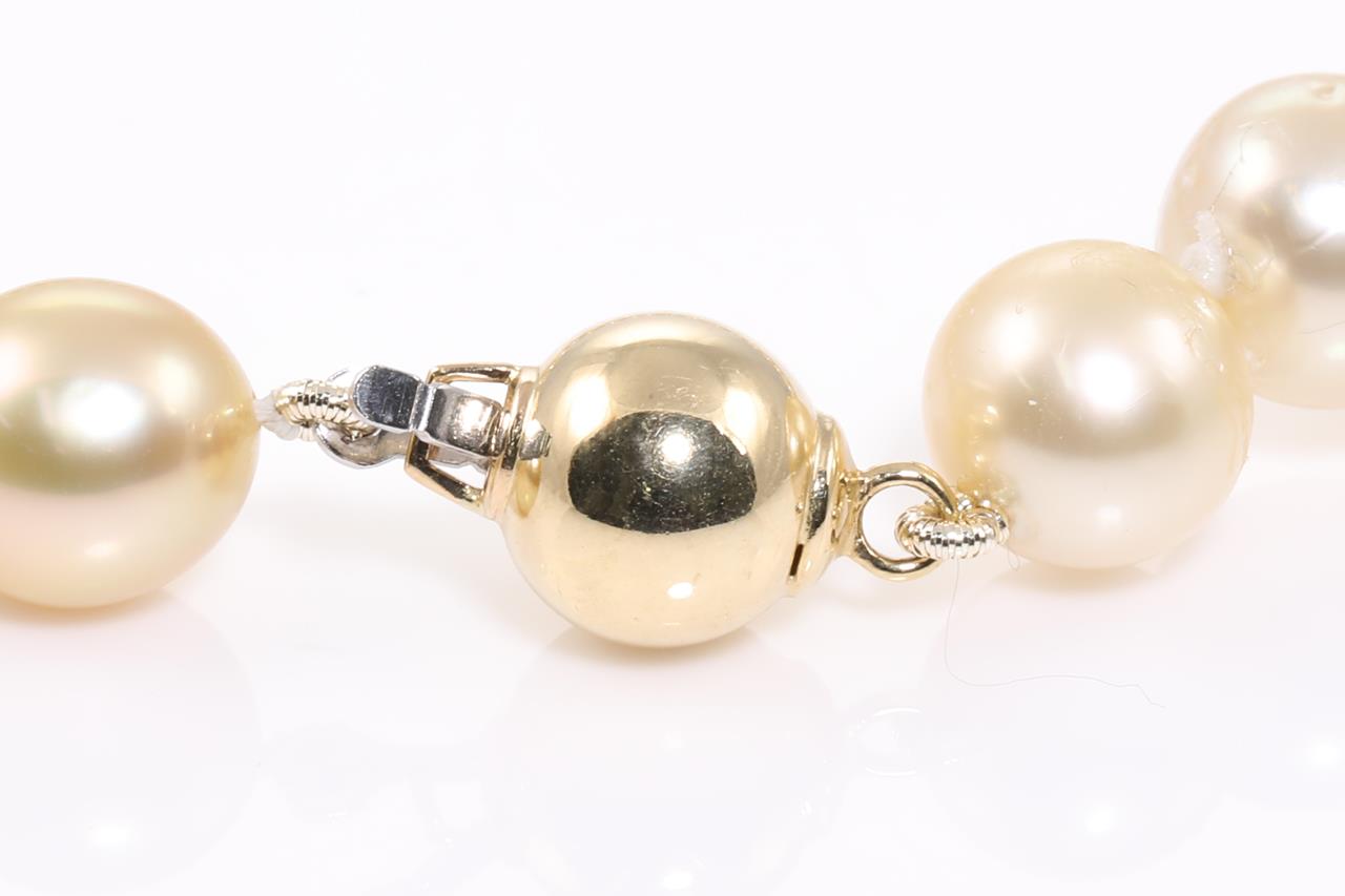 Pearl necklace with 41 slightly graduated golden South Sea pearls of 10.9-9.0mm. With 18ct yellow gold clasp. Length: 46cm. Weight: 58.0g. (New)
