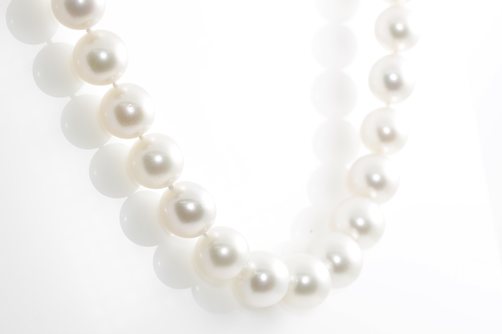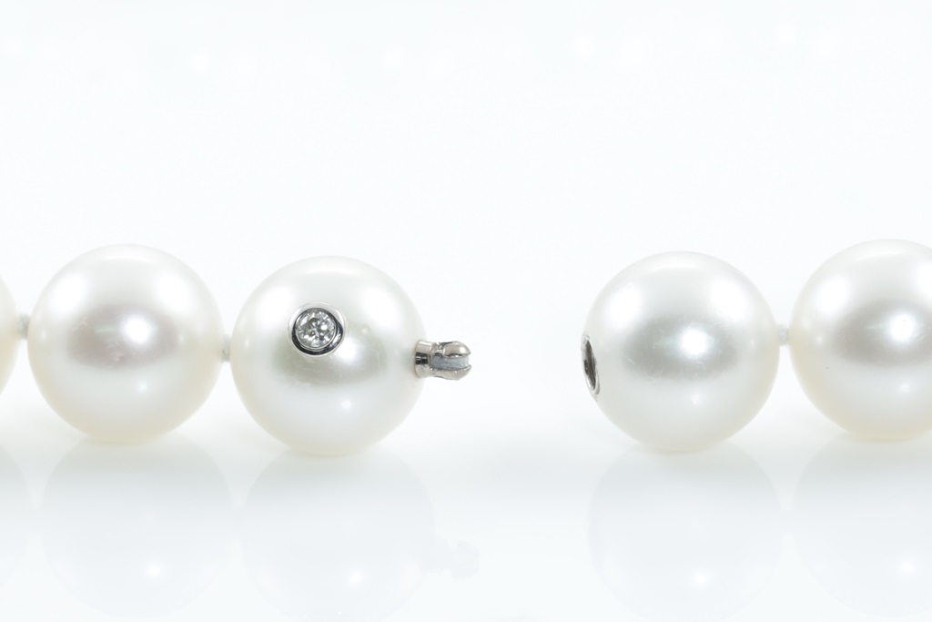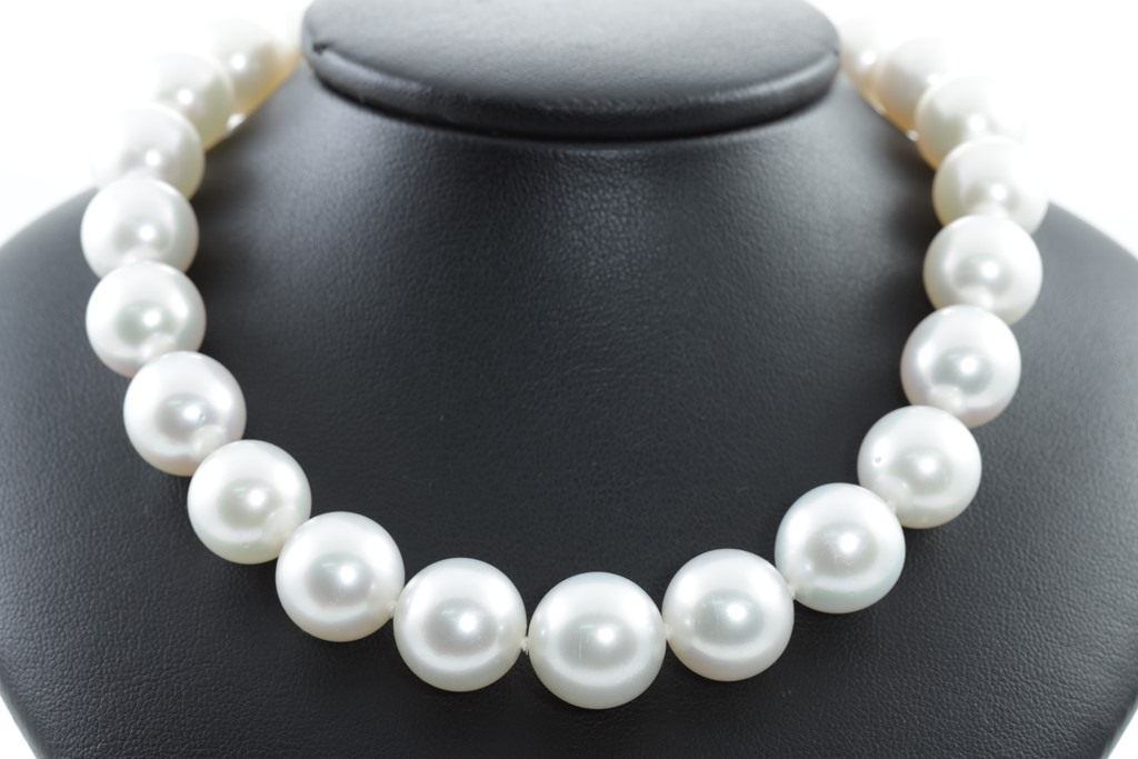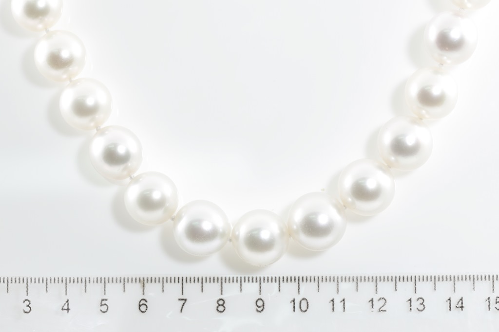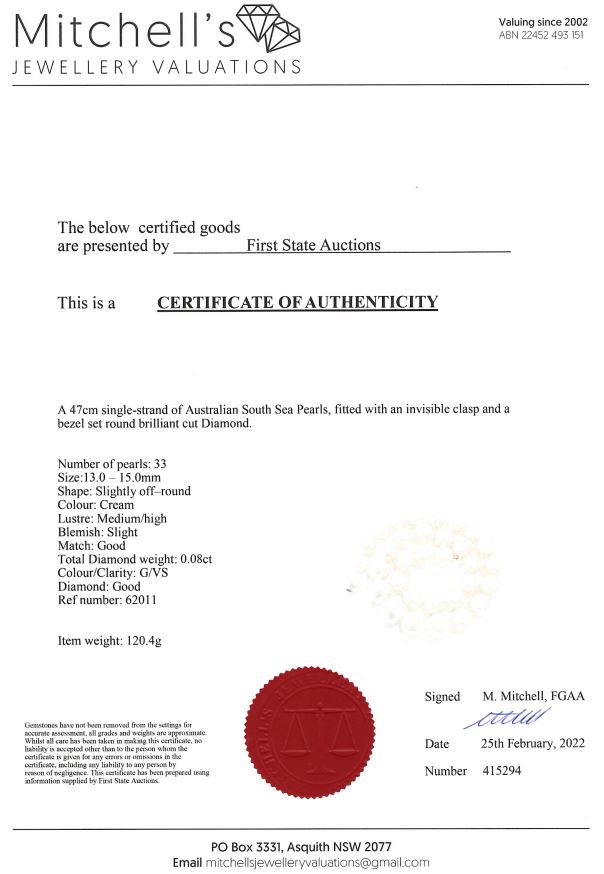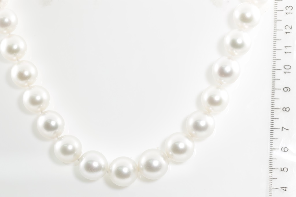 Pearl necklace with Australia South Sea Pearls of 13mm - 15mm. 18ct white gold invisible clasp set with single round Diamond of approximately 0.08ct. Length 47cm. Weight 120.4g. With Cerificate #415294. (New)