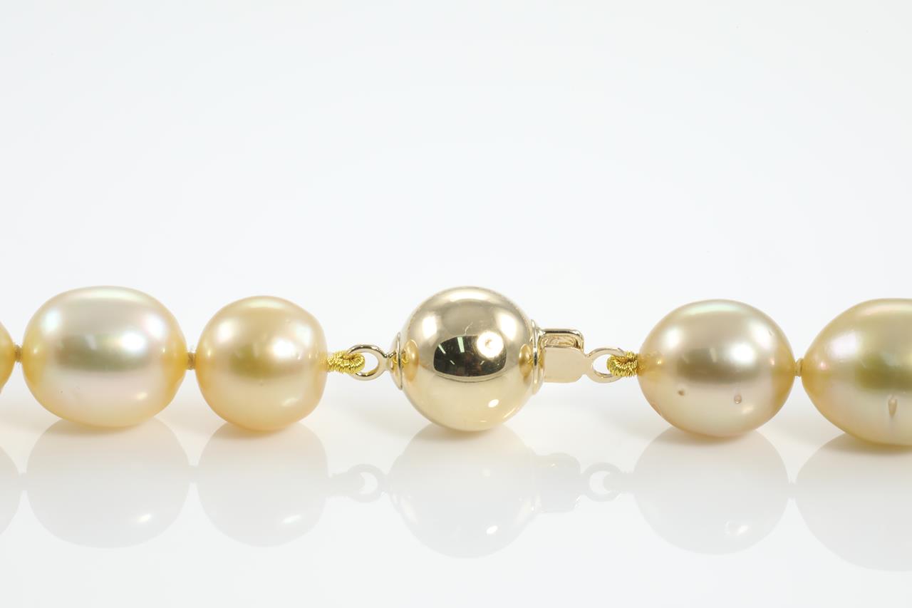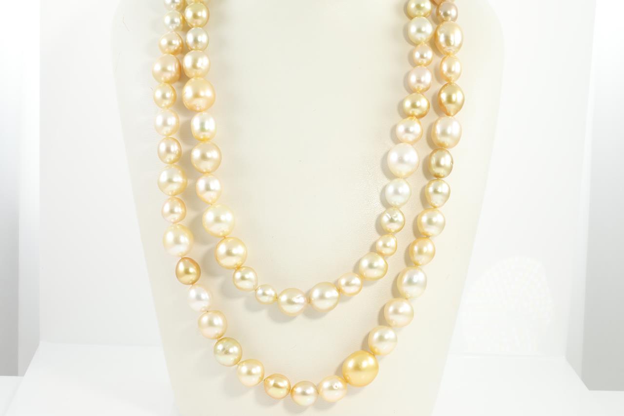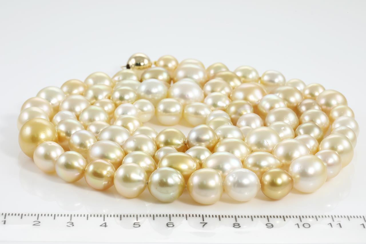 Pearl rope necklace with 85 light gold and golden South Sea Pearls of 13.5mm - 8.0mm. 14ct yellow gold clasp. Length: 103cm. Weight: 162.3g (New)