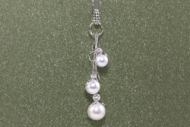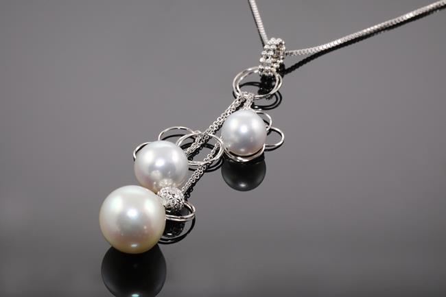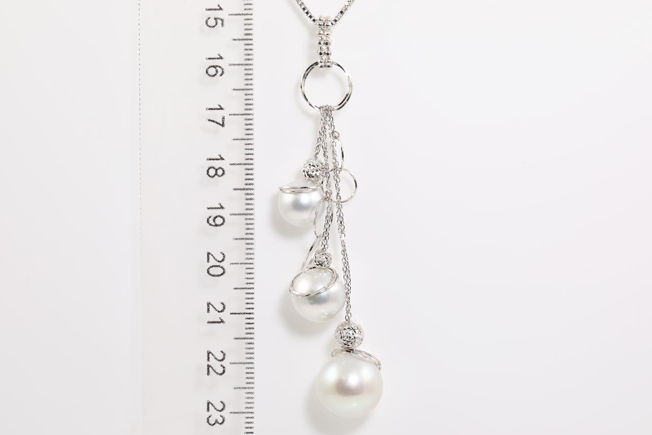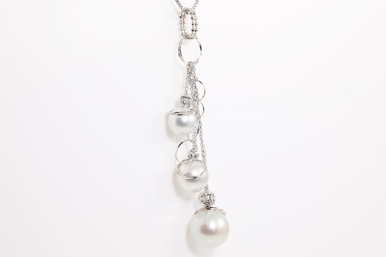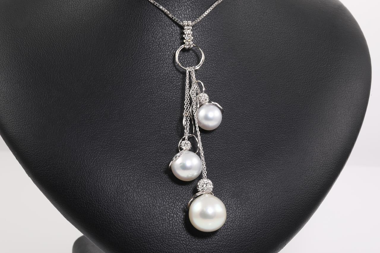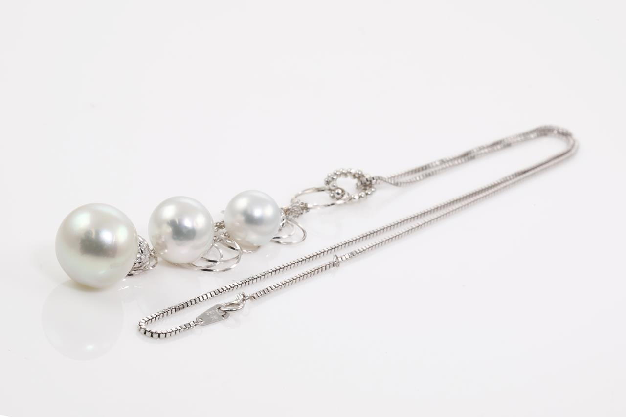 Pearl pendant with 3 South Sea Pearls of 9.5mm-13.0mm. 18ct white gold with adjustable 40cm chain. Weight: 10.8g. (Pre-owned)