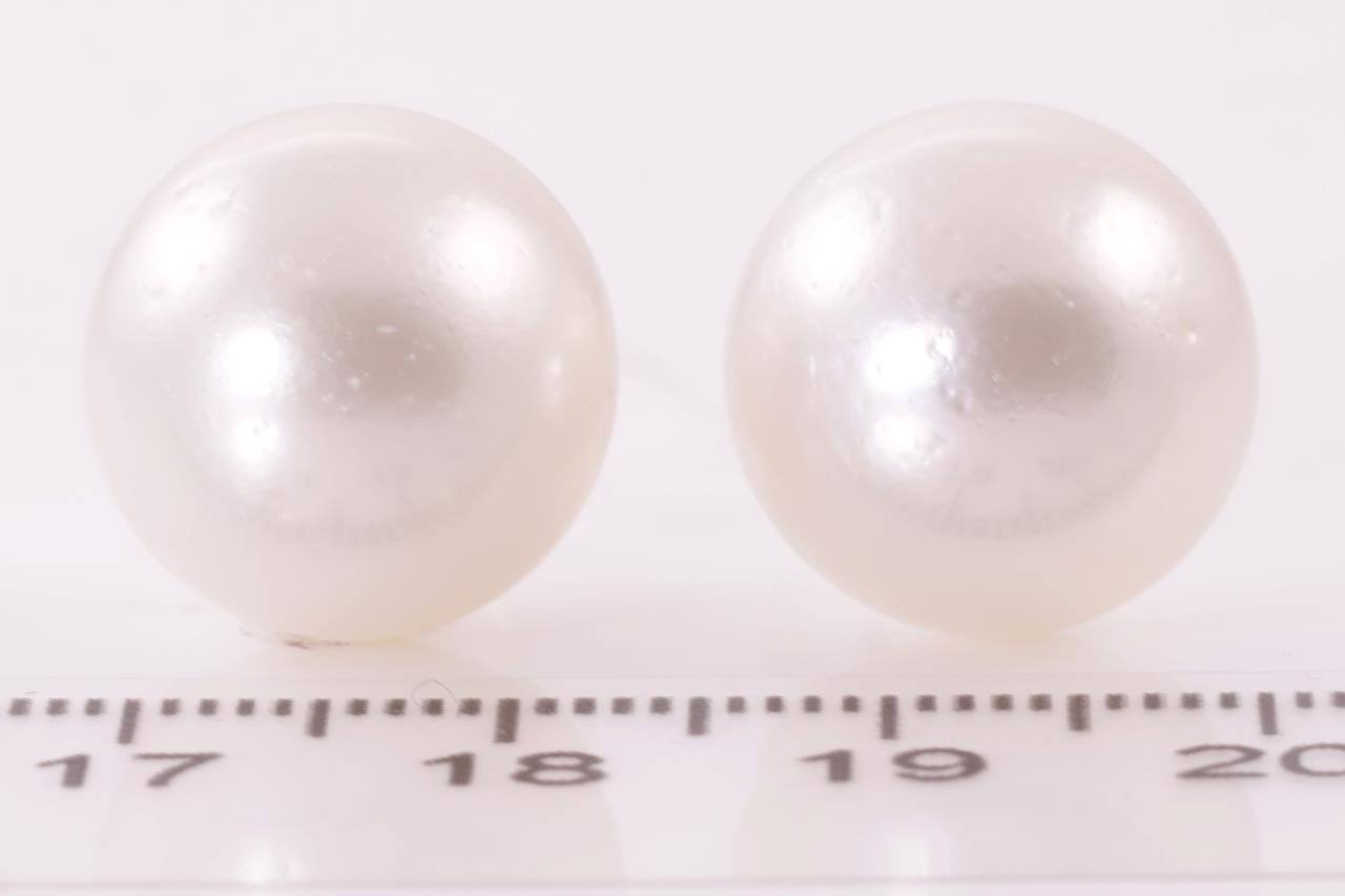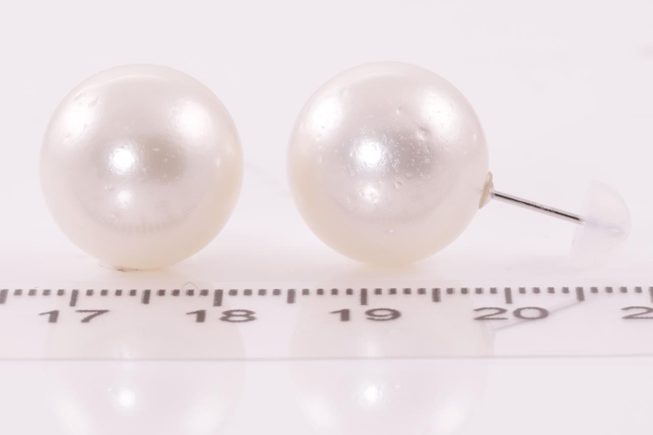 Pearl stud earrings with white South Sea Pearls of 14.4mm - 14.5mm. 14ct white gold with silicon backs. Weight: 9g. (Pre-owned)