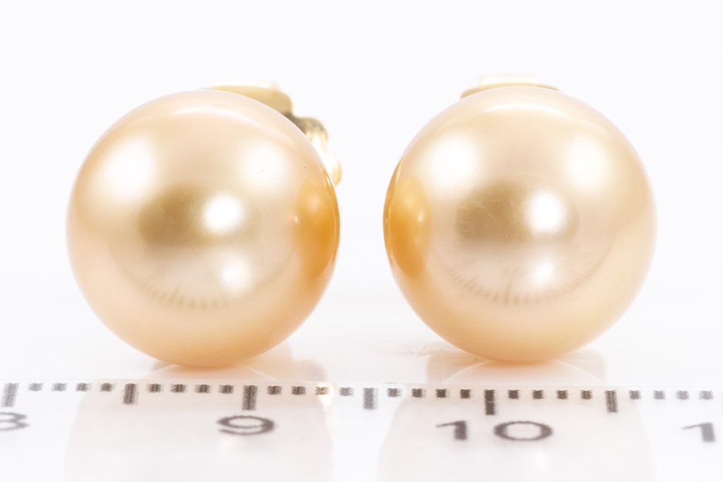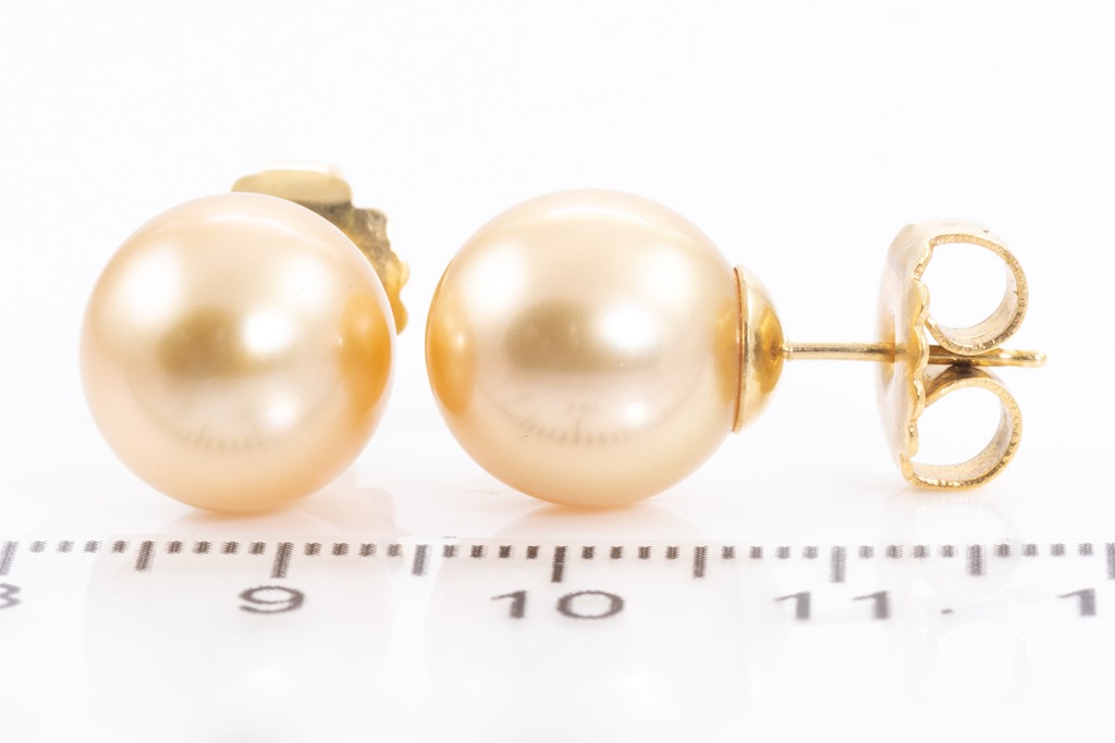 Pear stud earrings with golden South Sea Pear of 11.5-12mm. 18ct yellow gold. Weight 6.7g. (As New)