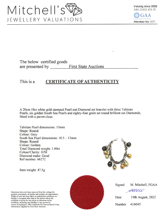 Charm bracelet with 3 Tahitian Pearls of 13.0mm and 6 golden South Sea Pearls of 10.5-13.0mm and round Diamonds totalling 1.00cts (Estimated grading: H-SI). Length: 20cm. 18ct white gold. Weight: 47.5g. With Certificate #416045. (pre-owned)