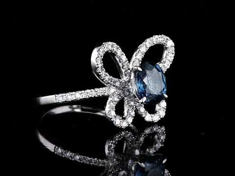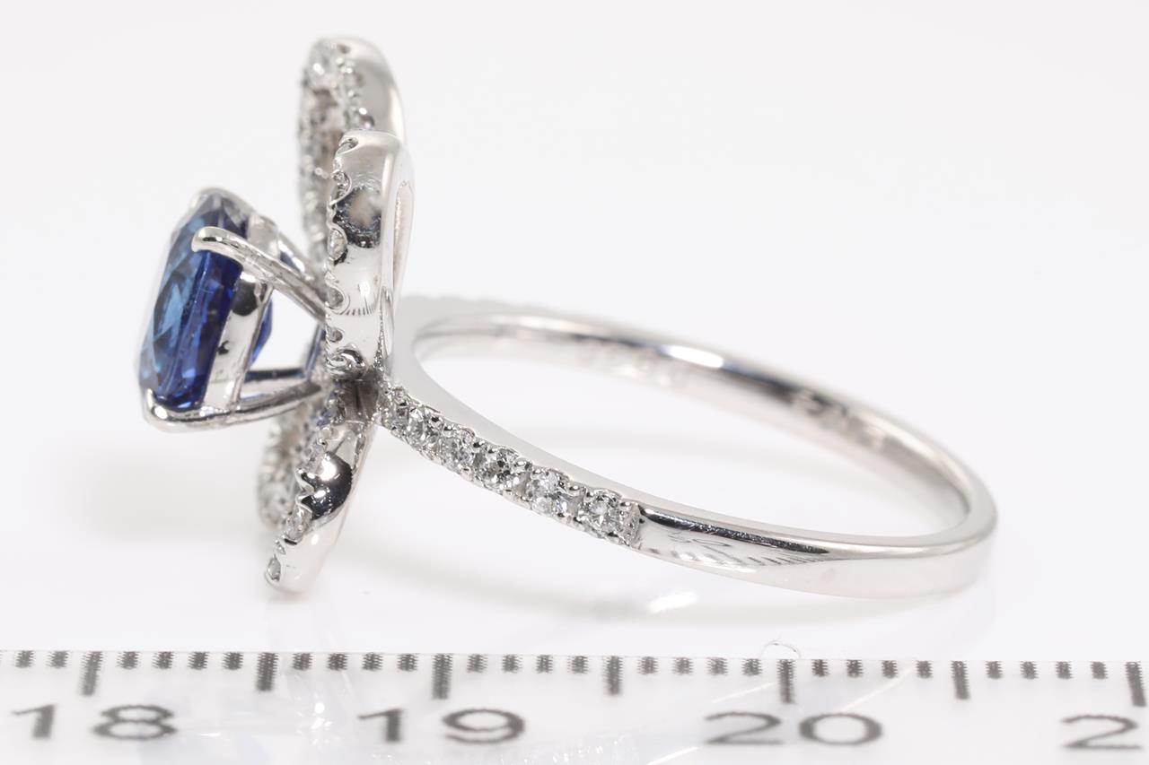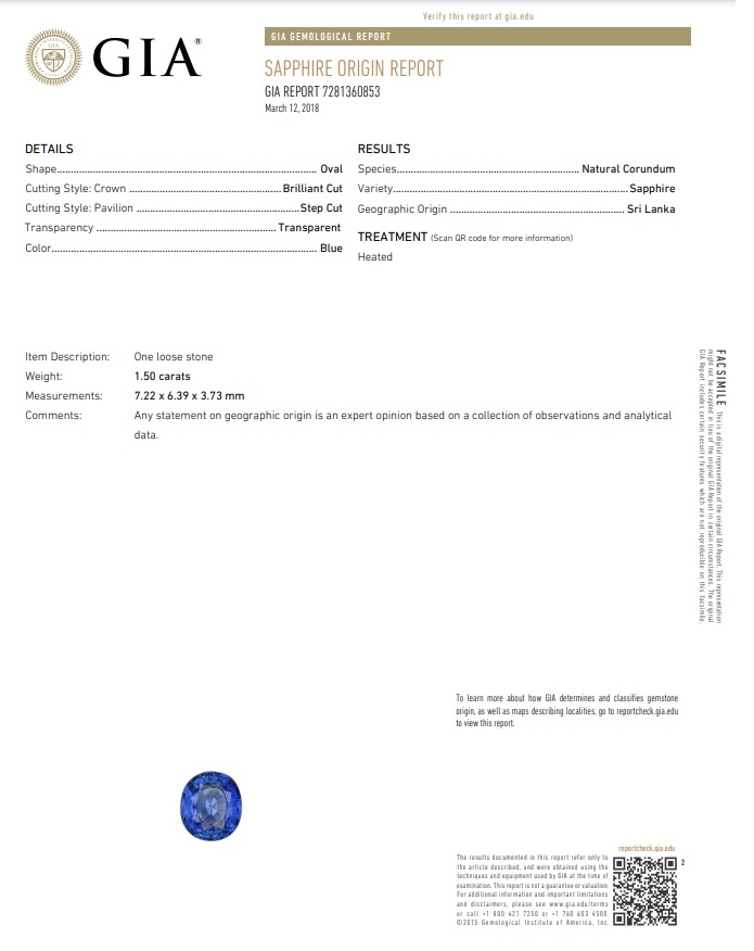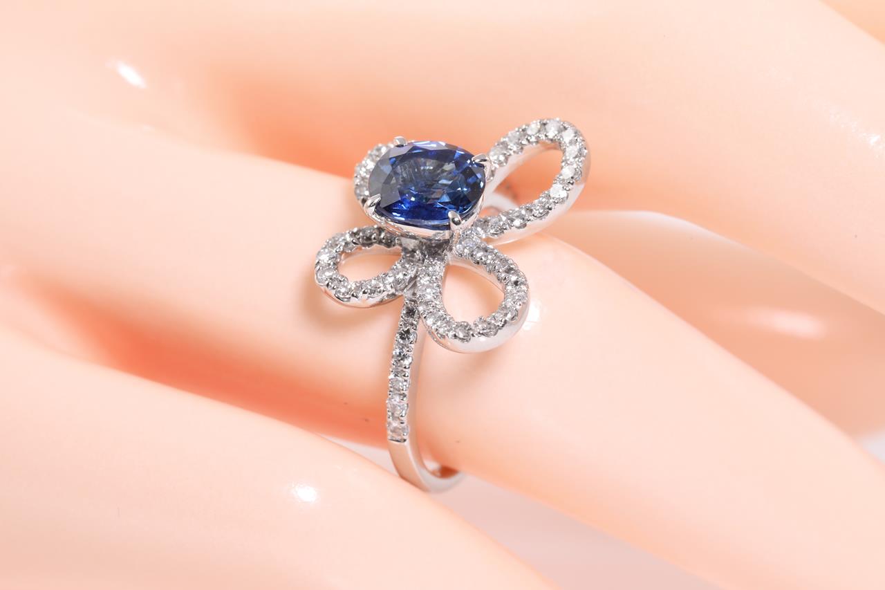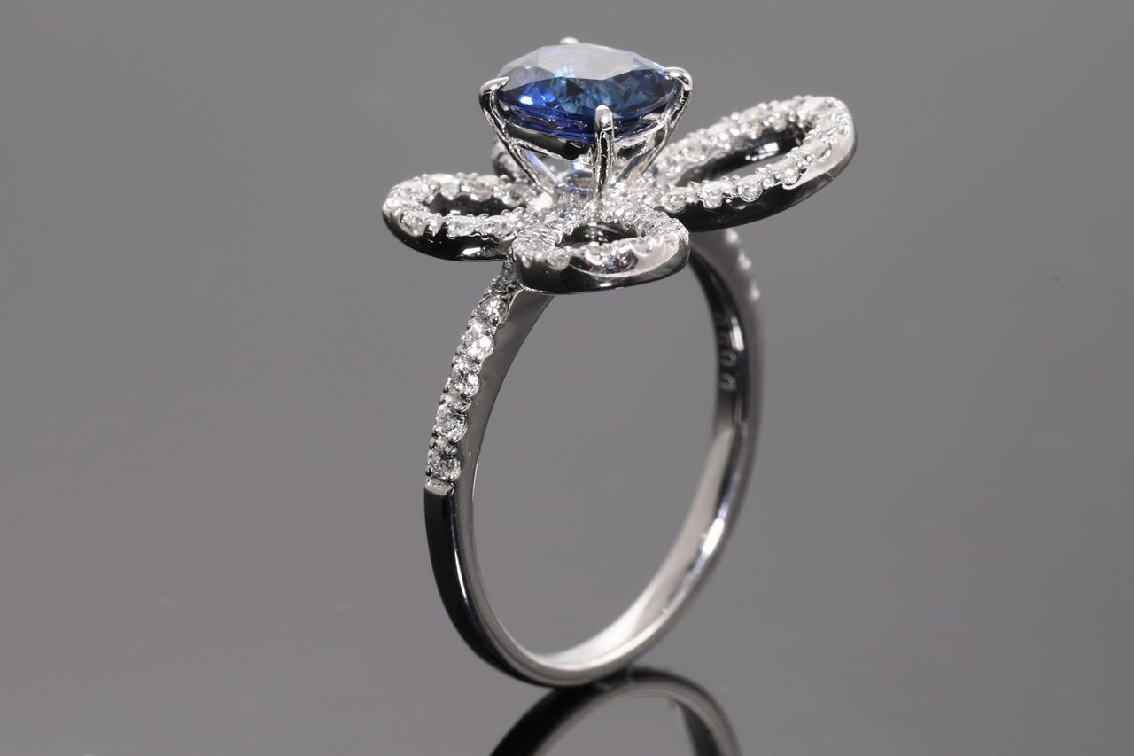 Sapphire and Diamond ring with an oval blue Sri Lankan Sapphire of 1.50ct (With GIA report #7281360853) and Diamonds totalling 0.58cts (Estimated grading: H P1). Platinum. Ring size M1/2 - can be resized 3 sizes up, down by ring clip only. Weight: 6.2g. (Pre-owned)
