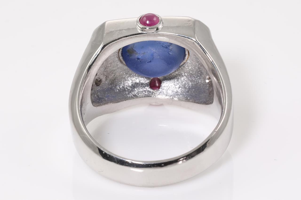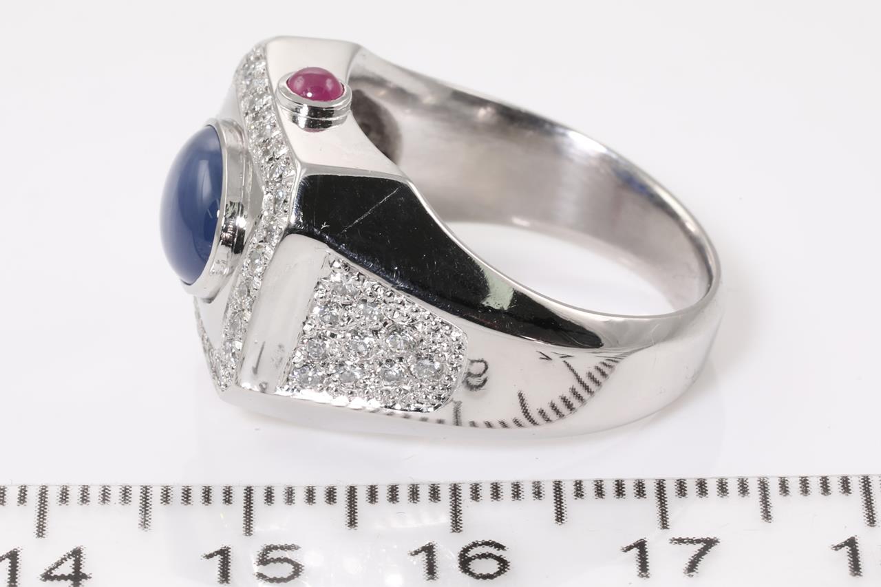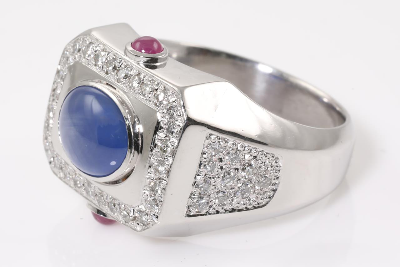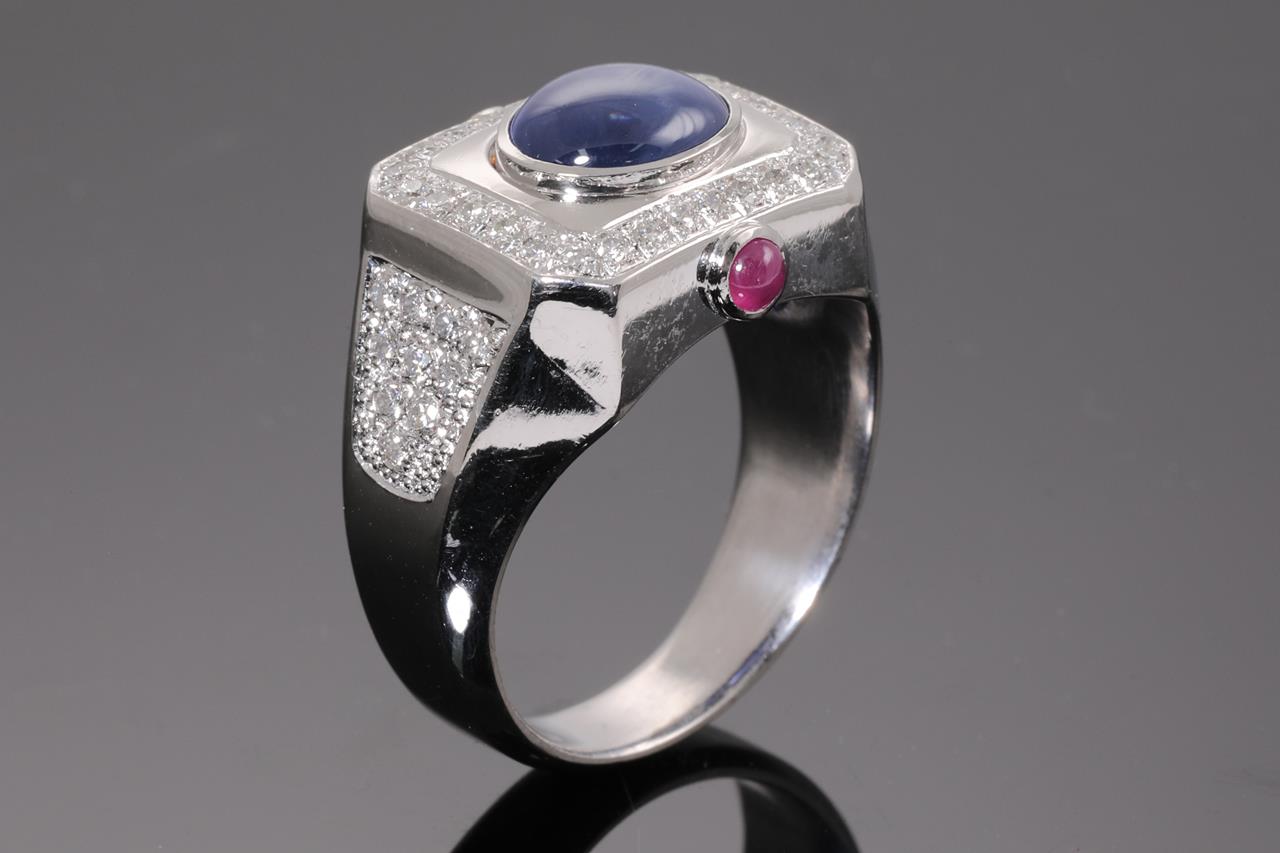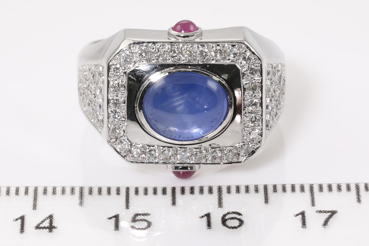 Mens ring with Star Sapphire of 5.94ct, 2 cabochon cut Rubies and Diamonds totalling 0.43cts (Estimated grading: G SI). Platinum. Ring size S - ring resizing is not recommend. Weight: 26.1g. With certificate #26.1. (Pre-owned)