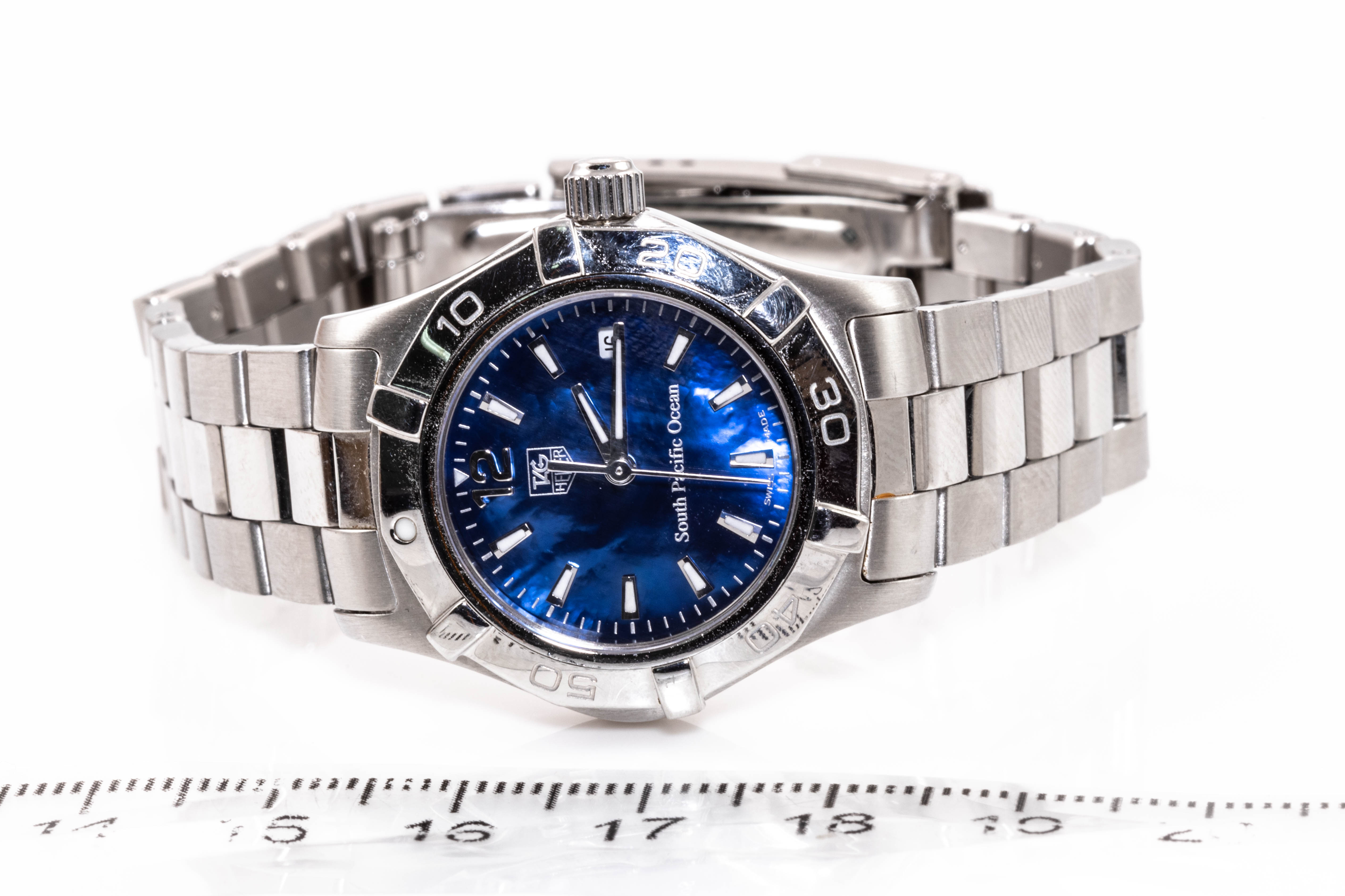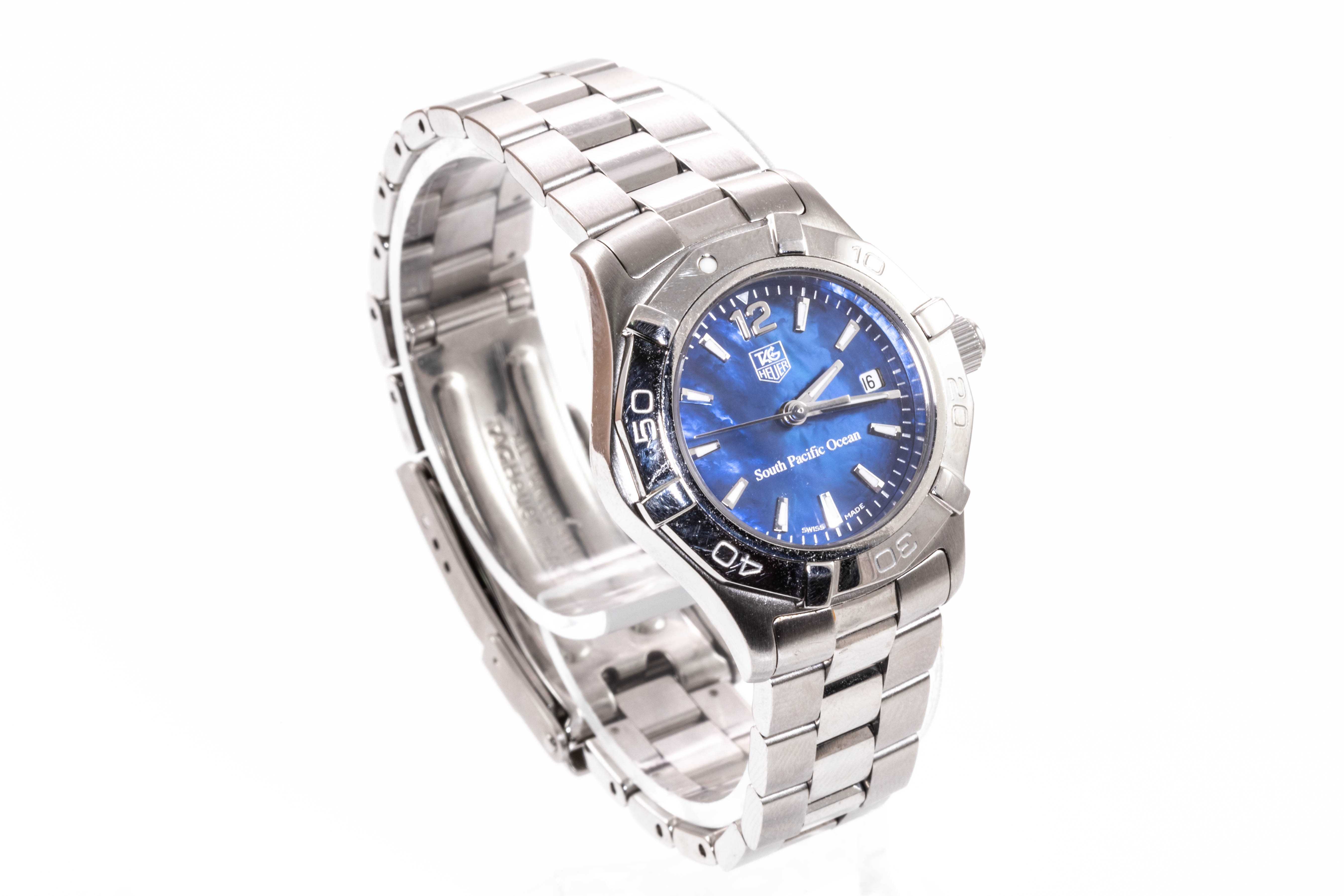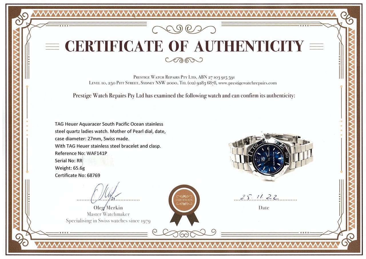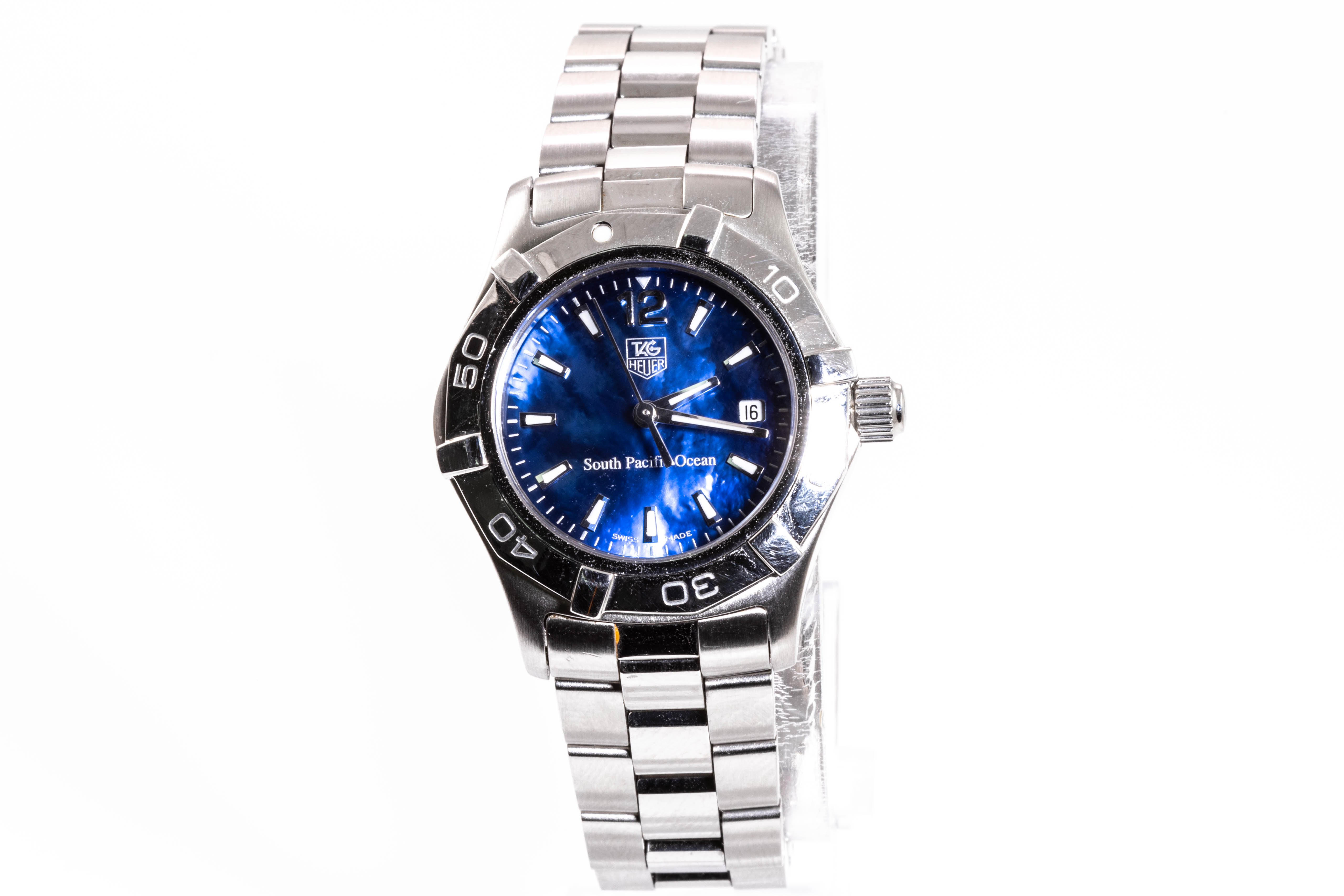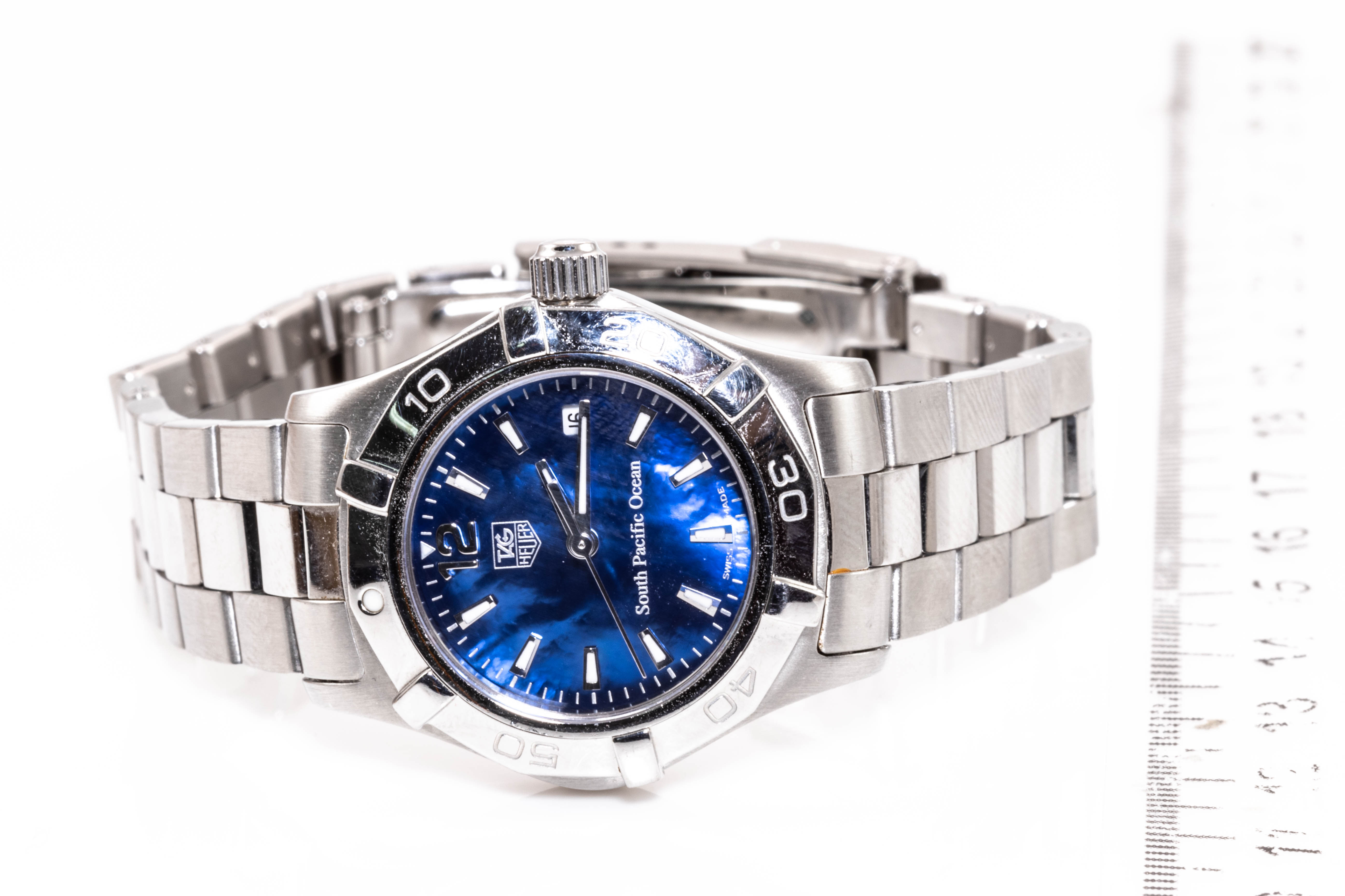 TAG Heuer Aquaracer South Pacific Ocean stainless steel quartz ladies watch. Mother of Pearl dial, date, case diameter: 27mm, wrist size: 15.5cm, Swiss made. Ref# WAF141P. With TAG Heuer stainless steel bracelet and clasp. With Certificate of Authenticity and TAG Heuer box. 3 month FSA warranty. (Pre-owned)