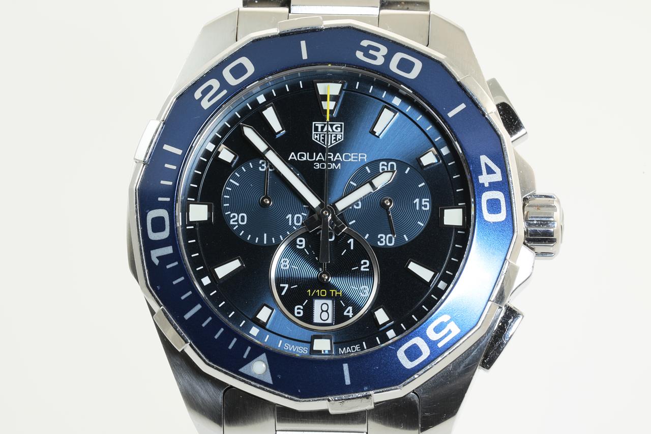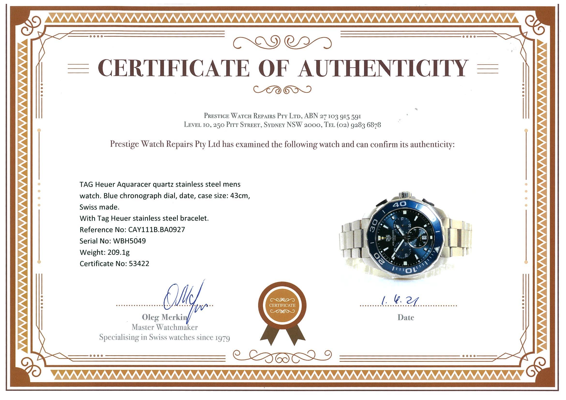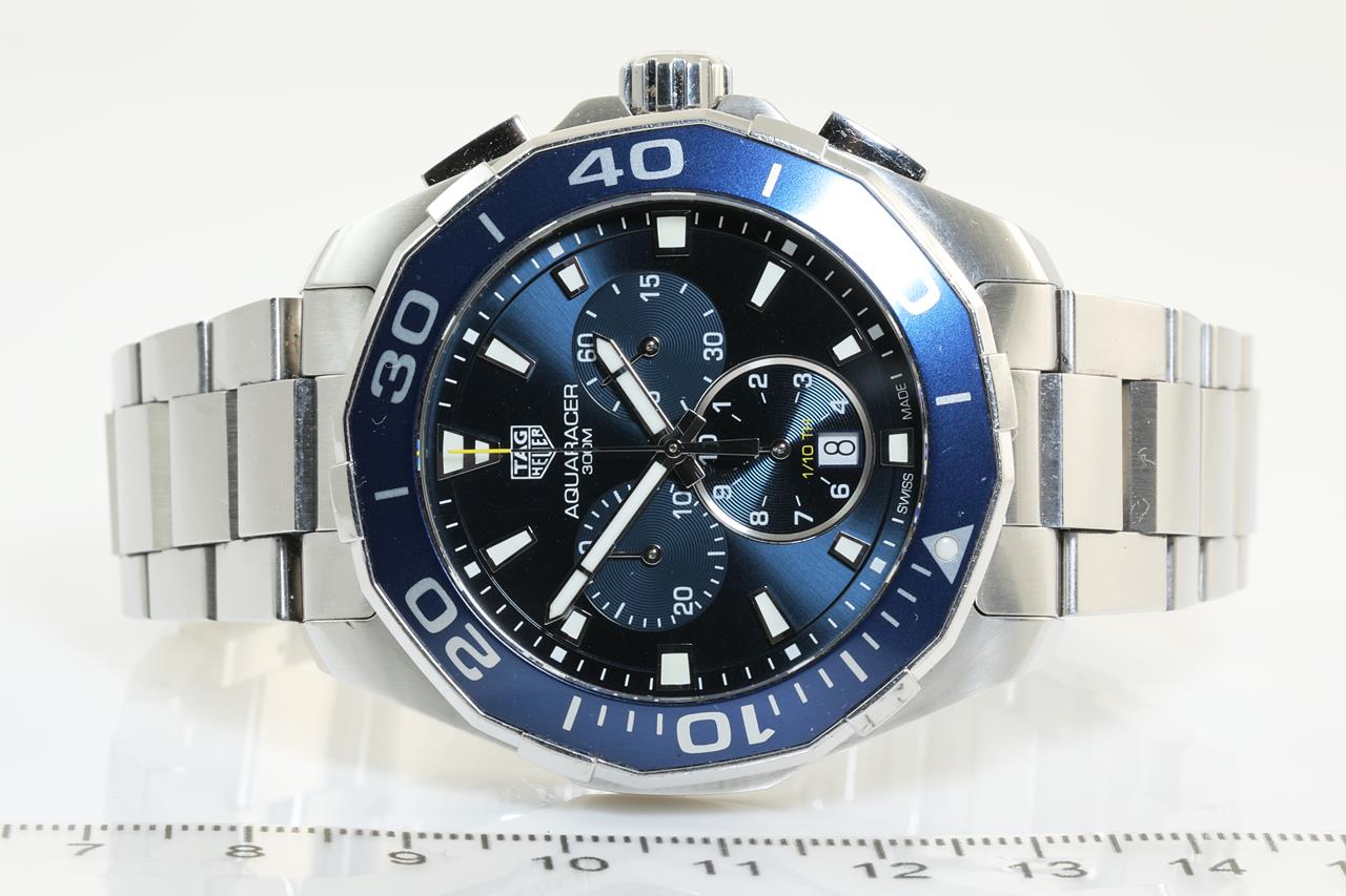 TAG Heuer Aquaracer quartz stainless steel mens watch. Blue chronograph dial, date, case size: 43cm, wrist size: 20.5cm, Swiss made. Ref# CAY111B.BA0927. With Tag Heuer stainless steel bracelet. With Certificate of Authenticity and Tag Heuer box. 3 month FSA warranty. (Pre-owned).