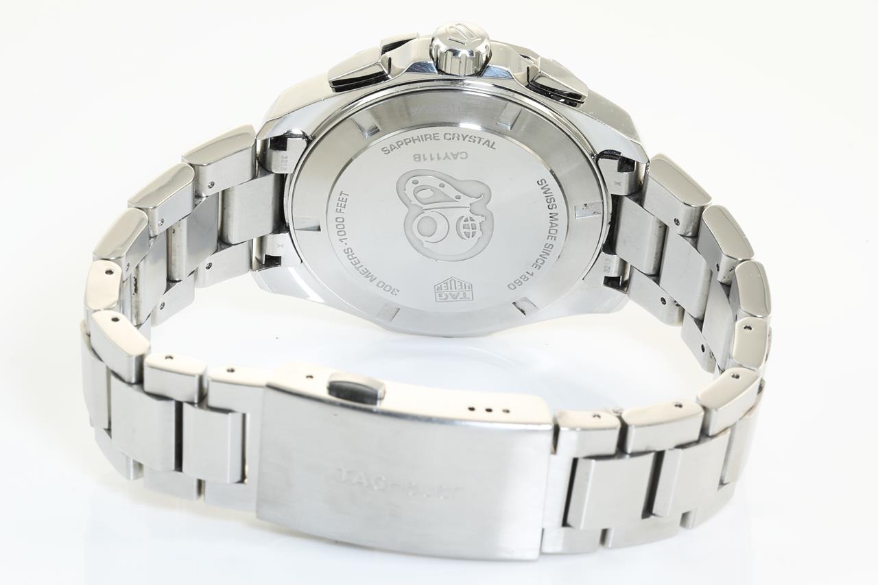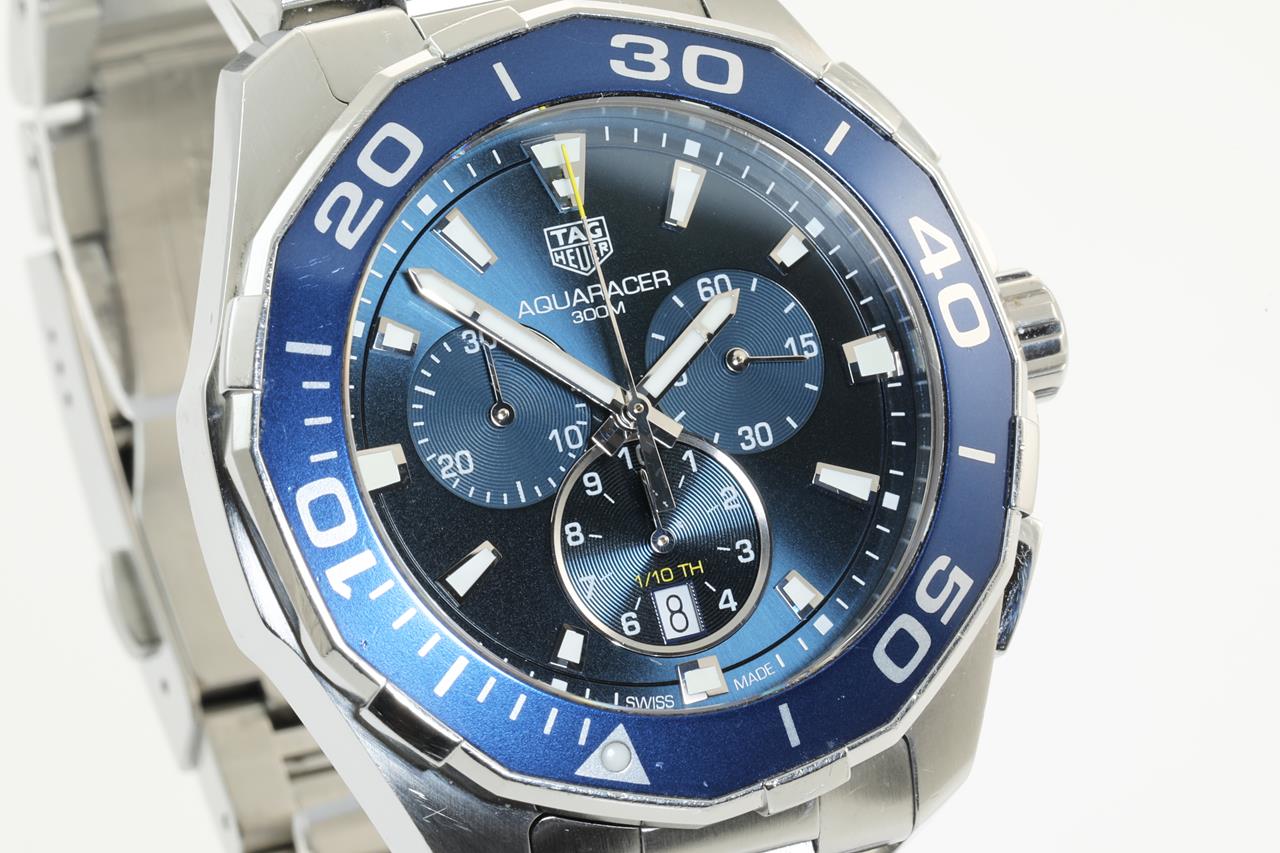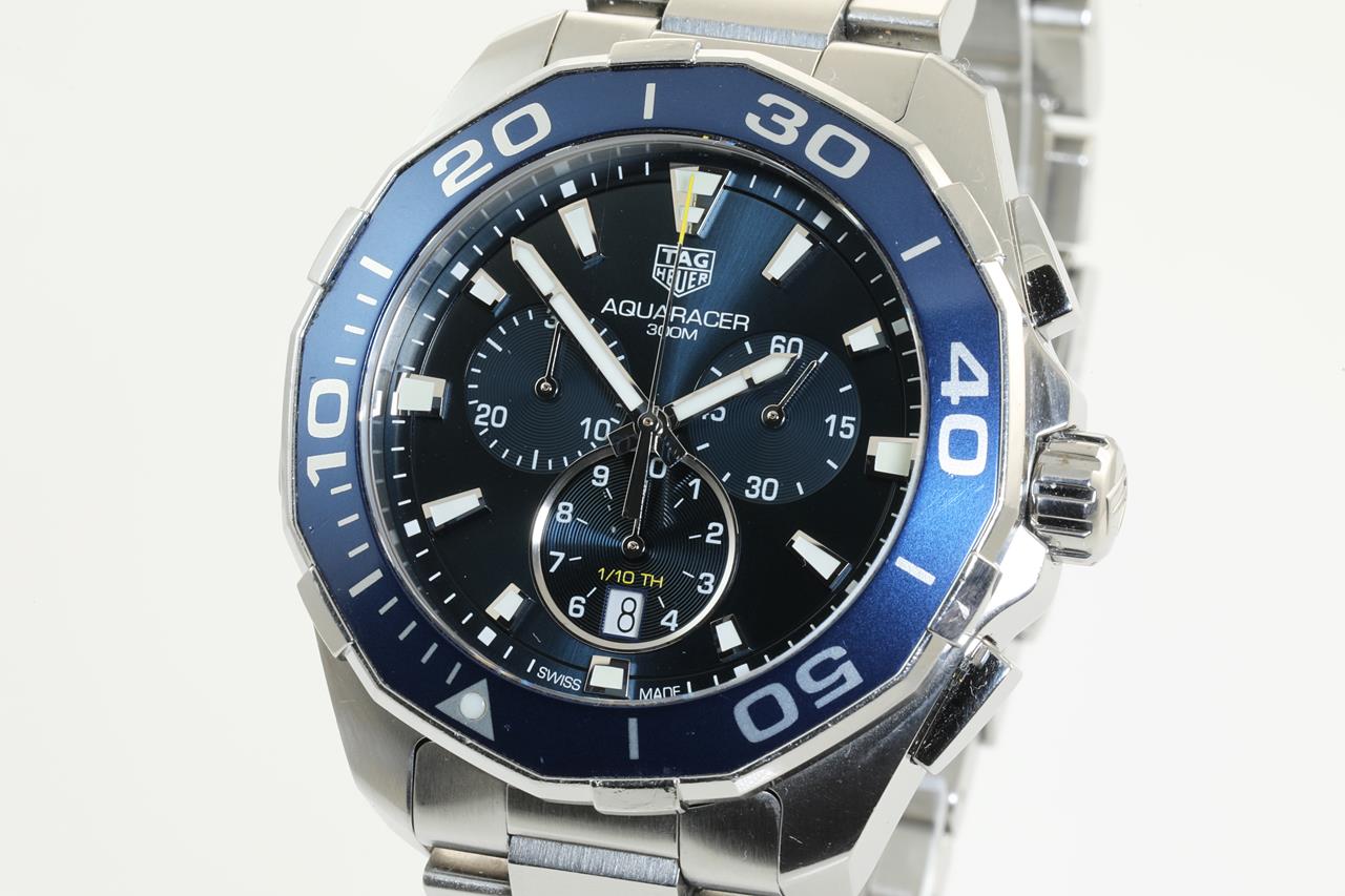 TAG Heuer Aquaracer quartz stainless steel mens watch. Blue chronograph dial, date, case size: 43cm, wrist size: 20.5cm, Swiss made. Ref# CAY111B.BA0927. With Tag Heuer stainless steel bracelet. With Certificate of Authenticity and Tag Heuer box. 3 month FSA warranty. (Pre-owned).
