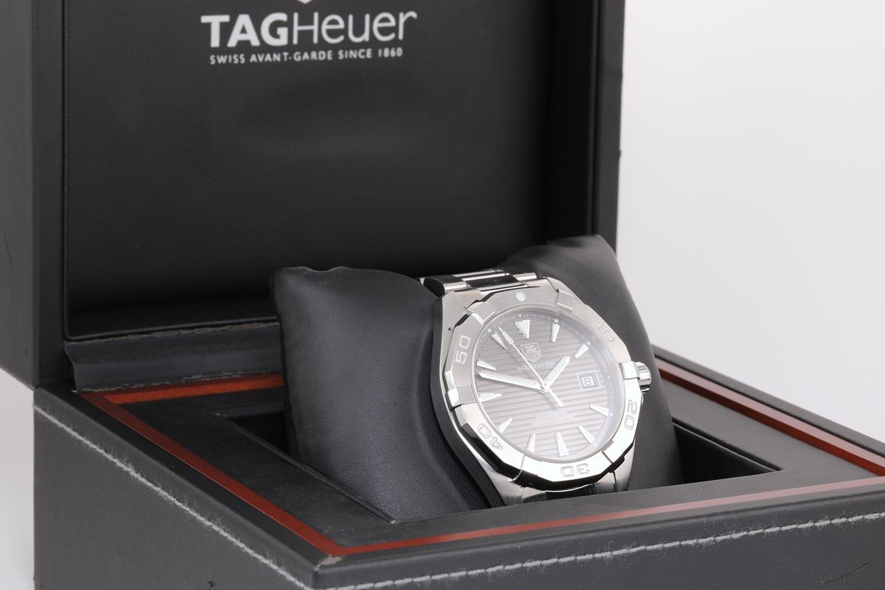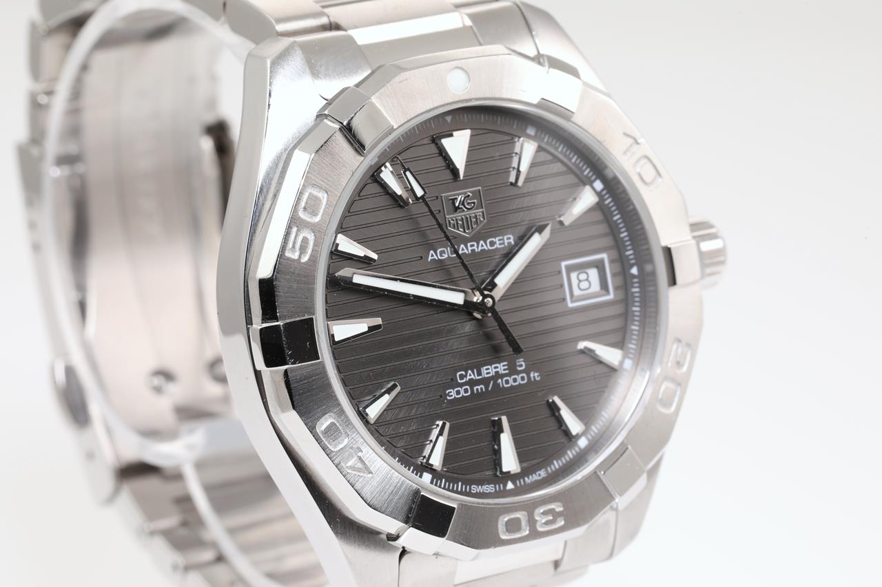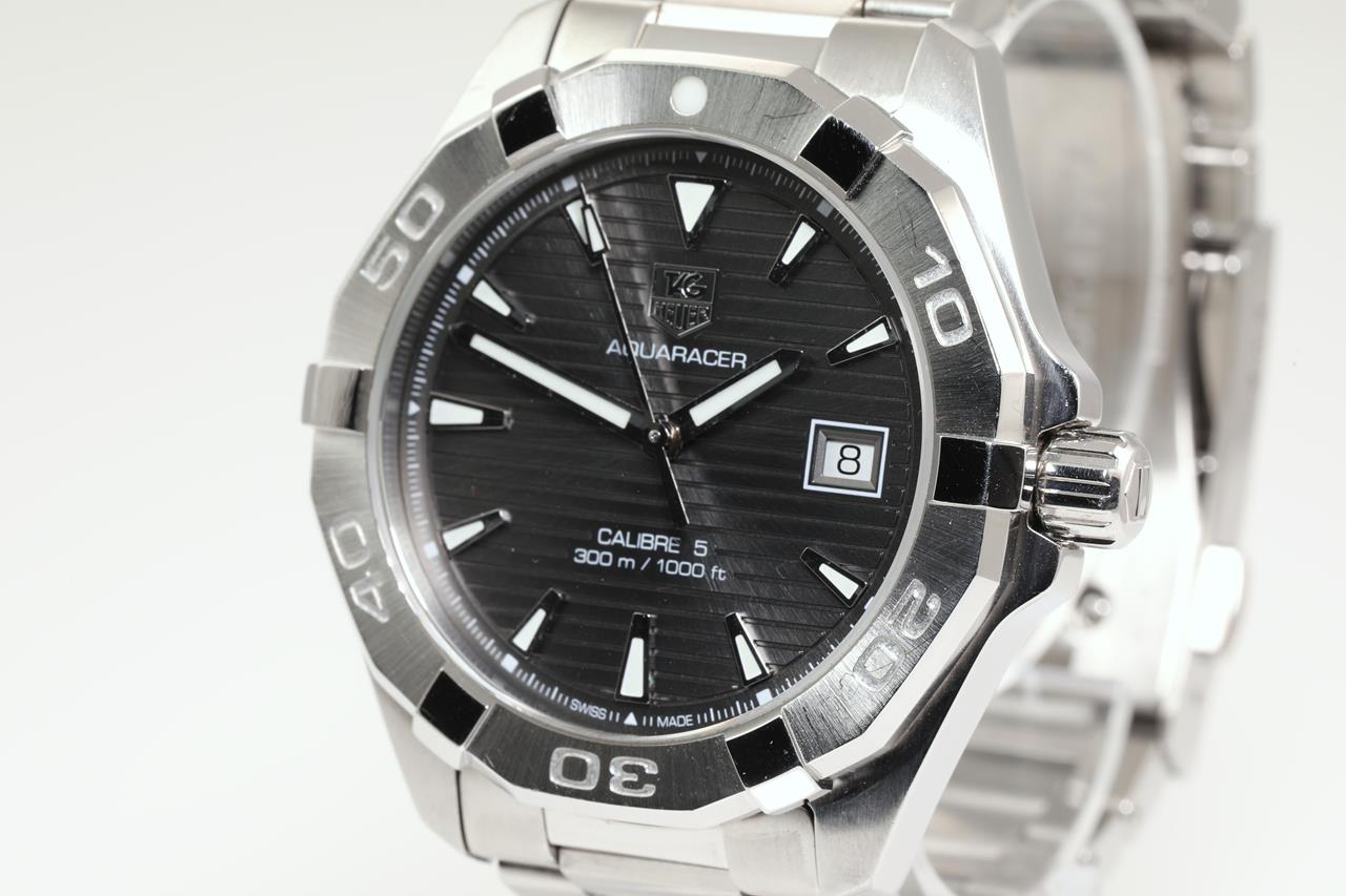 TAG Heuer Aquaracer stainless steel automatic mens watch. Grey dial, date, case diameter: 41mm, wrist size: 17cm, Swiss made. Ref# WAY2113-0. With TAG Heuer stainless steel bracelet and clasp. With certificate of authenticity and TAG Heuer box. 3 month FSA warranty. (Pre-owned)
