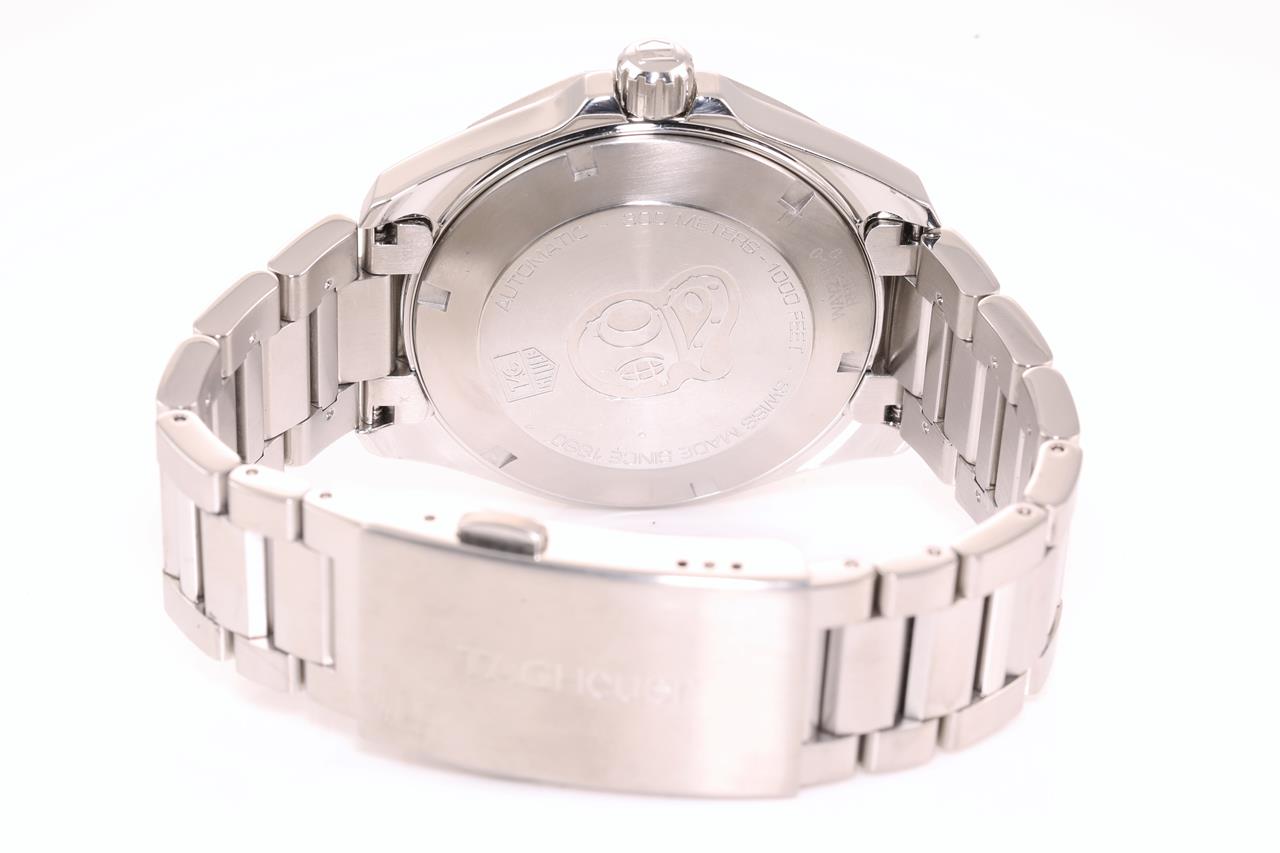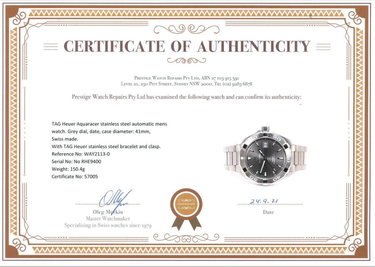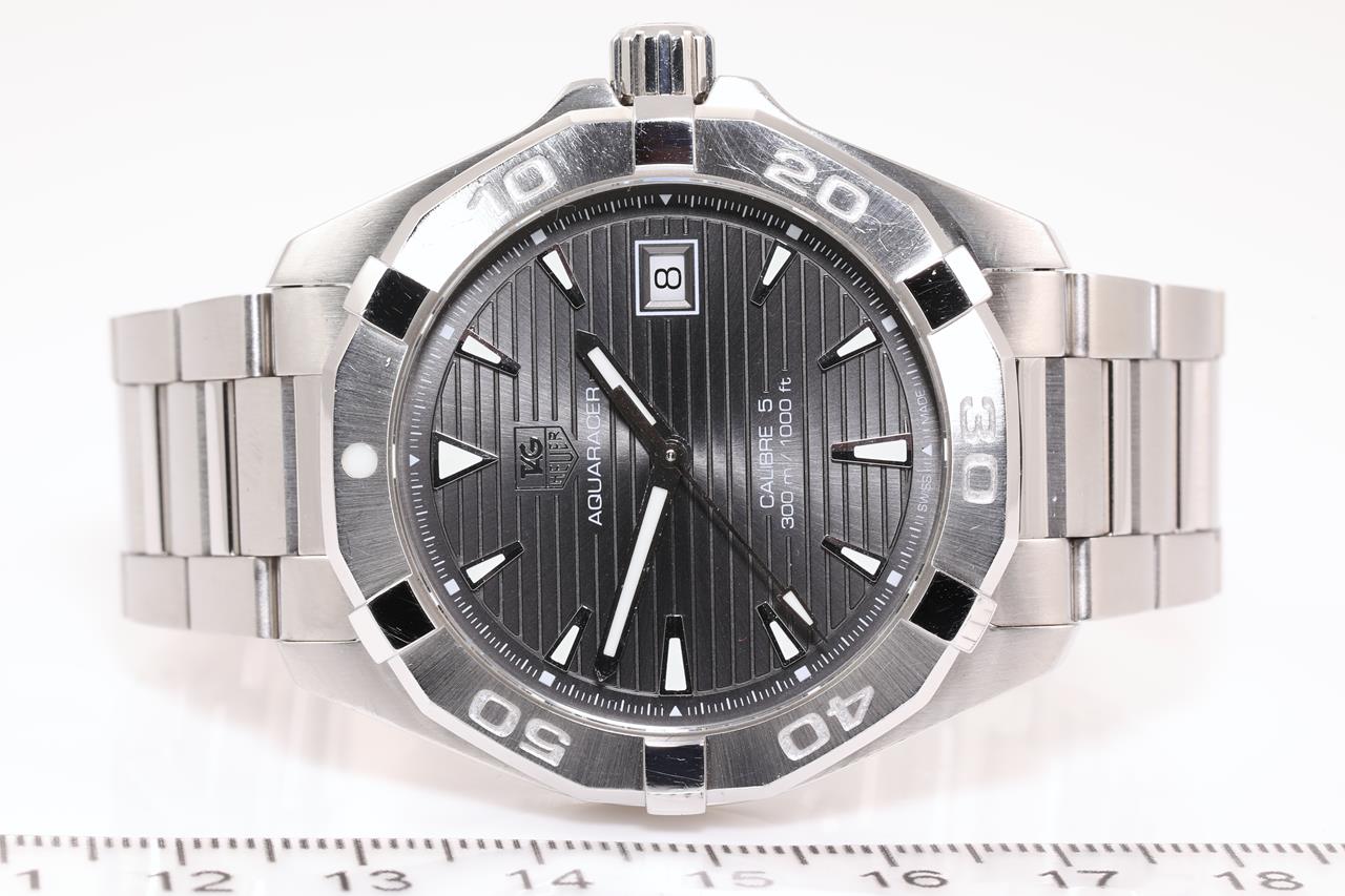 TAG Heuer Aquaracer stainless steel automatic mens watch. Grey dial, date, case diameter: 41mm, wrist size: 17cm, Swiss made. Ref# WAY2113-0. With TAG Heuer stainless steel bracelet and clasp. With certificate of authenticity and TAG Heuer box. 3 month FSA warranty. (Pre-owned)
