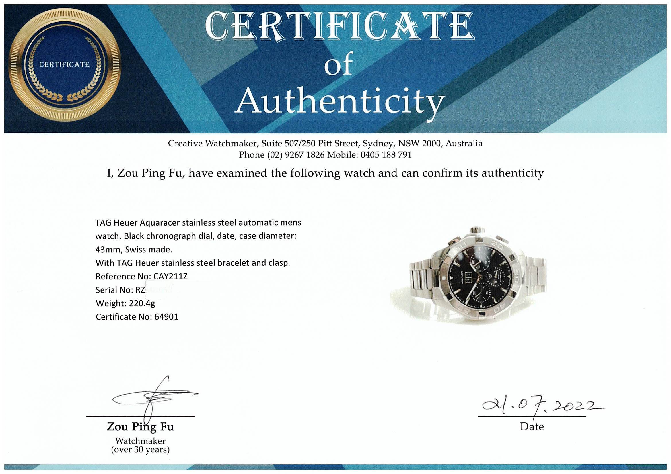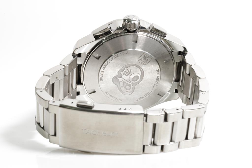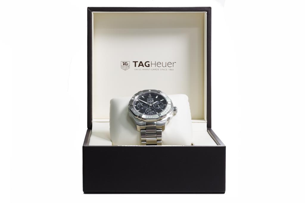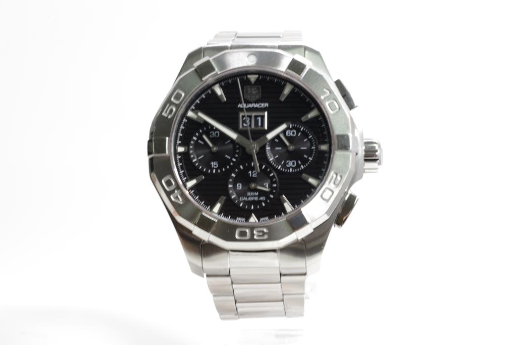 TAG Heuer Aquaracer stainless steel automatic mens watch. Black chronograph dial, date, case diameter: 43mm, wrist size: 18.5cm, Swiss made. Ref# CAY211Z. With TAG Heuer stainless steel bracelet and clasp. With Certificate of Authenticity and Tag Heuer box. 3 month FSA warranty. (Pre-owned)