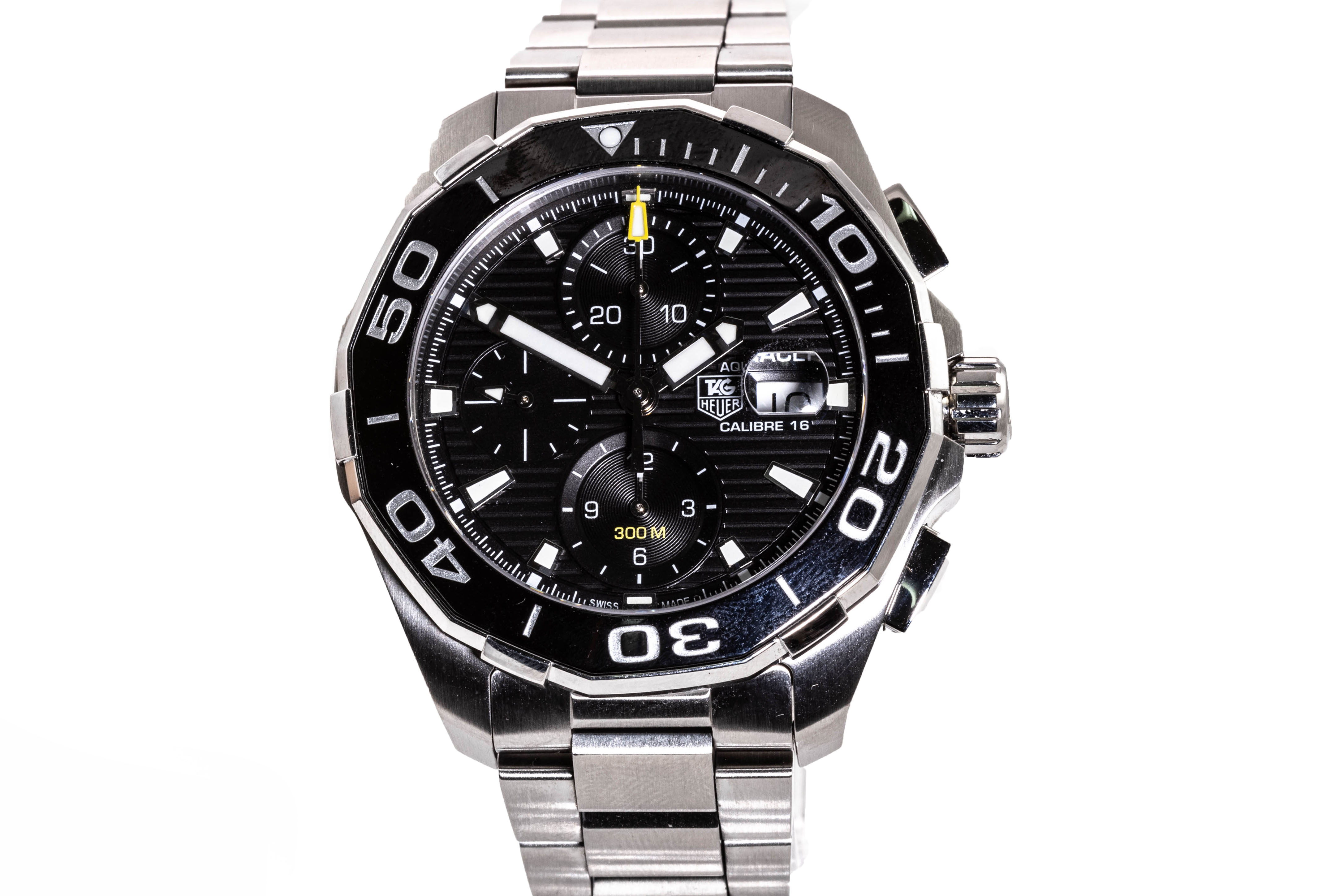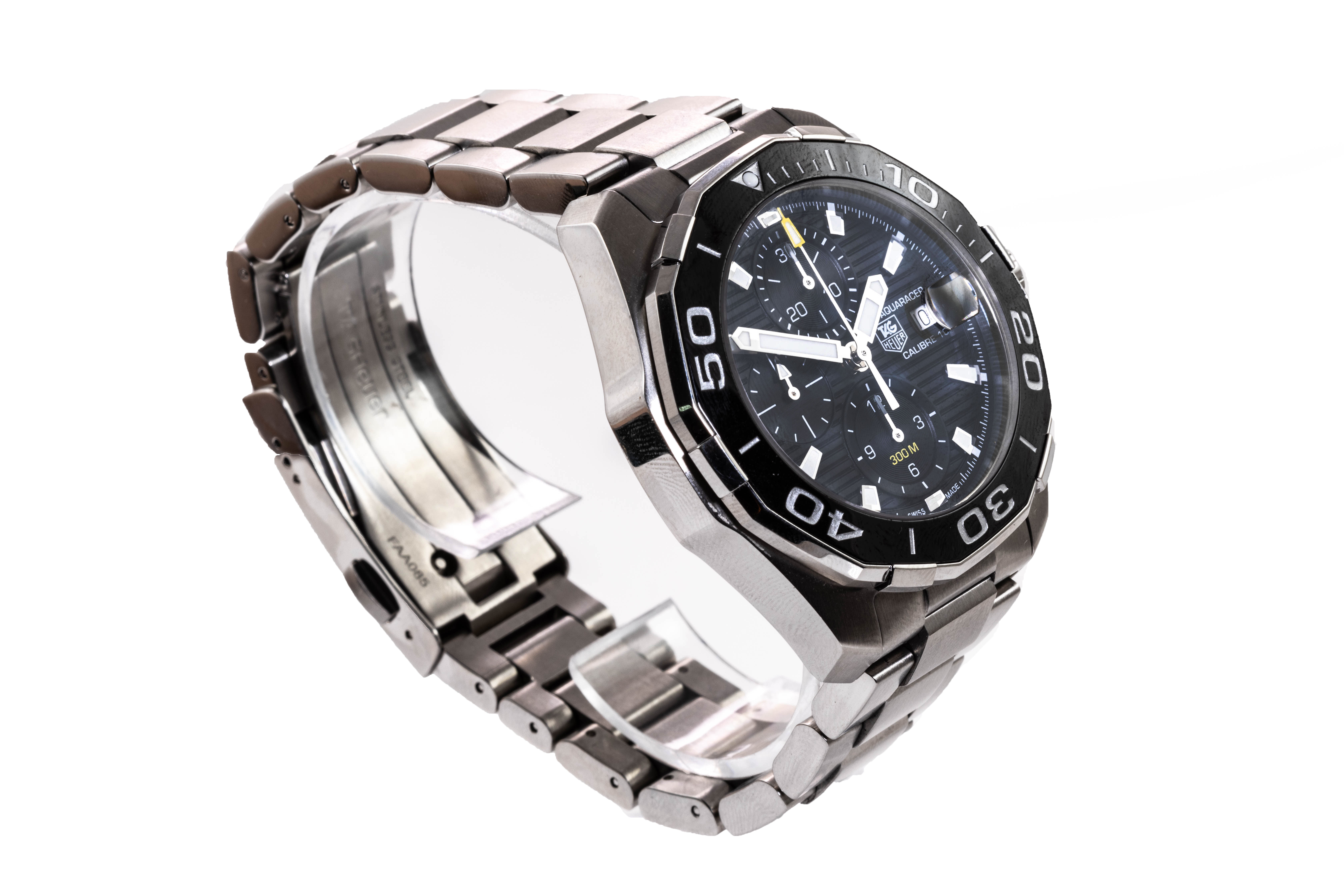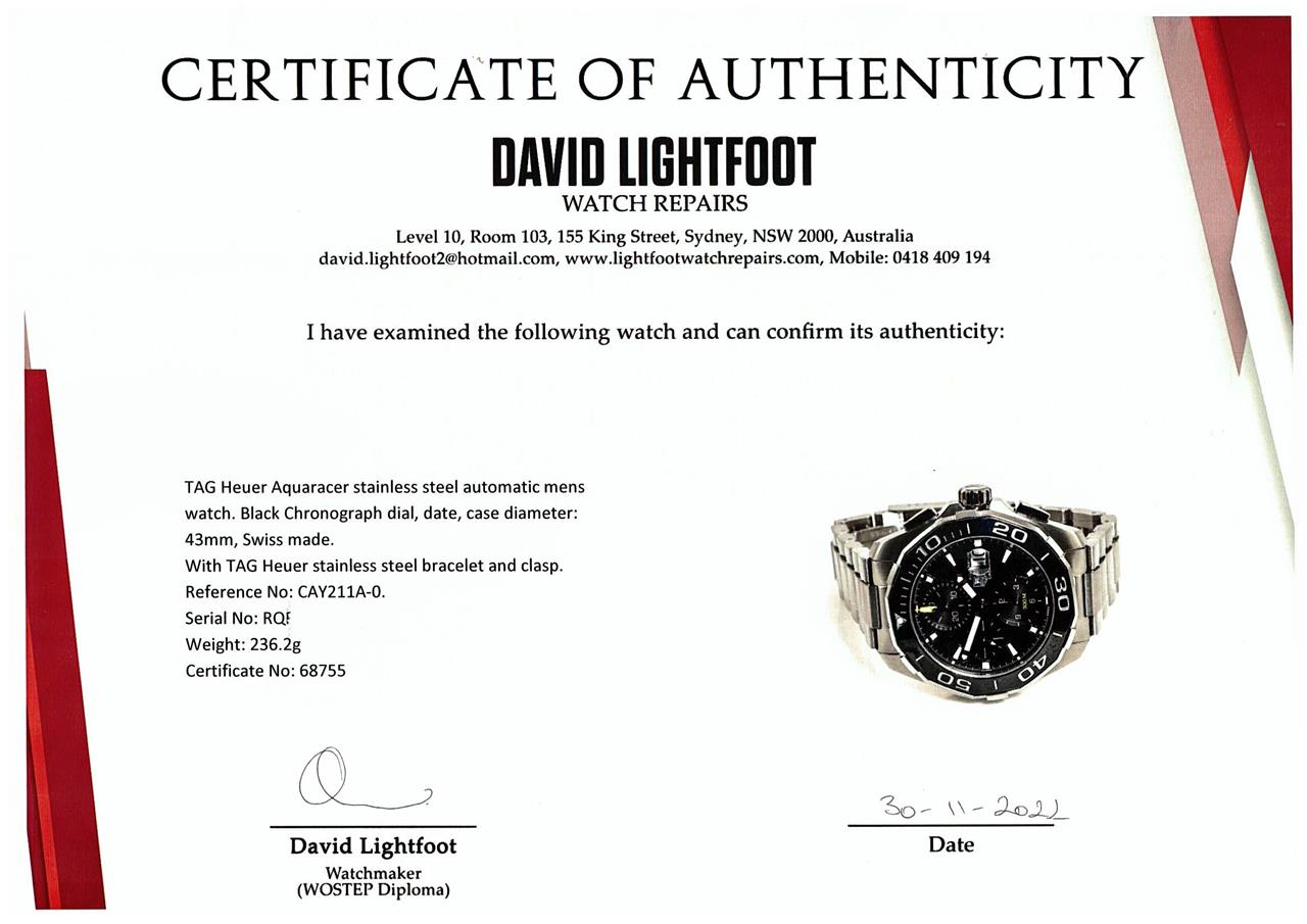 TAG Heuer Aquaracer stainless steel automatic mens watch. Black Chronograph dial, date, case diameter: 43mm, wrist size: 20cm, Swiss made. Ref# CAY211A-0. With TAG Heuer stainless steel bracelet and clasp. With Certificate of Authenticity, Limited International Guarantee Card and TAG Heuer box. 3 month FSA warranty. (Pre-owned)