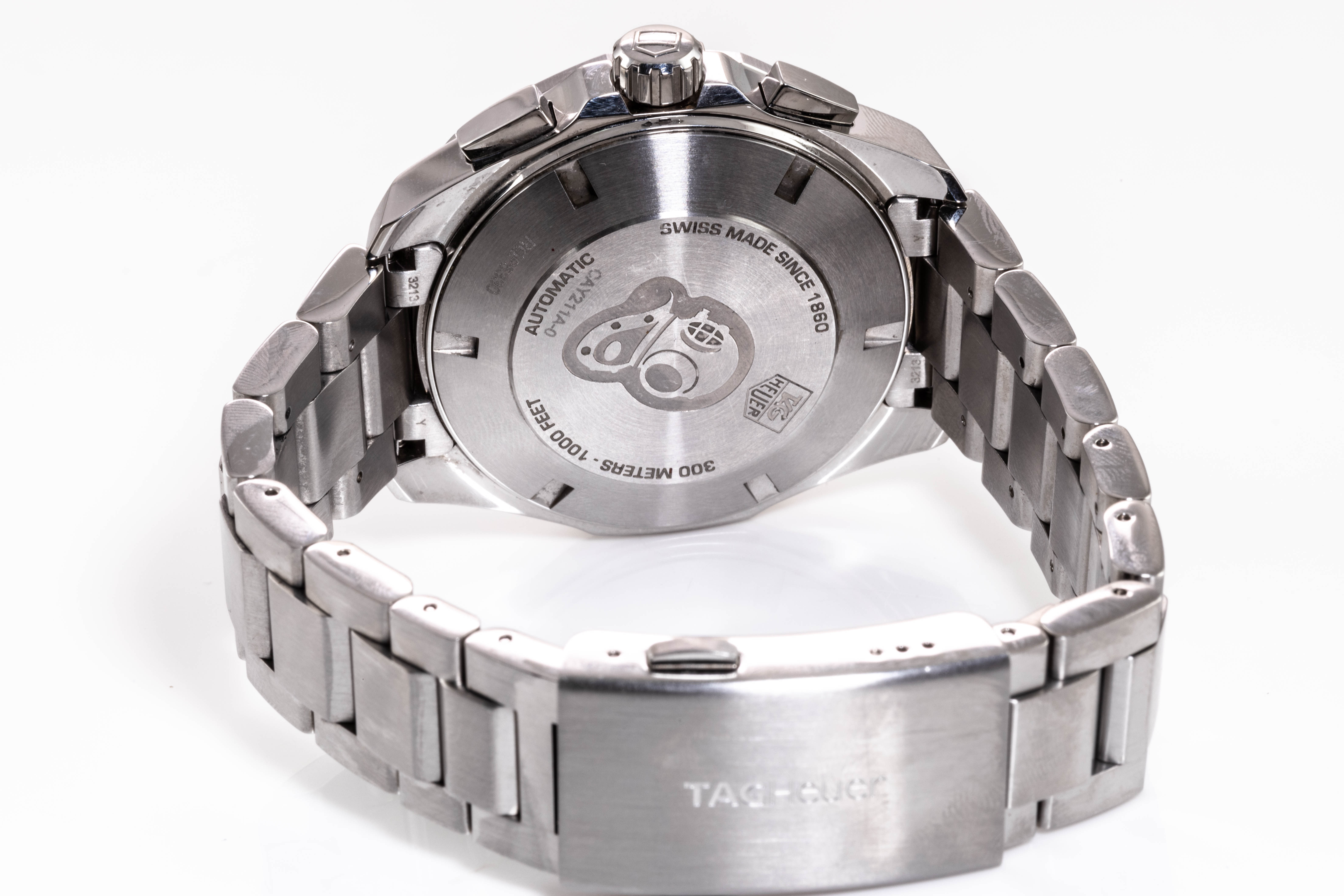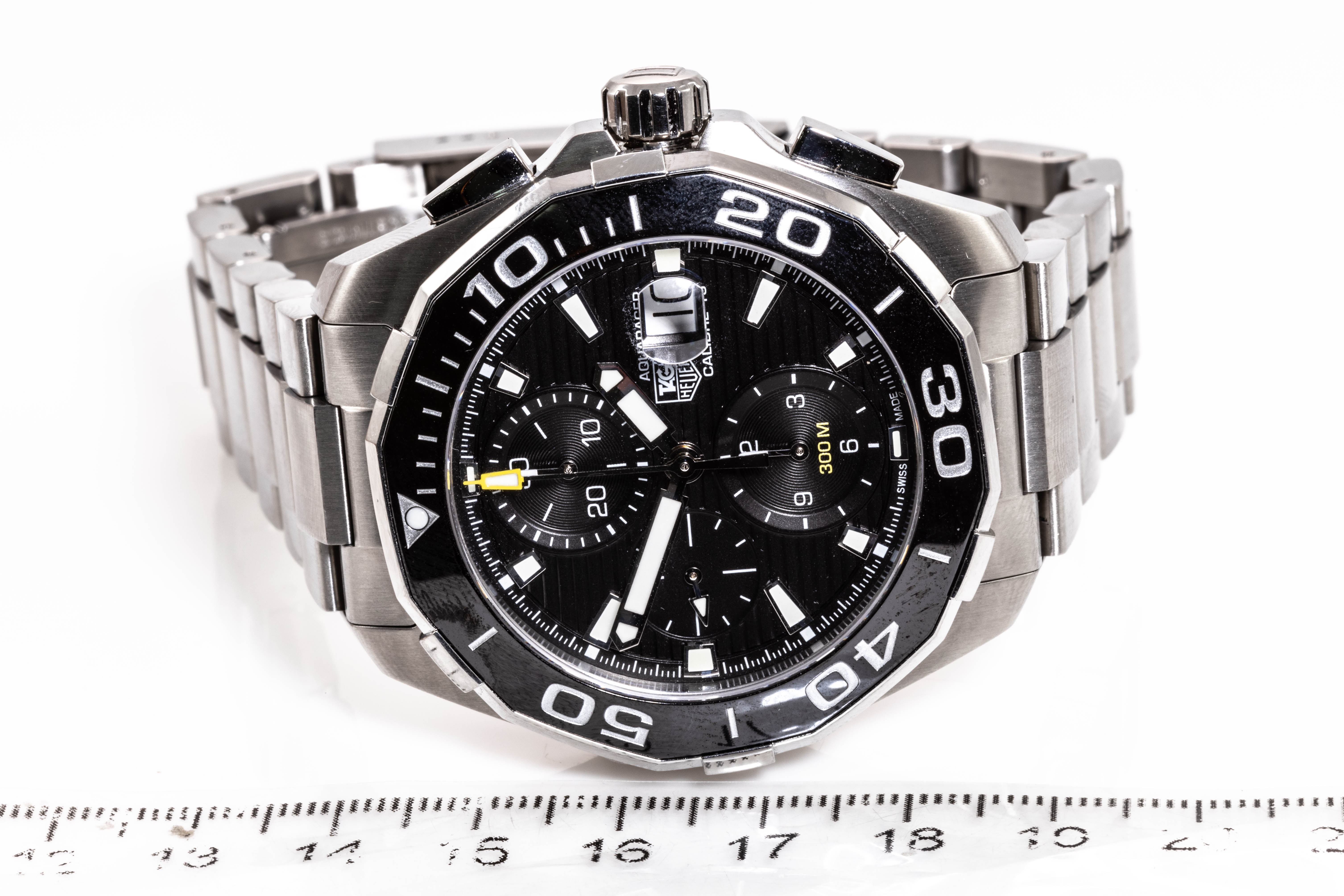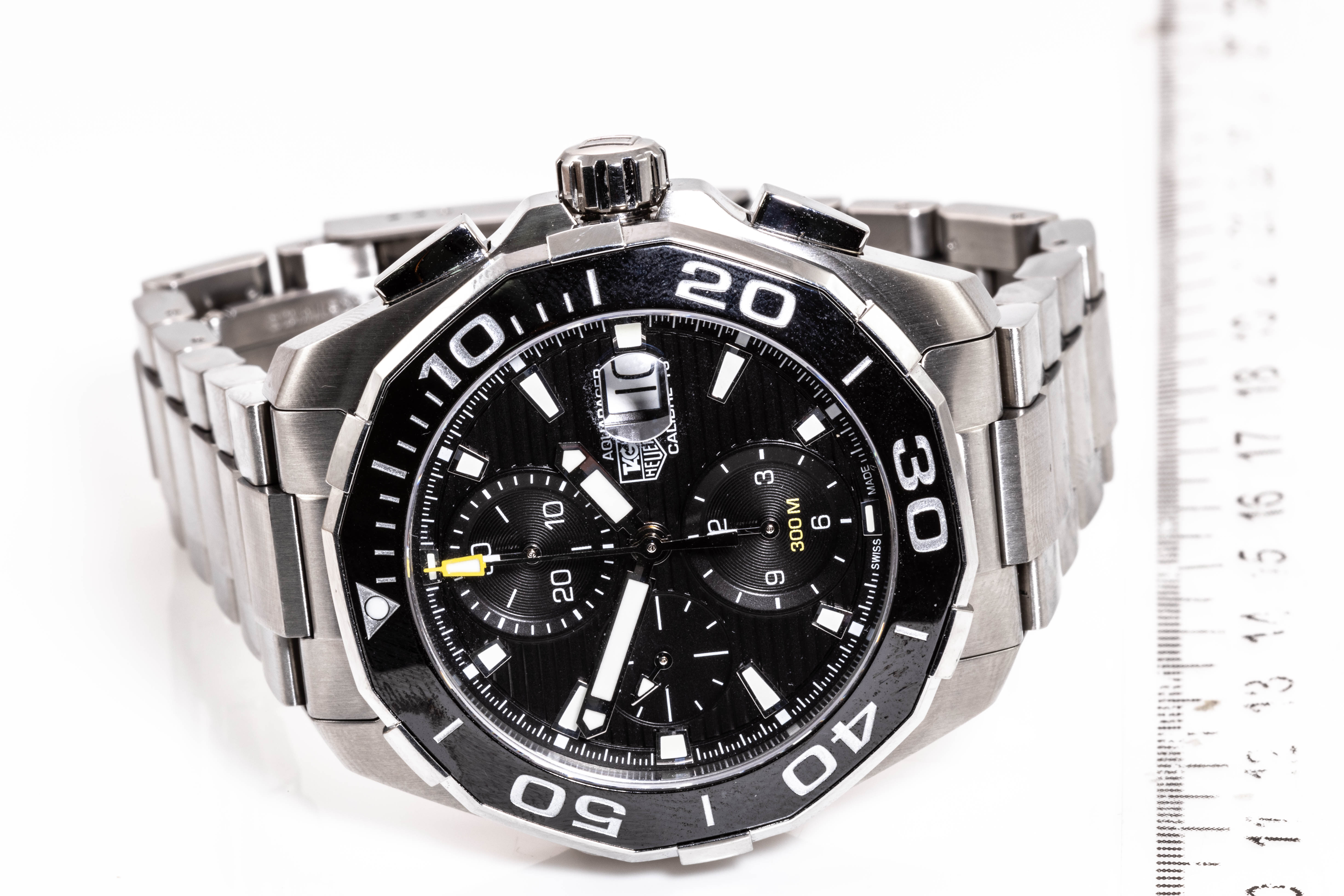 TAG Heuer Aquaracer stainless steel automatic mens watch. Black Chronograph dial, date, case diameter: 43mm, wrist size: 20cm, Swiss made. Ref# CAY211A-0. With TAG Heuer stainless steel bracelet and clasp. With Certificate of Authenticity, Limited International Guarantee Card and TAG Heuer box. 3 month FSA warranty. (Pre-owned)