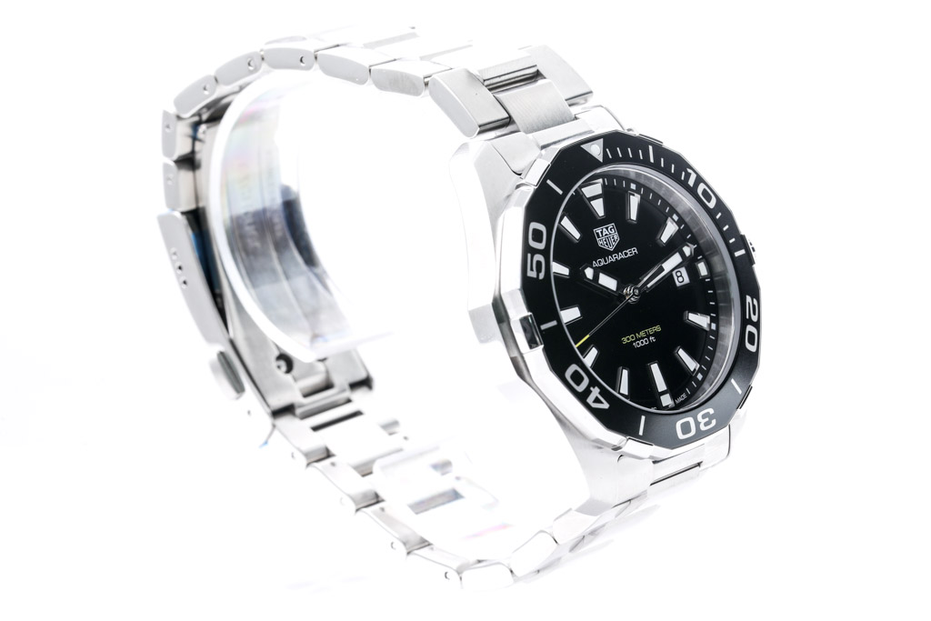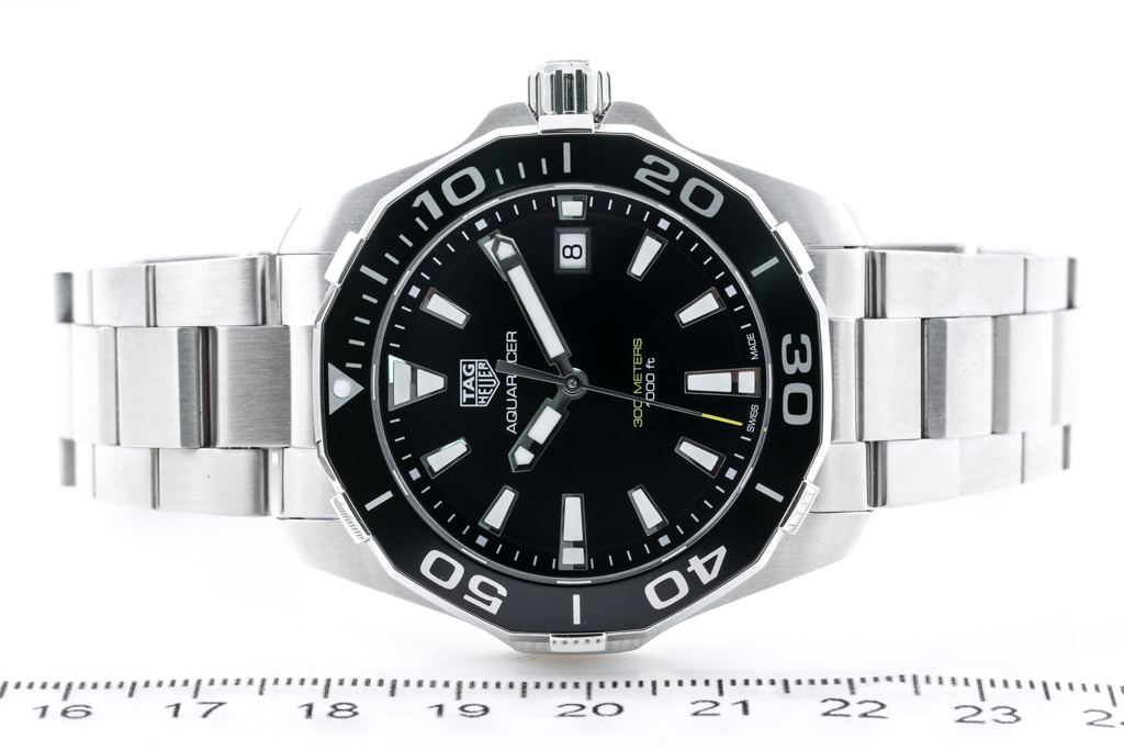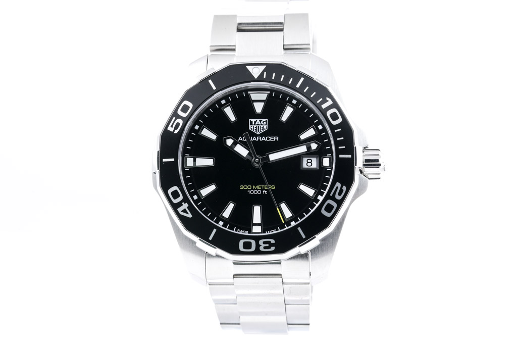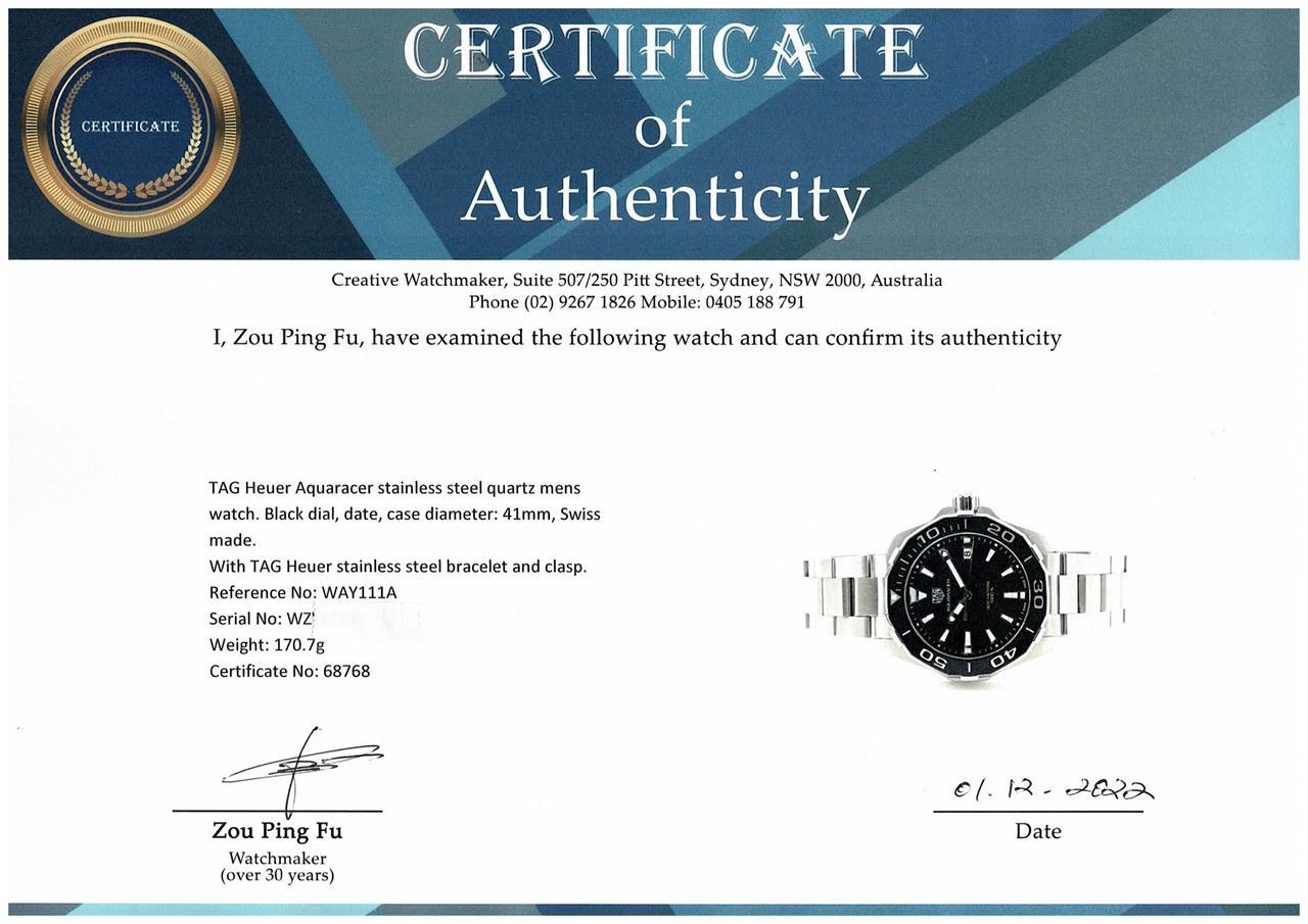 TAG Heuer Aquaracer stainless steel quartz mens watch. Black dial, date, case diameter: 41mm, wrist size: 20cm, Swiss made. Ref# WAY111A. With TAG Heuer stainless steel bracelet and clasp. With Certificate of Authenticity, TAG Heuer International Warranty Card and TAG Heuer box. 3 month FSA warranty. (Pre-owned)