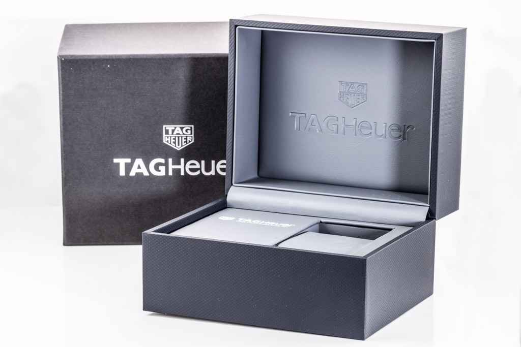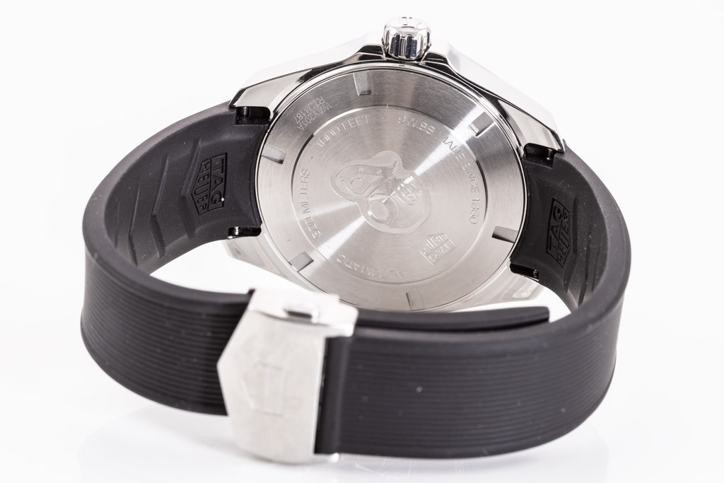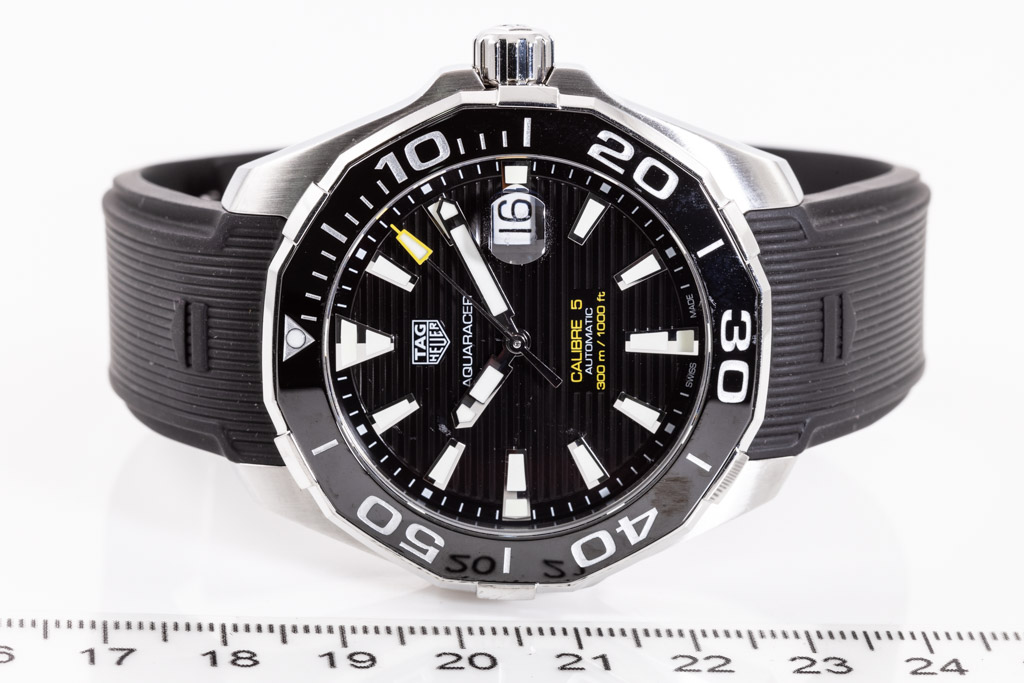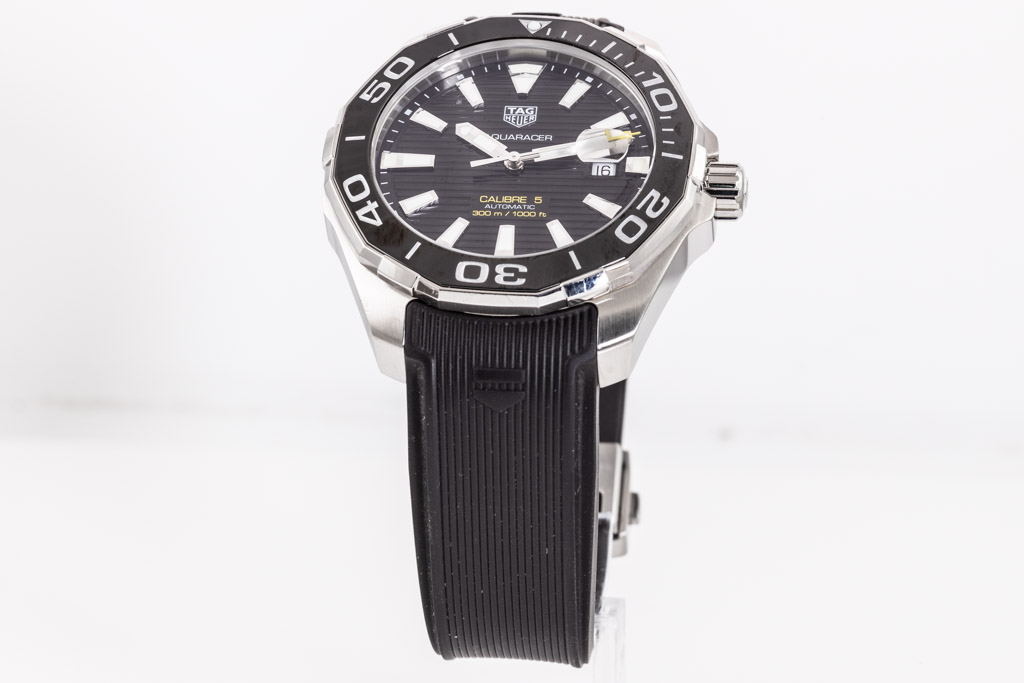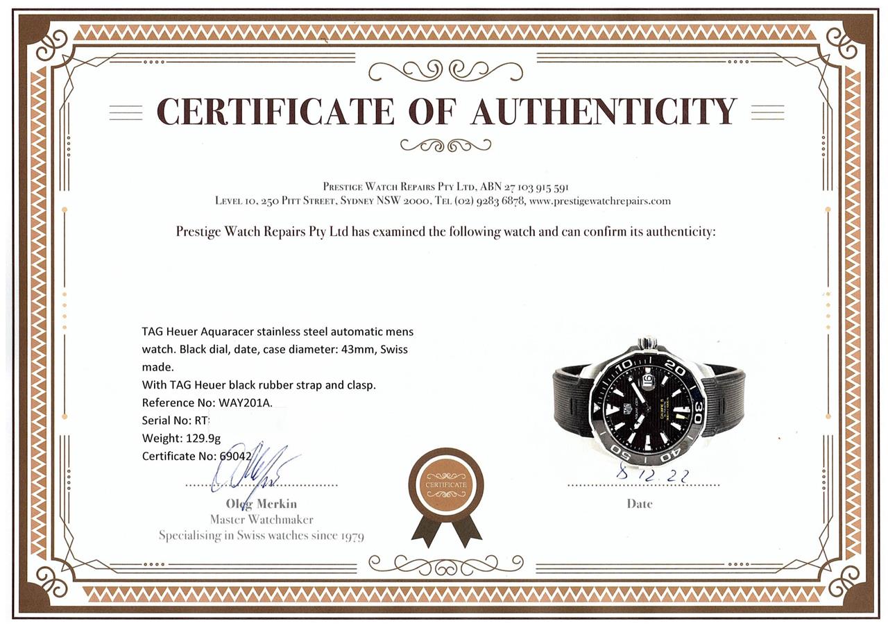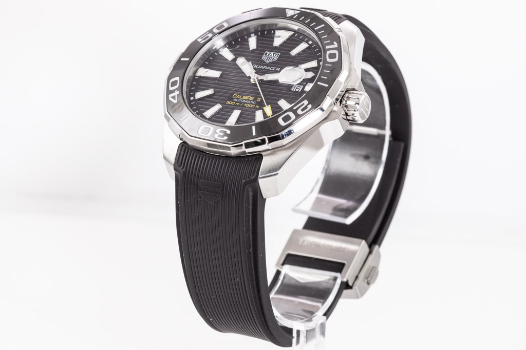 TAG Heuer Aquaracer stainless steel automatic mens watch. Black dial, date, case diameter: 43mm, wrist size: 19cm, Swiss made. Ref# WAY201A. With TAG Heuer black rubber strap and clasp. With Certificate of Authenticity, TAG Heuer International Warranty Card dated 28/04/2019 and TAG Heuer box. 3 month FSA warranty. (Pre-owned)
