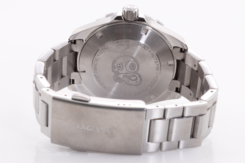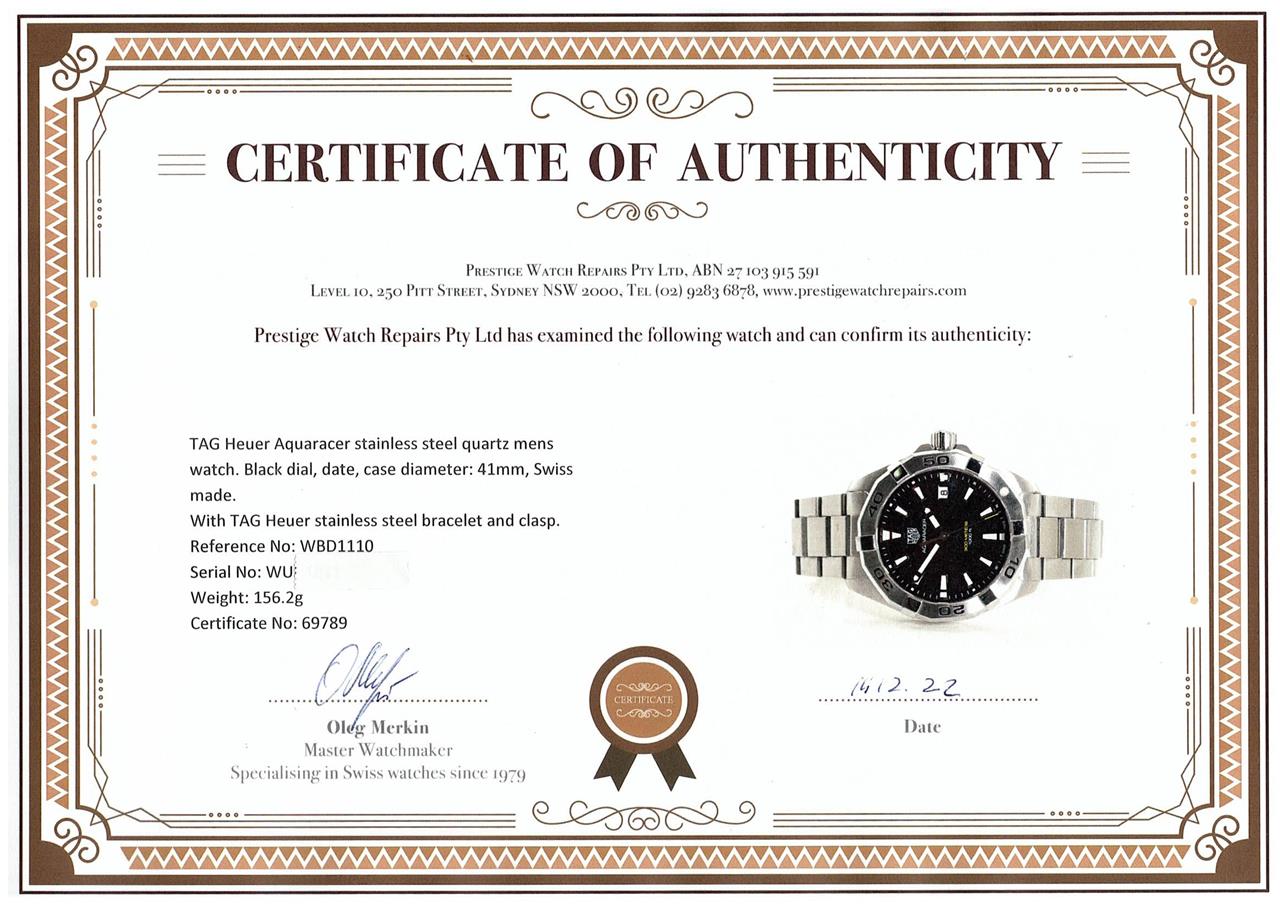 TAG Heuer Aquaracer stainless steel quartz mens watch. Black dial, date, case diameter: 41mm, wrist size: 16cm, Swiss made. Ref# WBD1110 . With TAG Heuer stainless steel bracelet and clasp. With Certificate of Authenticity, TAG Heuer International Warranty Card and TAG Heuer box. 3 month FSA warranty. (Pre-owned)
