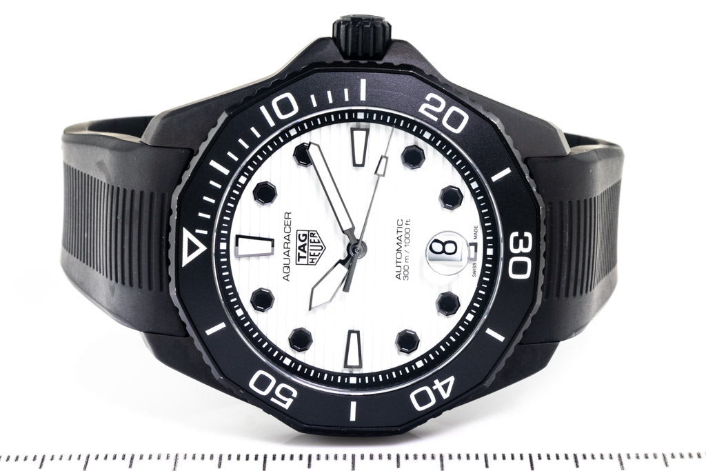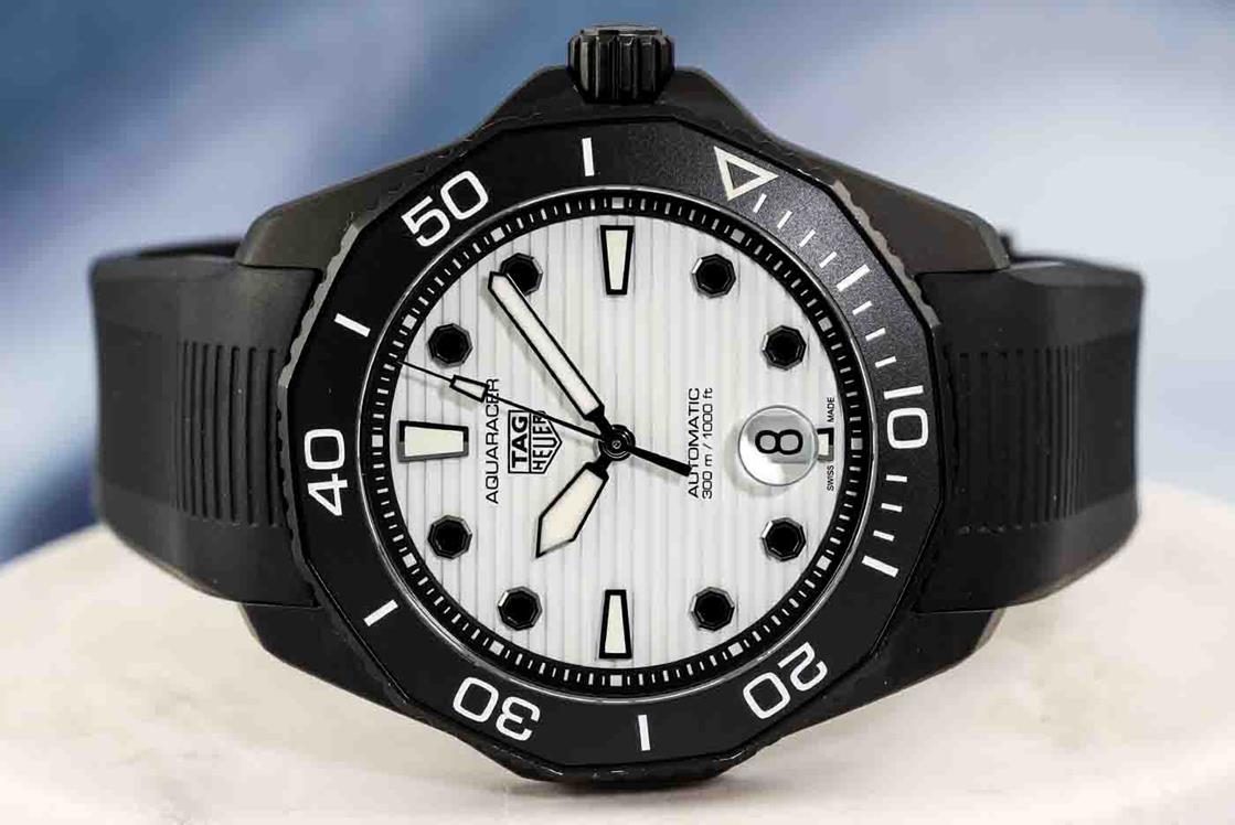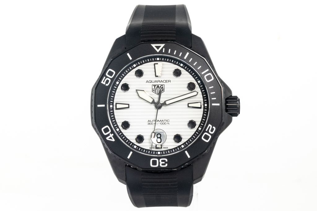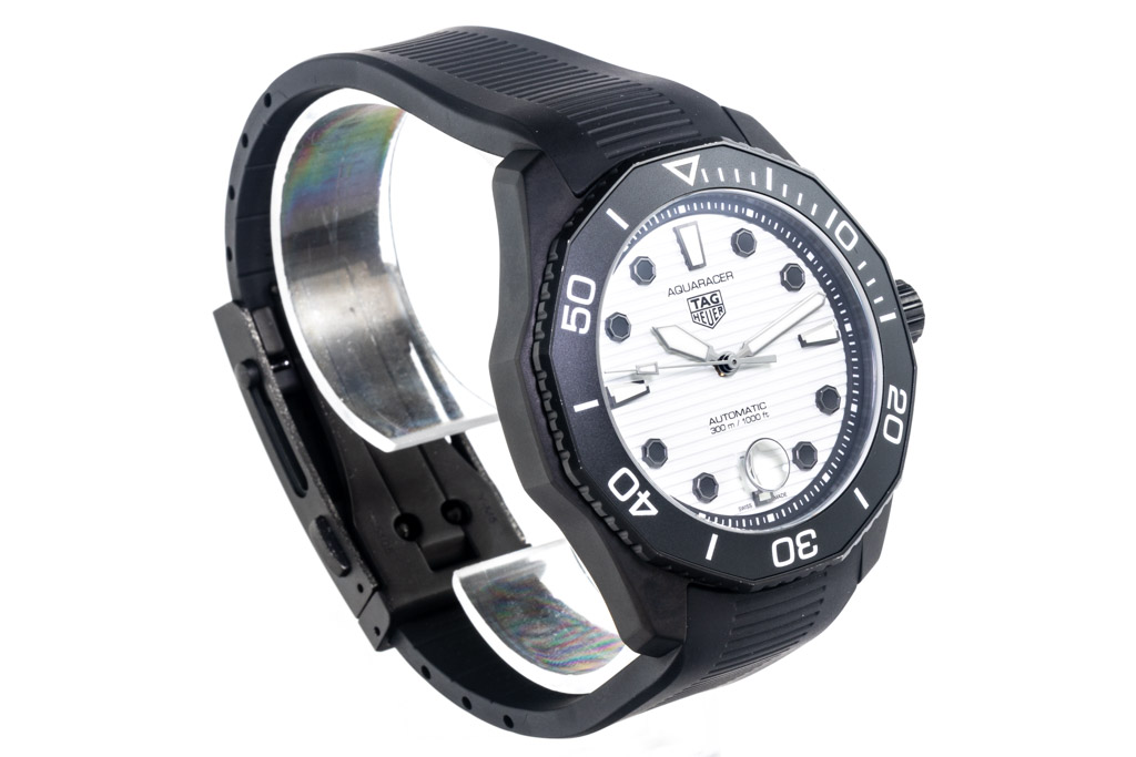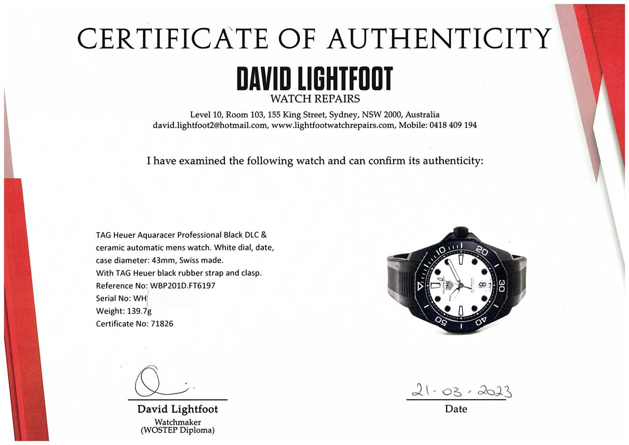 TAG Heuer Aquaracer Professional Black DLC & ceramic automatic mens watch. White dial, date, case diameter: 43mm, wrist size: 19.5cm, Swiss made. Ref# WBP201D.FT6197. With TAG Heuer black rubber strap and clasp. With Certificate of Authenticity, TAG Heuer International Warranty card dated 22/11/2021 and TAG Heuer box. Balance of 2 year TAG Heuer manufactory warranty applies. (Pre-owned)