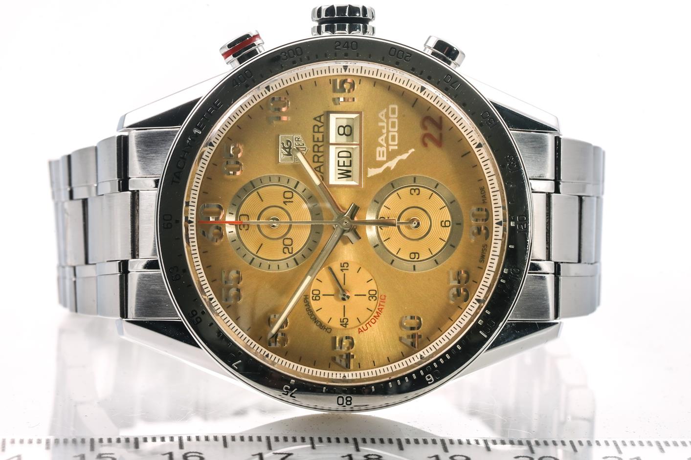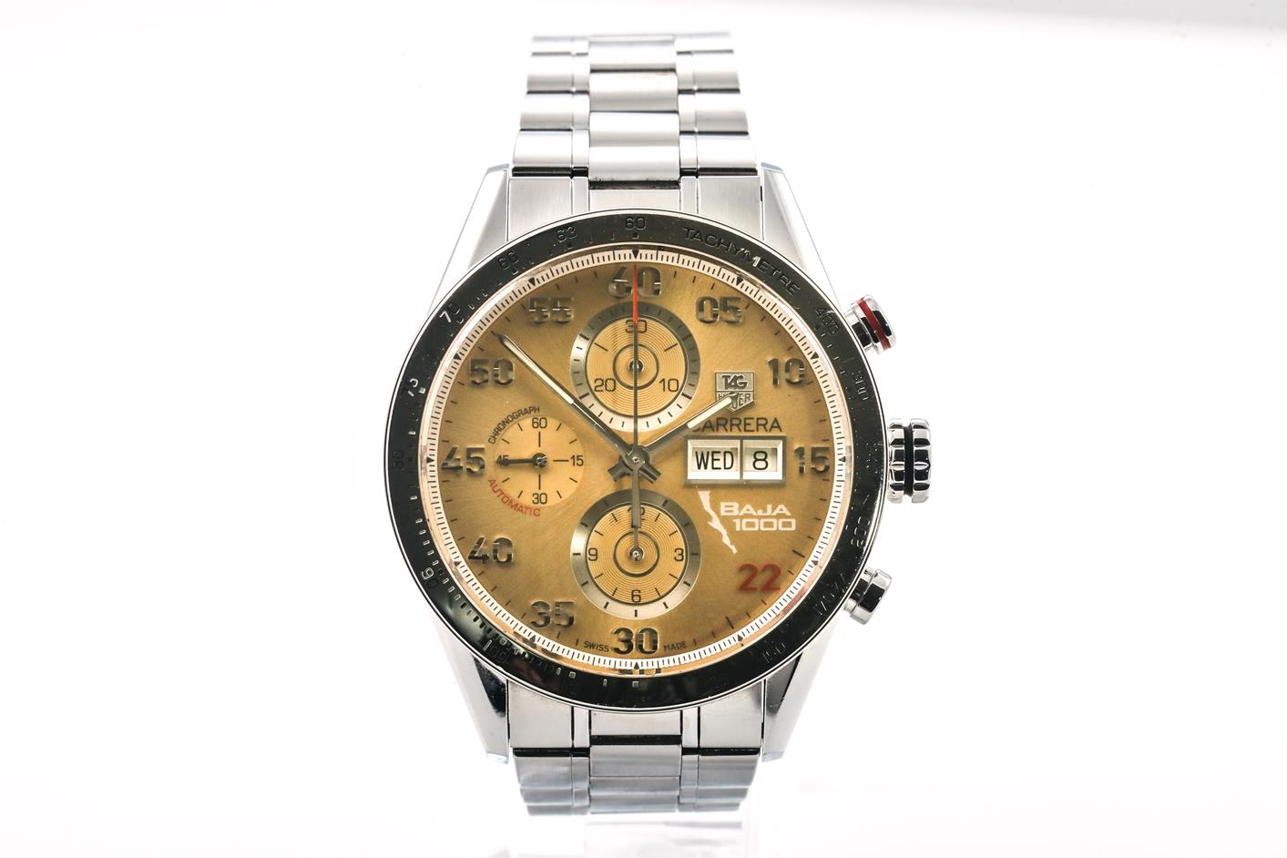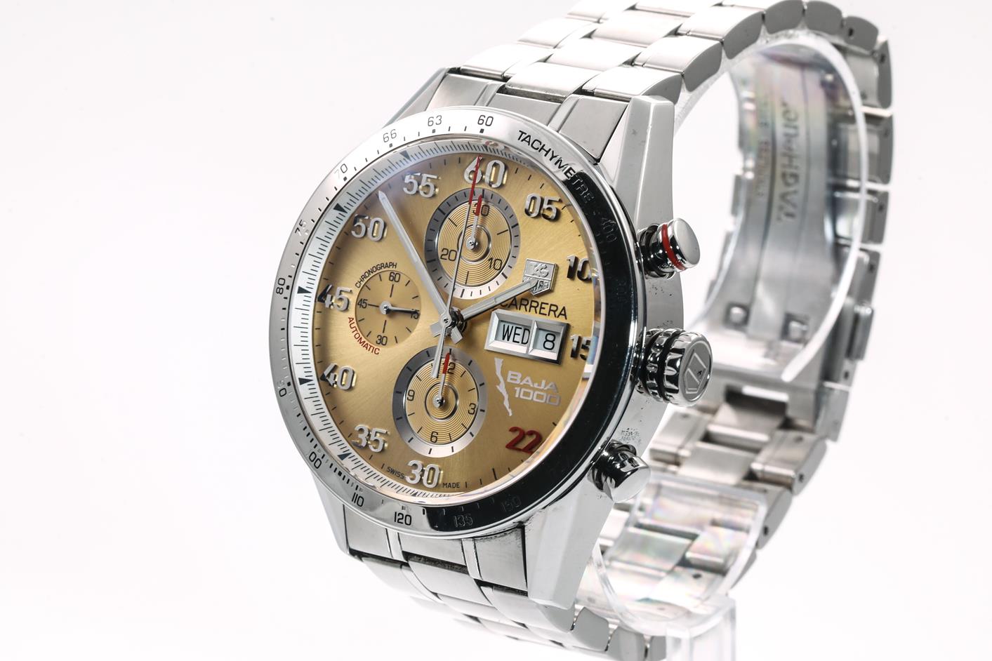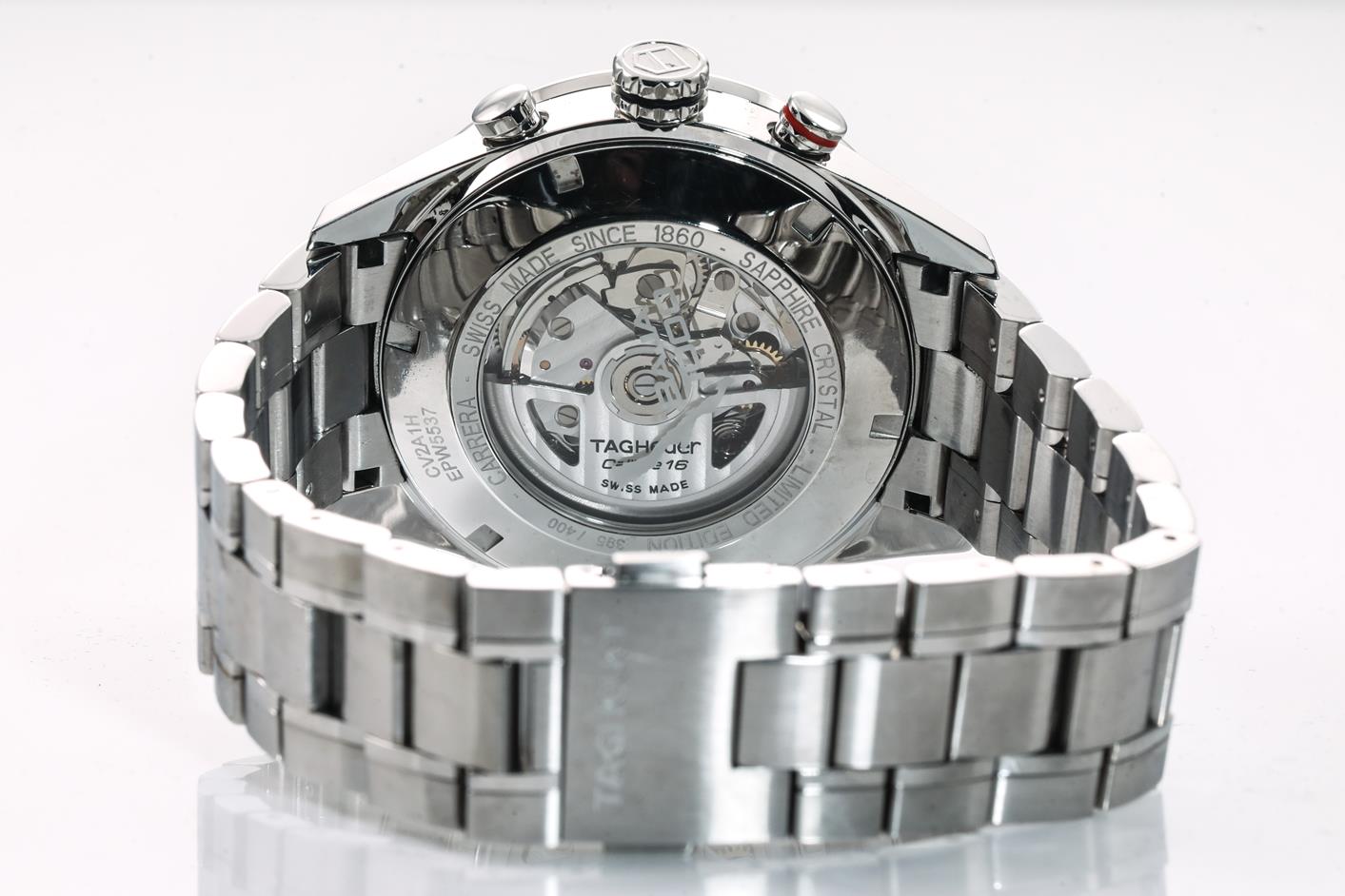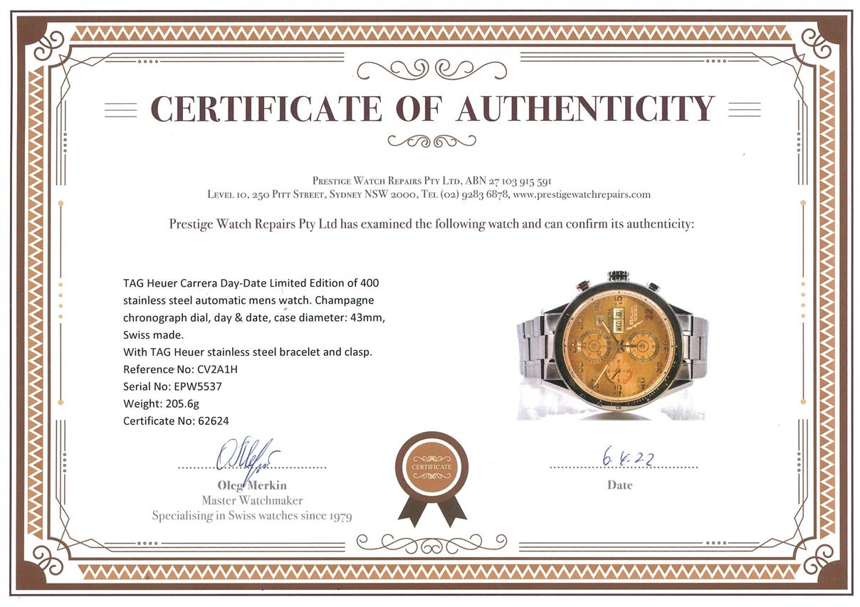 TAG Heuer Carrera Day-Date Limited Edition of 400 stainless steel automatic mens watch. Champagne chronograph dial, day & date, case diameter: 43mm, wrist size: 20cm, Swiss made. Ref# CV2A1H. With TAG Heuer stainless steel bracelet and clasp. With Certificate of Authenticity and TAG Heuer box. 3 month FSA warranty. (Pre-owned)