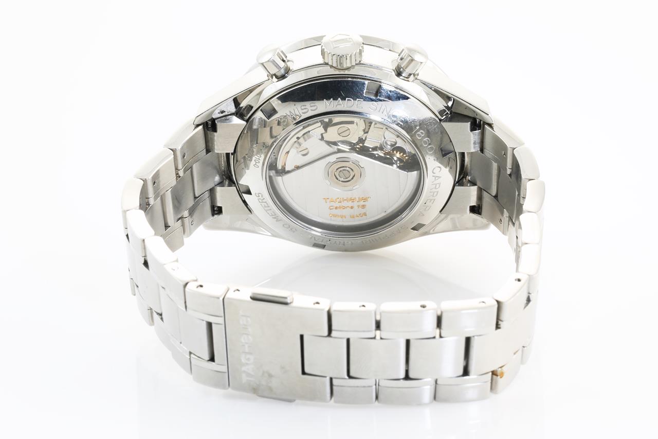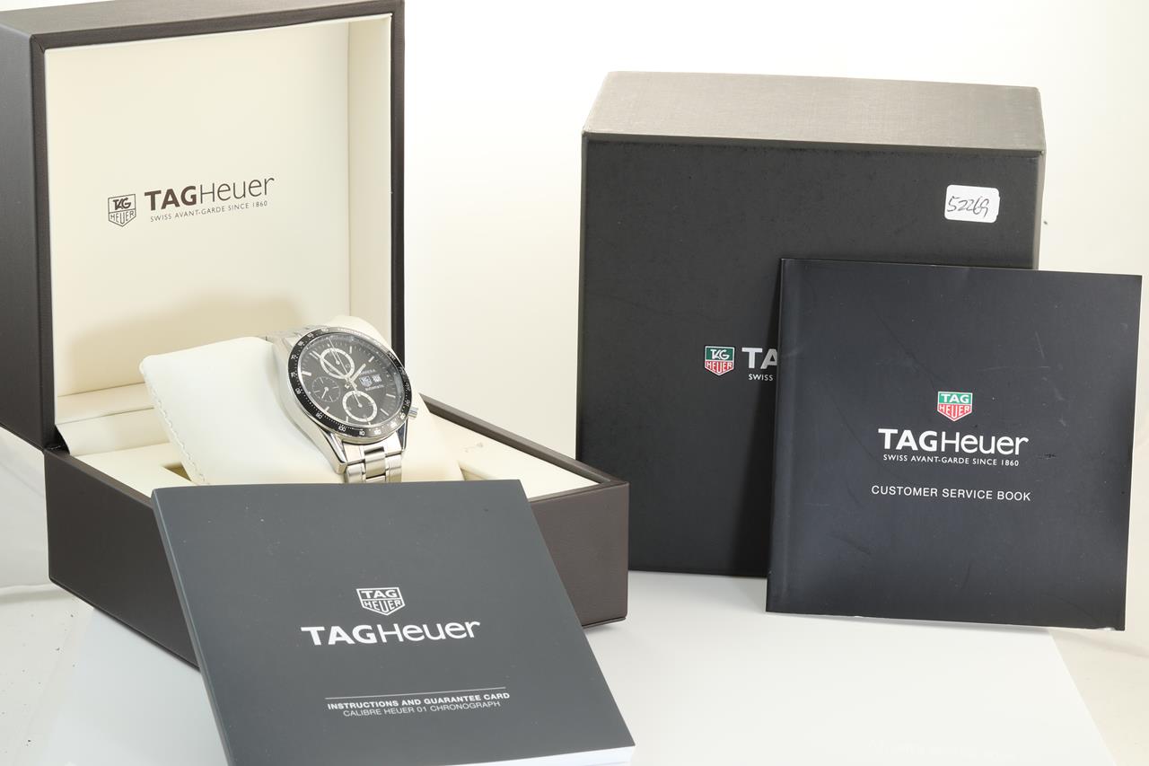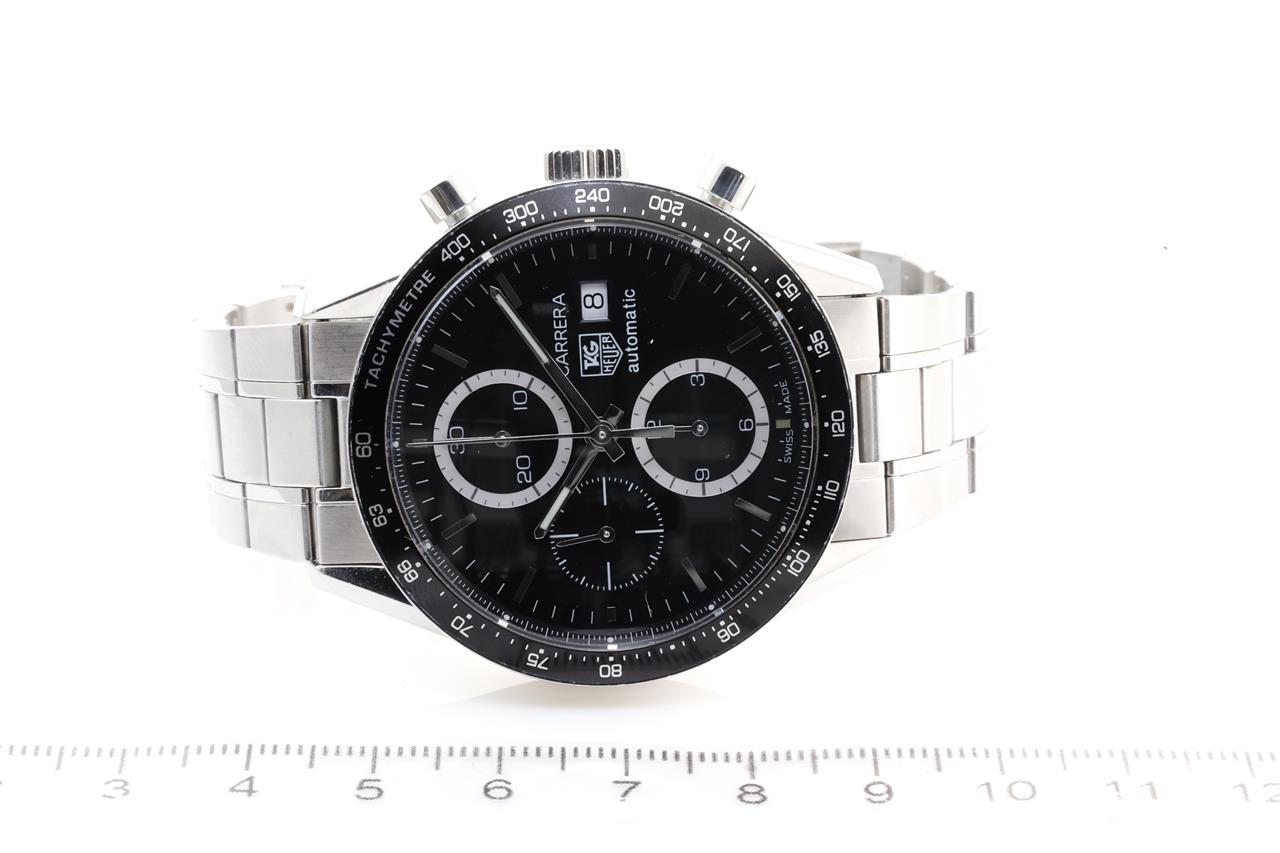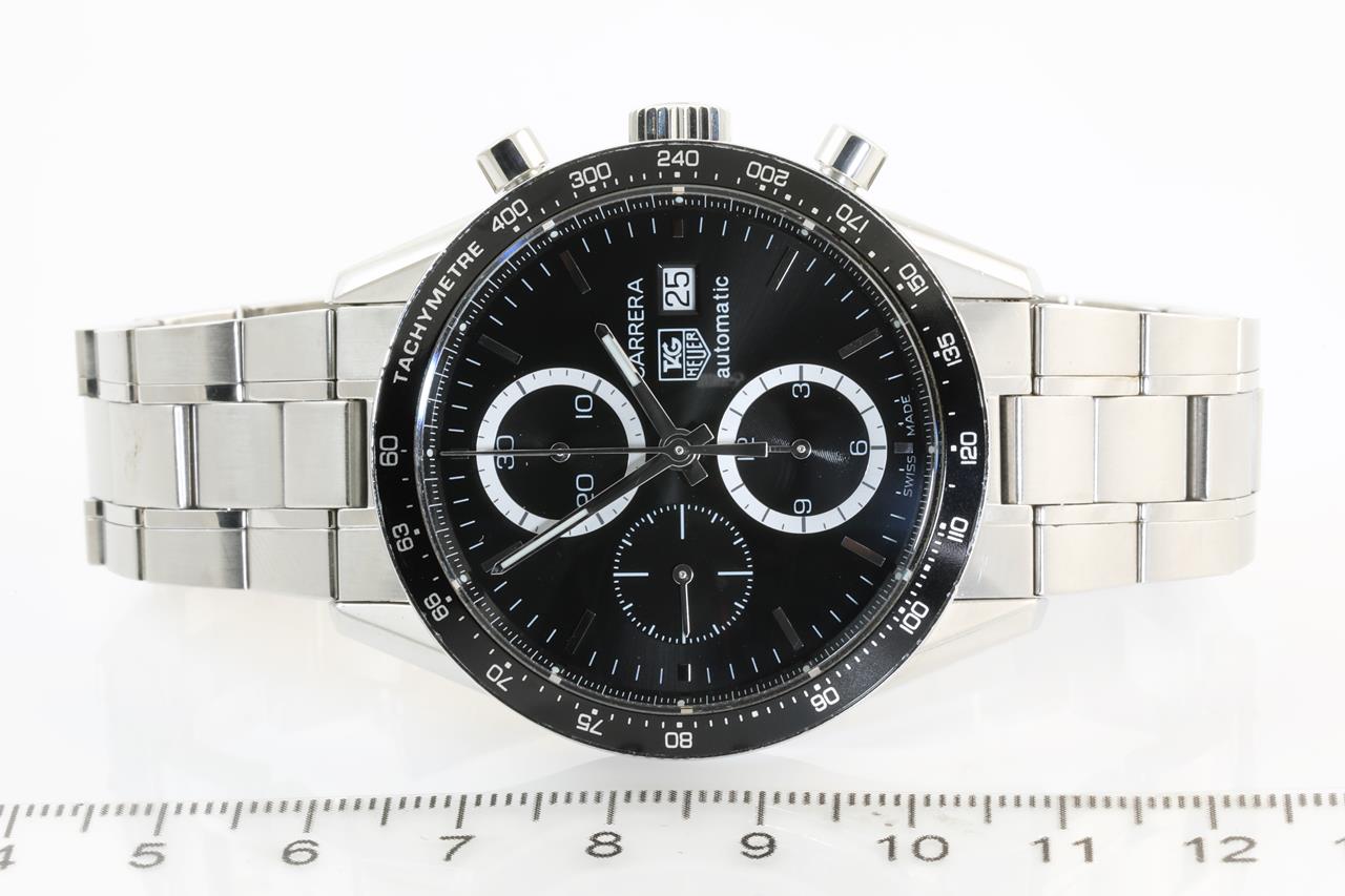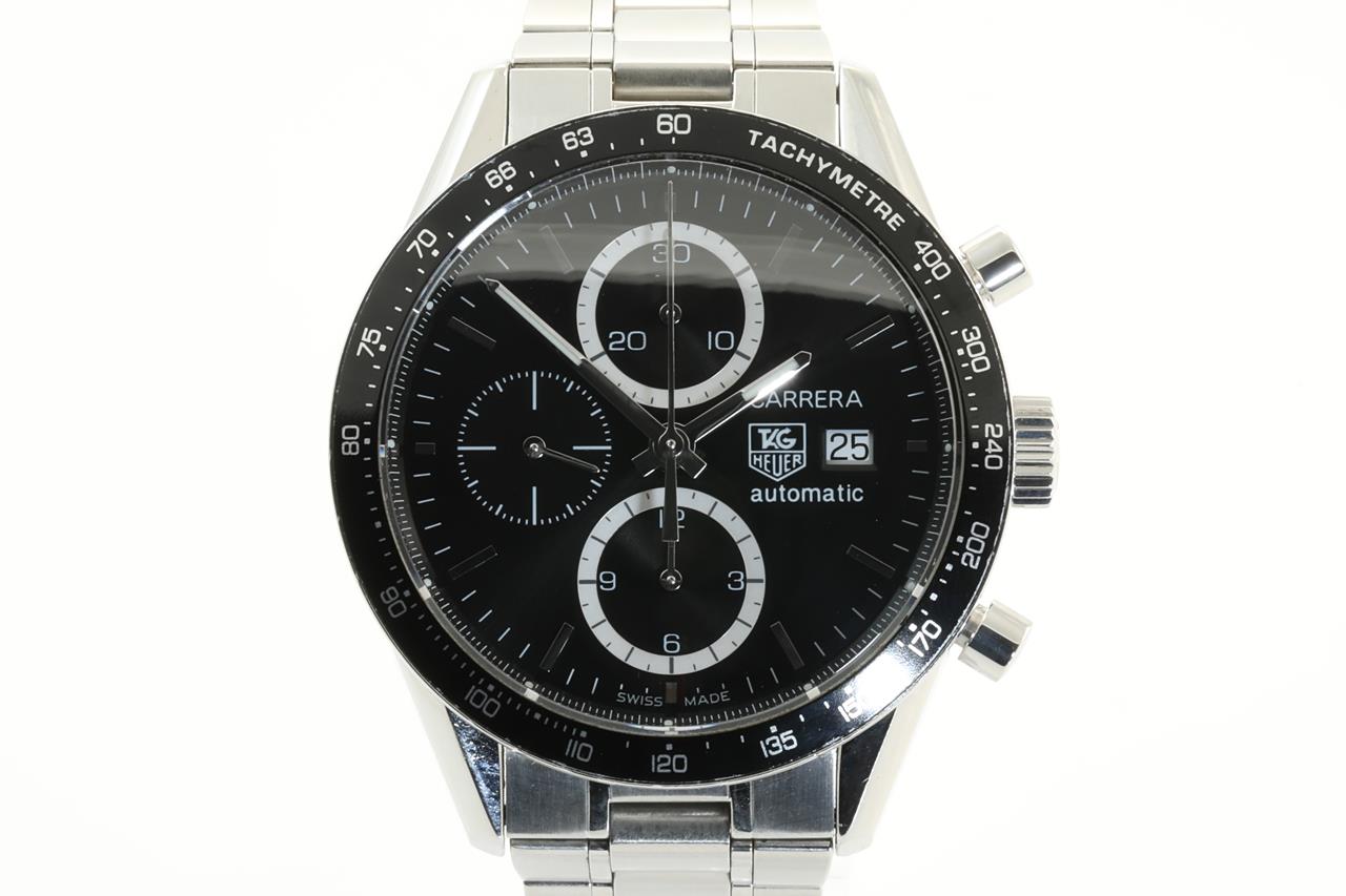 TAG Heuer Carrera stainless steel mens watch. Black dial, date, case diameter: 41mm, wrist size: 18cm, Swiss made. Ref# CV2010. With TAG Heuer stainless steel bracelet and clasp. With certificate of authenticity and worn TAG Heuer box. 3 month FSA warranty. (Pre-owned)
