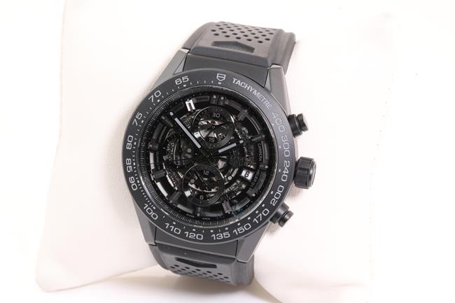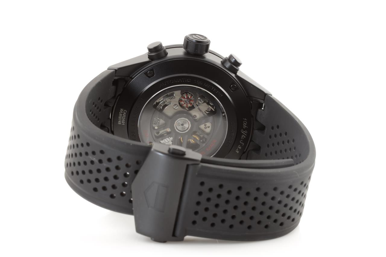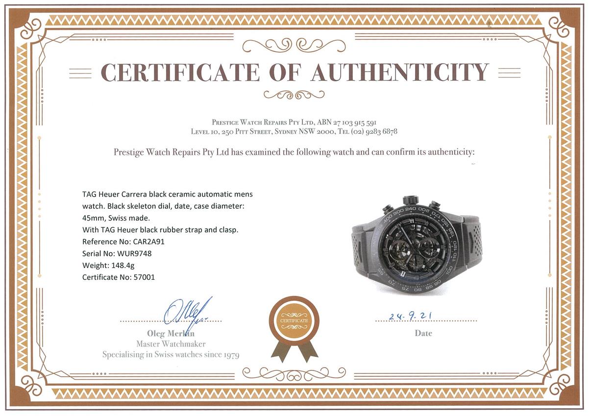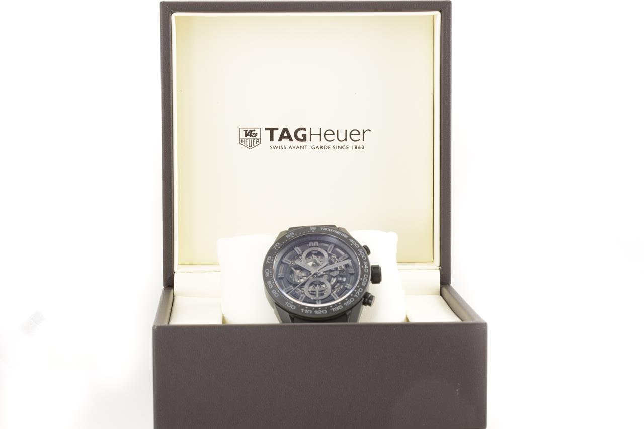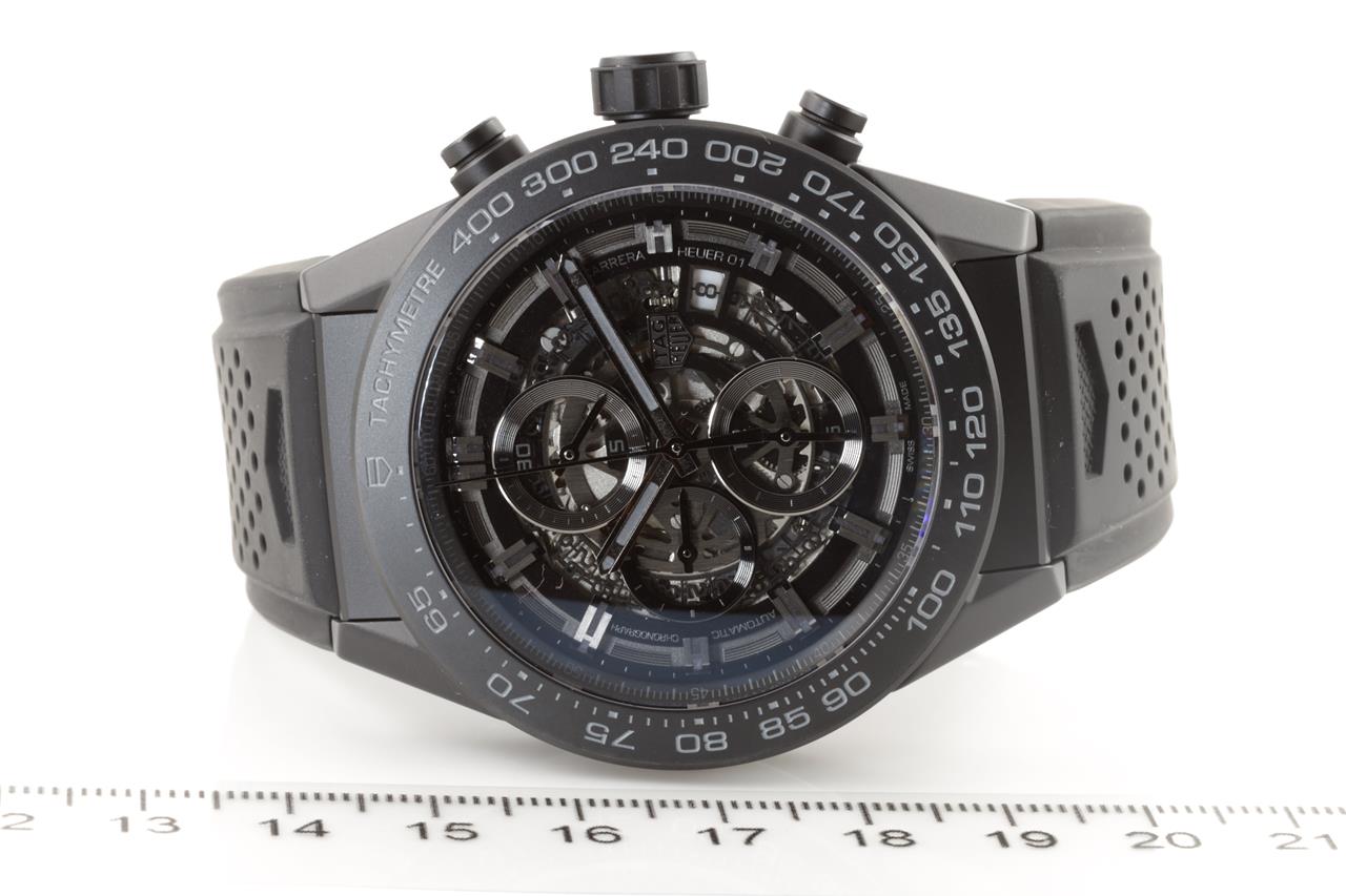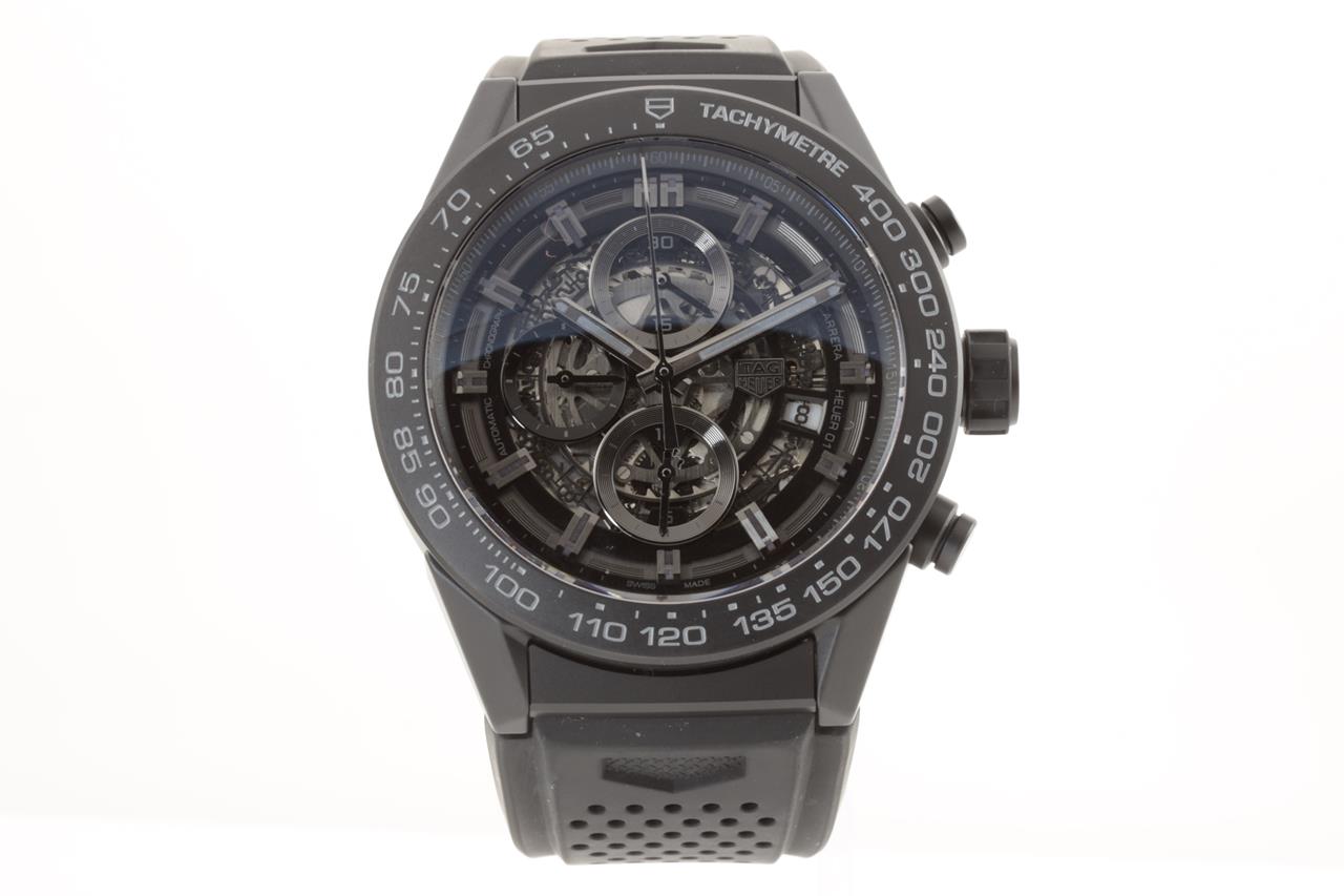 TAG Heuer Carrera black ceramic automatic mens watch. Black skeleton dial, date, case diameter: 45mm, wrist size: 18cm, Swiss made. Ref# CAR2A91. With TAG Heuer black rubber strap and clasp. With certificate of authenticity, TAG Heuer guarantee card dated 21/04/2019 and TAG Heuer box with gift bag. 3 month FSA warranty. (Pre-owned)
