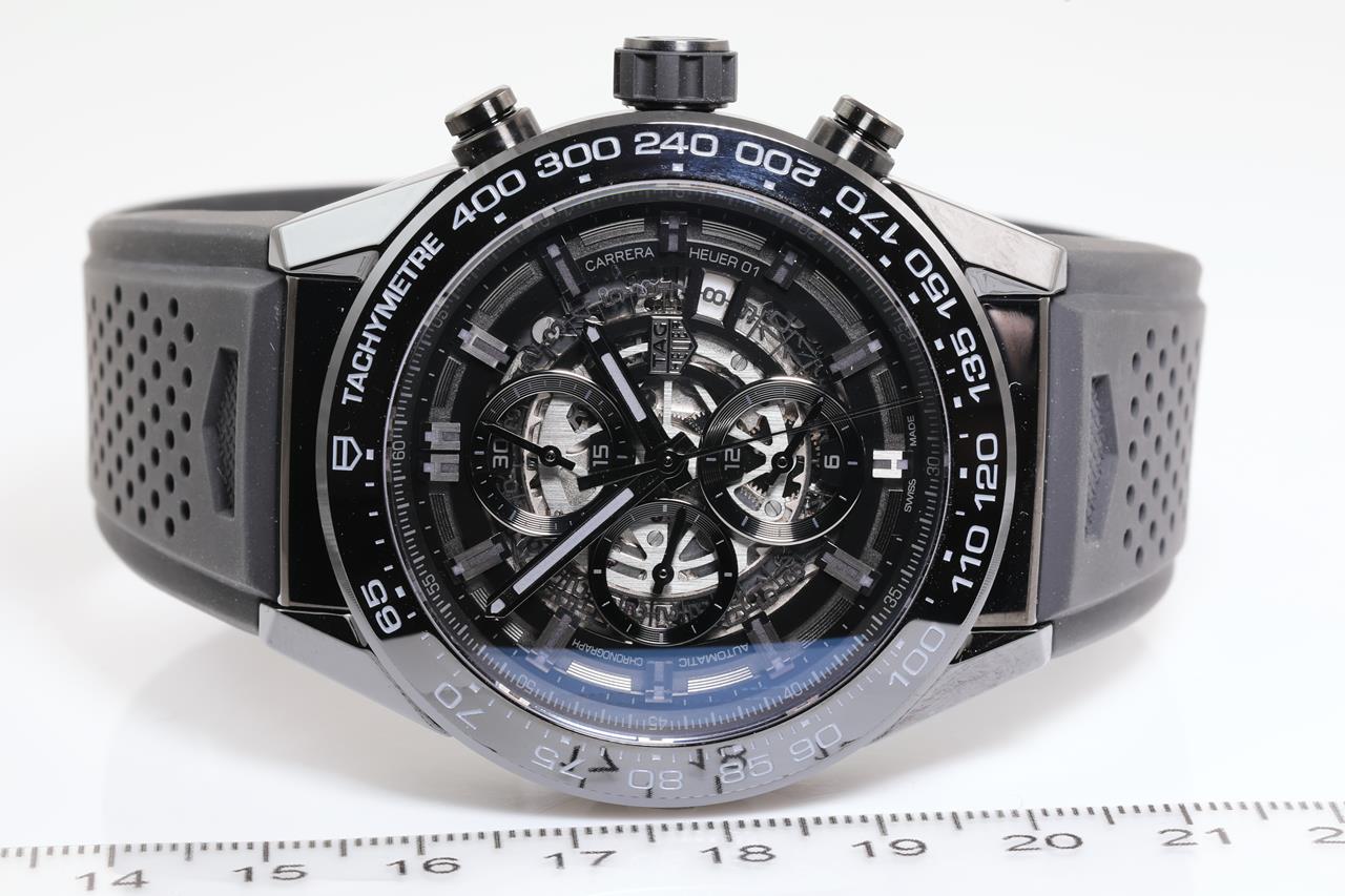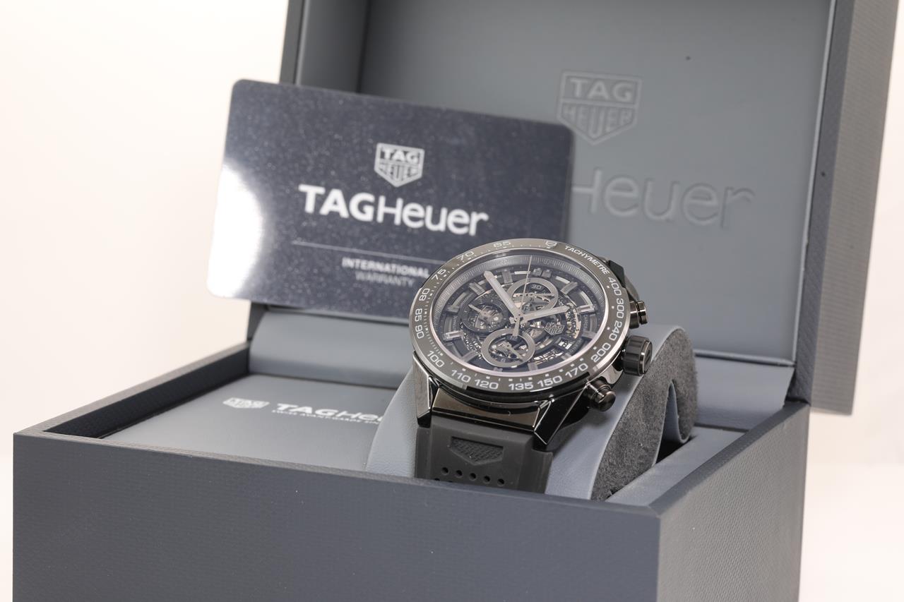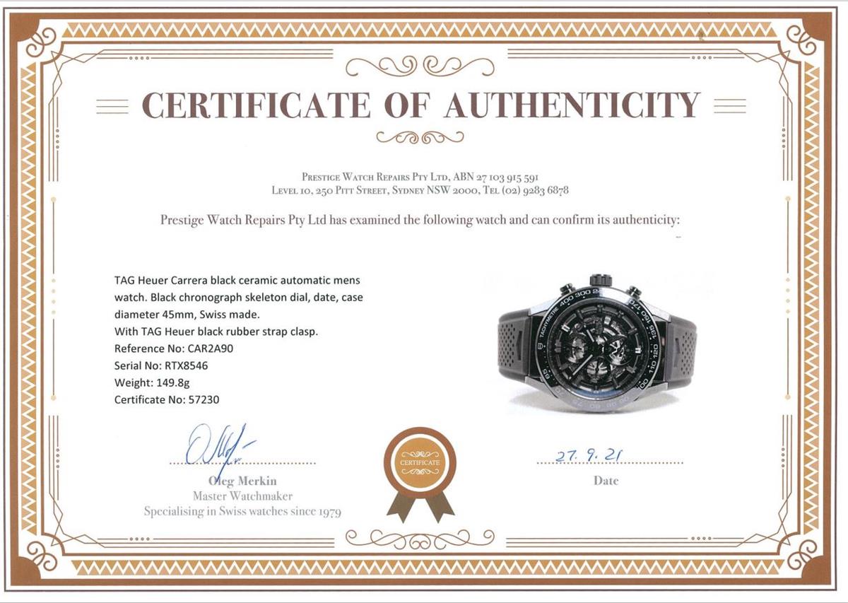 TAG Heuer Carrera black ceramic automatic mens watch. Black chronograph skeleton dial, date, case diameter 45mm, wrist size: 21.5cm, Swiss made. Ref# CAR2A90. With TAG Heuer black rubber strap clasp. With certificate of authenticity, TAG Heuer international warranty card dated 16/12/2019 and TAG Heuer box. 3 month FSA warranty. (Pre-owned)