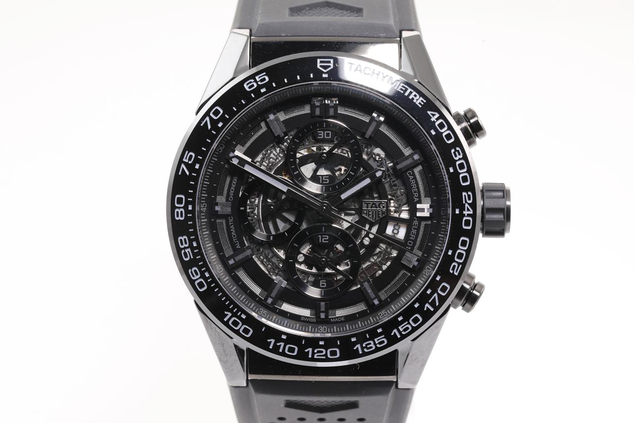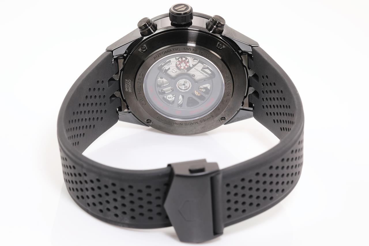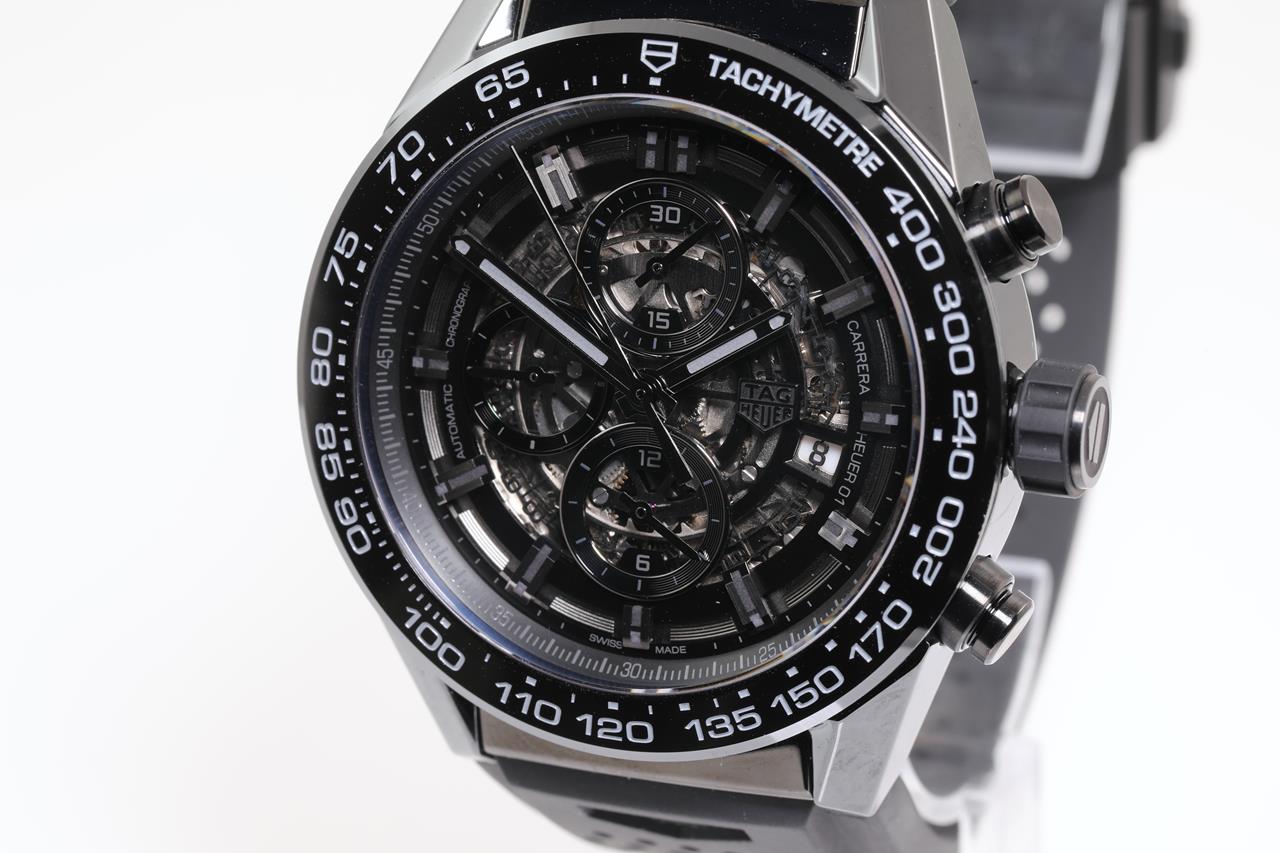 TAG Heuer Carrera black ceramic automatic mens watch. Black chronograph skeleton dial, date, case diameter 45mm, wrist size: 21.5cm, Swiss made. Ref# CAR2A90. With TAG Heuer black rubber strap clasp. With certificate of authenticity, TAG Heuer international warranty card dated 16/12/2019 and TAG Heuer box. 3 month FSA warranty. (Pre-owned)
