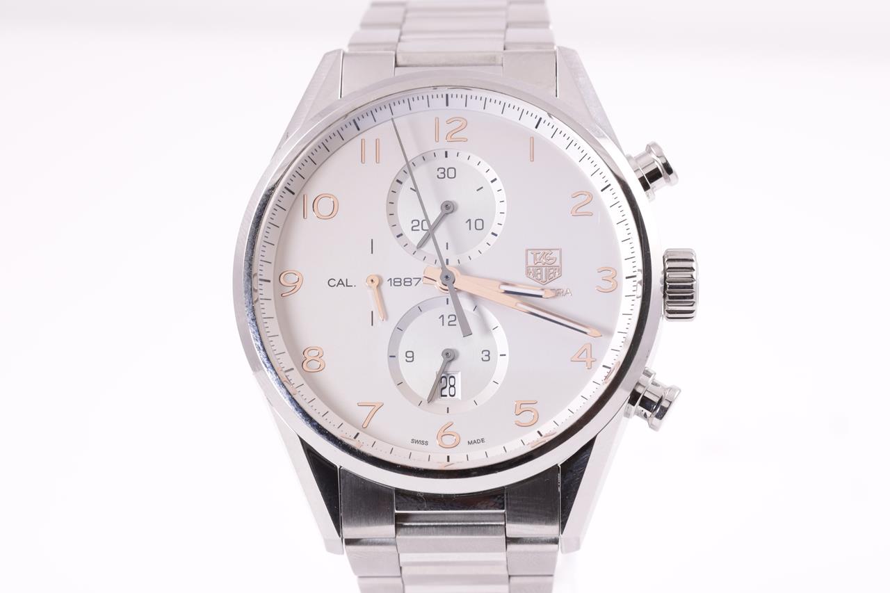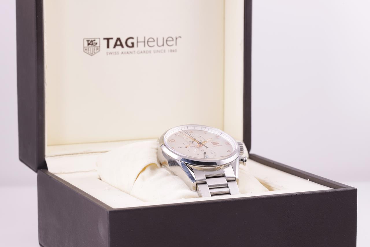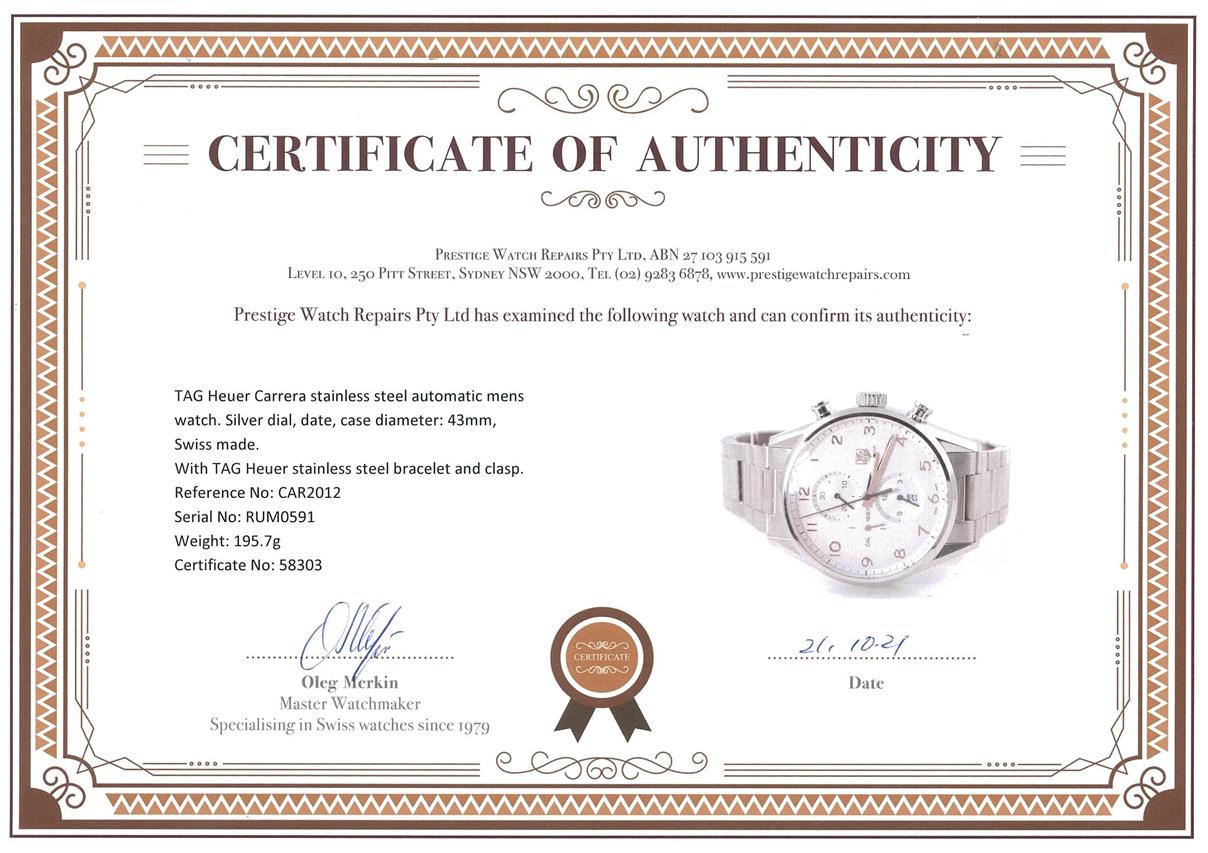 TAG Heuer Carrera stainless steel automatic mens watch. Silver dial, date, case diameter: 43mm, wrist size: 19cm, Swiss made. Ref# CAR2012. With TAG Heuer stainless steel bracelet and clasp. With certificate of authenticity, Tag Heuer international guarantee card dated 14/06/2013 and TAG Heuer Box. 3 month FSA warranty. (Pre-owned)
