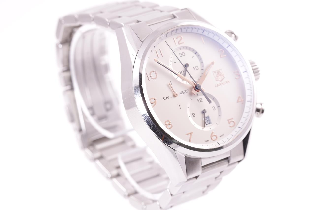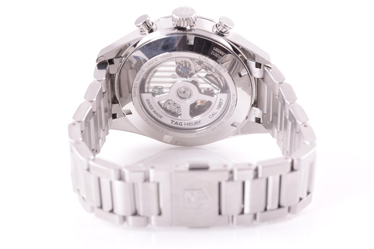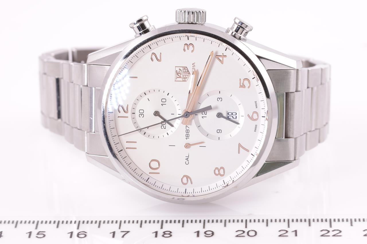 TAG Heuer Carrera stainless steel automatic mens watch. Silver dial, date, case diameter: 43mm, wrist size: 19cm, Swiss made. Ref# CAR2012. With TAG Heuer stainless steel bracelet and clasp. With certificate of authenticity, Tag Heuer international guarantee card dated 14/06/2013 and TAG Heuer Box. 3 month FSA warranty. (Pre-owned)