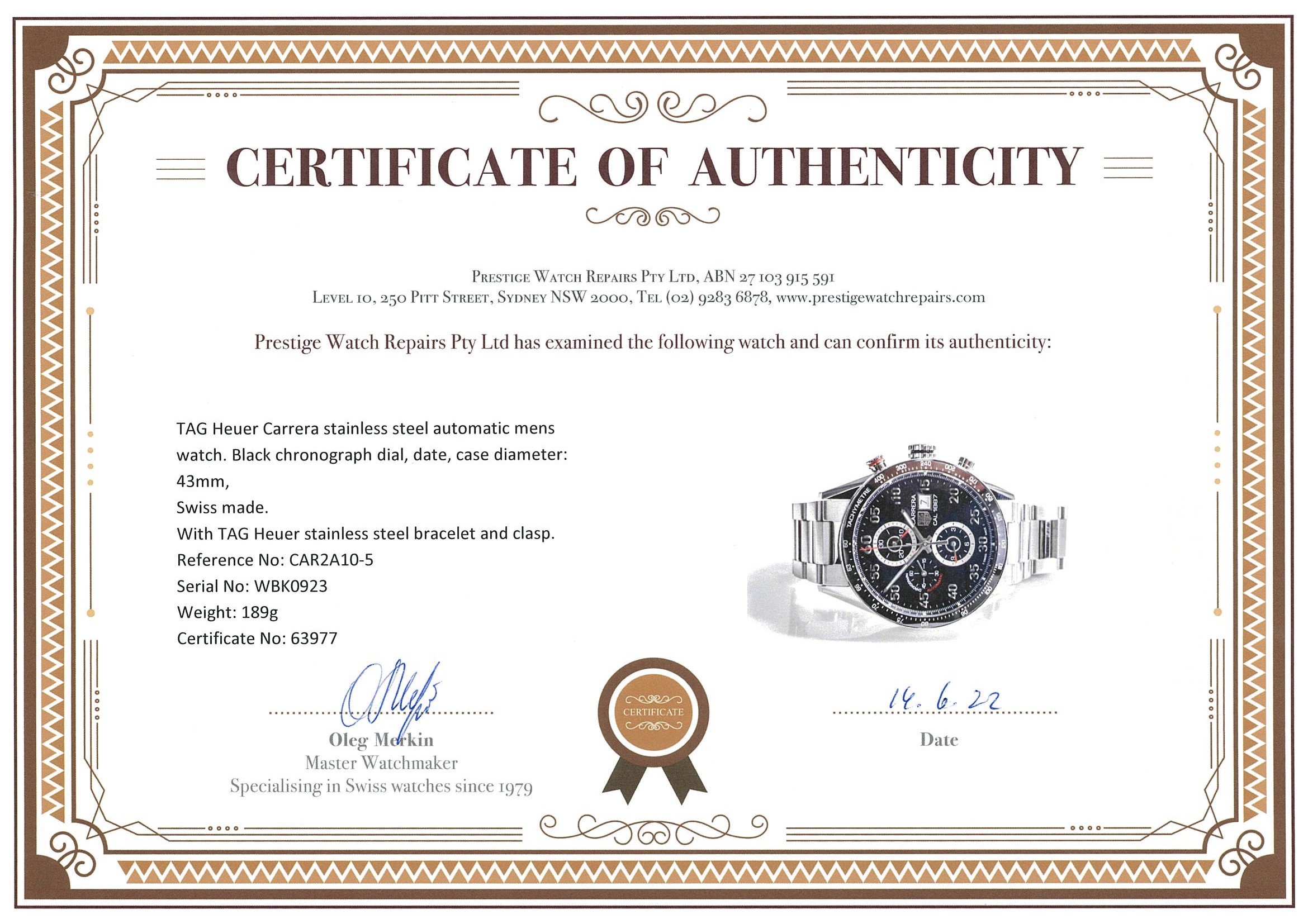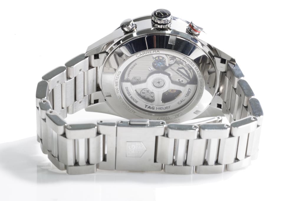 TAG Heuer Carrera stainless steel automatic mens watch. Black chronograph dial, date, case diameter: 43mm, wrist size: 17cm, Swiss made. Ref# CAR2A10-5. With TAG Heuer stainless steel bracelet and clasp. With Certificate of Authenticity, TAG Heuer limited International Warranty Card and TAG Heuer box. 3 month FSA warranty. (Pre-owned)