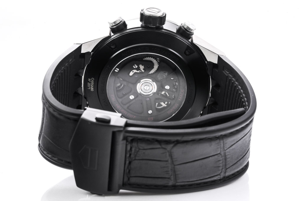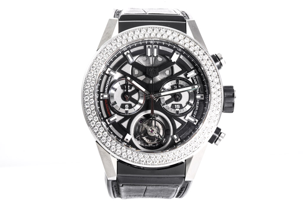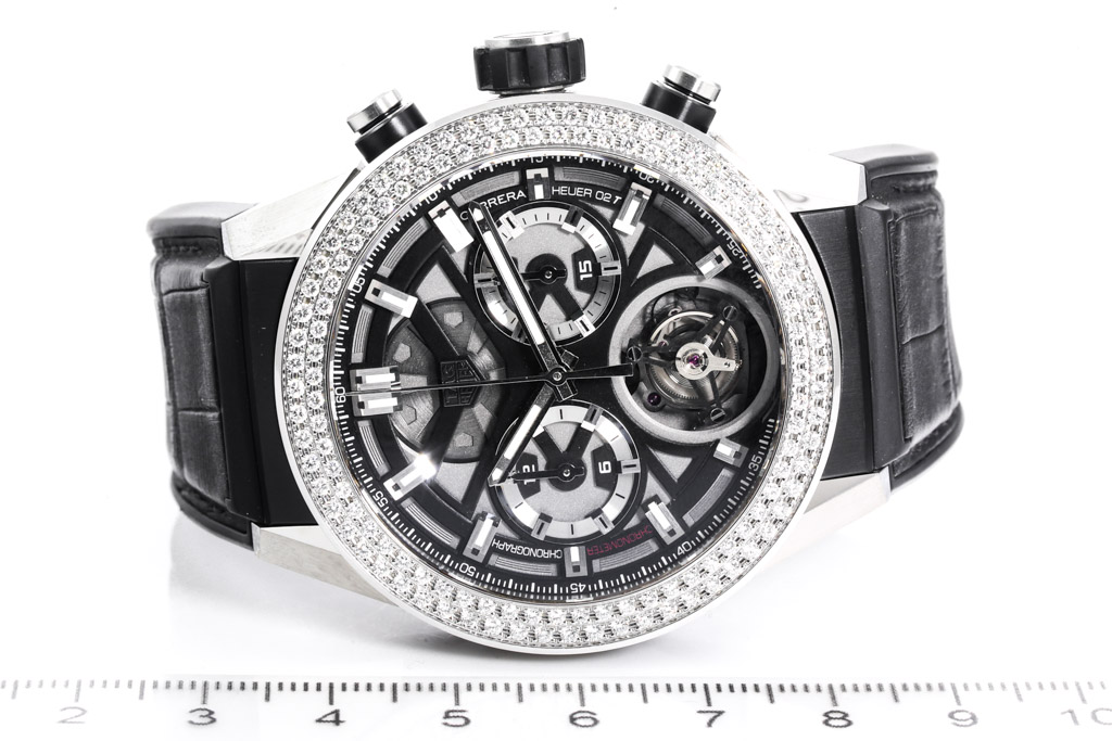 TAG Heuer Carrera black PVD titanium and stainless steel automatic men's watch. Skeleton chronograph dial, Diamond set bezel, case diameter: 45mm, wrist size: 20cm, Swiss made. Ref# CAR5A80. With TAG Heuer rubber and leather strap and clasp. With Certificate of Authenticity, TAG Heuer International Guarantee card dated 31/07/2017 and TAG Heuer box. 3 month FSA warranty. (Pre-owned)