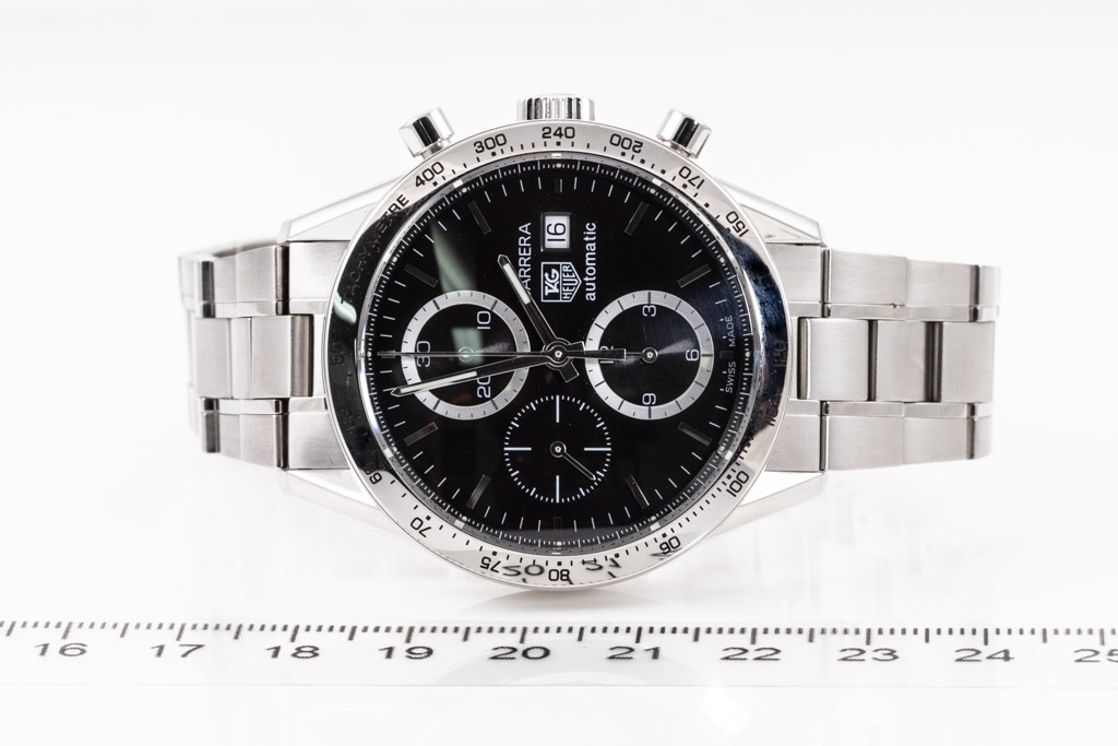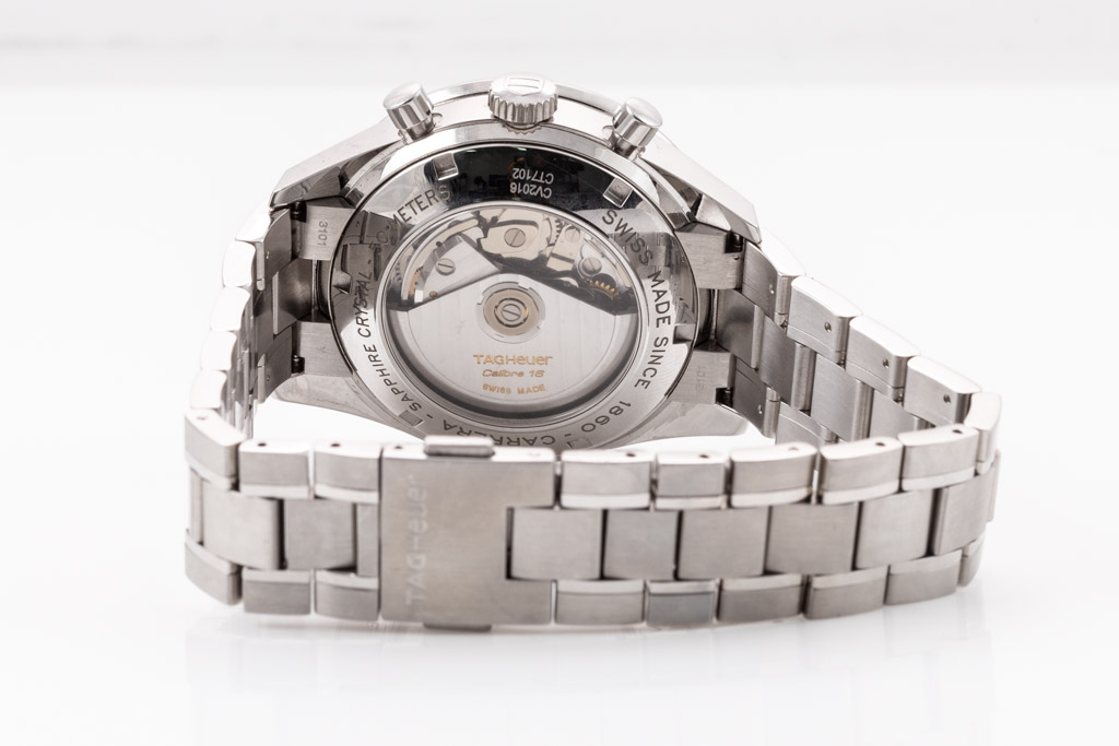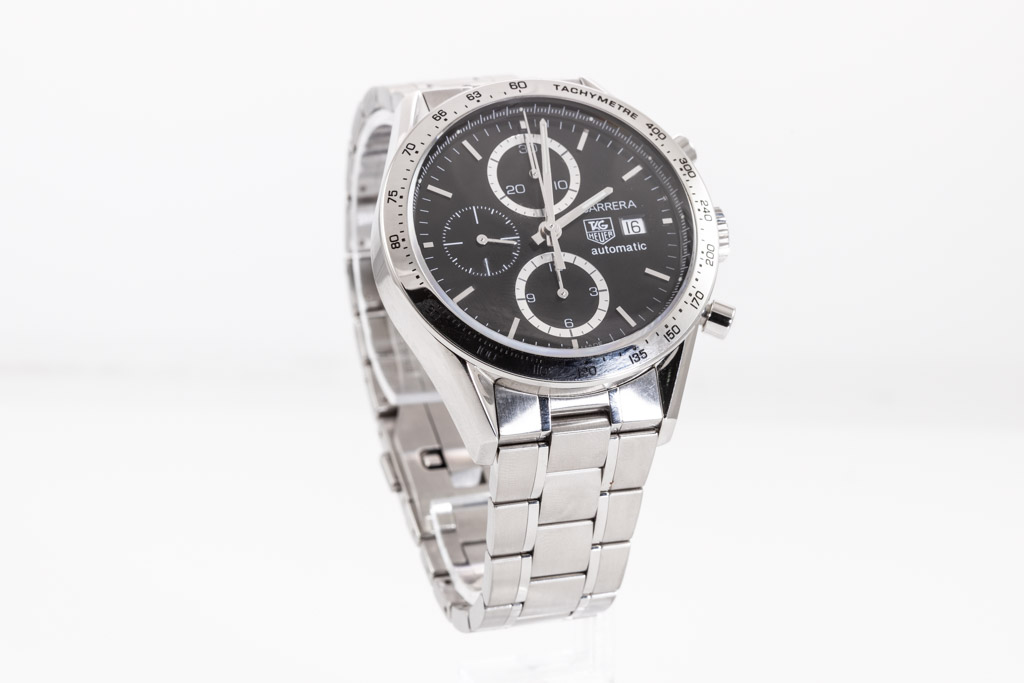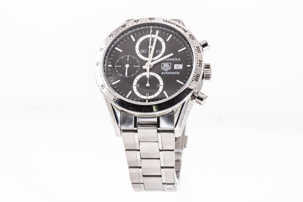 TAG Heuer Carrera stainless steel automatic mens watch. Black Chronograph dial, date, case diameter: 41mm, wrist size: 19.5cm, Swiss made. Ref# CV2016.BA0786. With TAG Heuer stainless steel bracelet and clasp. With Certificate of Authenticity, TAG Heuer International Guarantee Card dated 20/07/2007 and TAG Heuer box. 3 month FSA warranty. (Pre-owned)