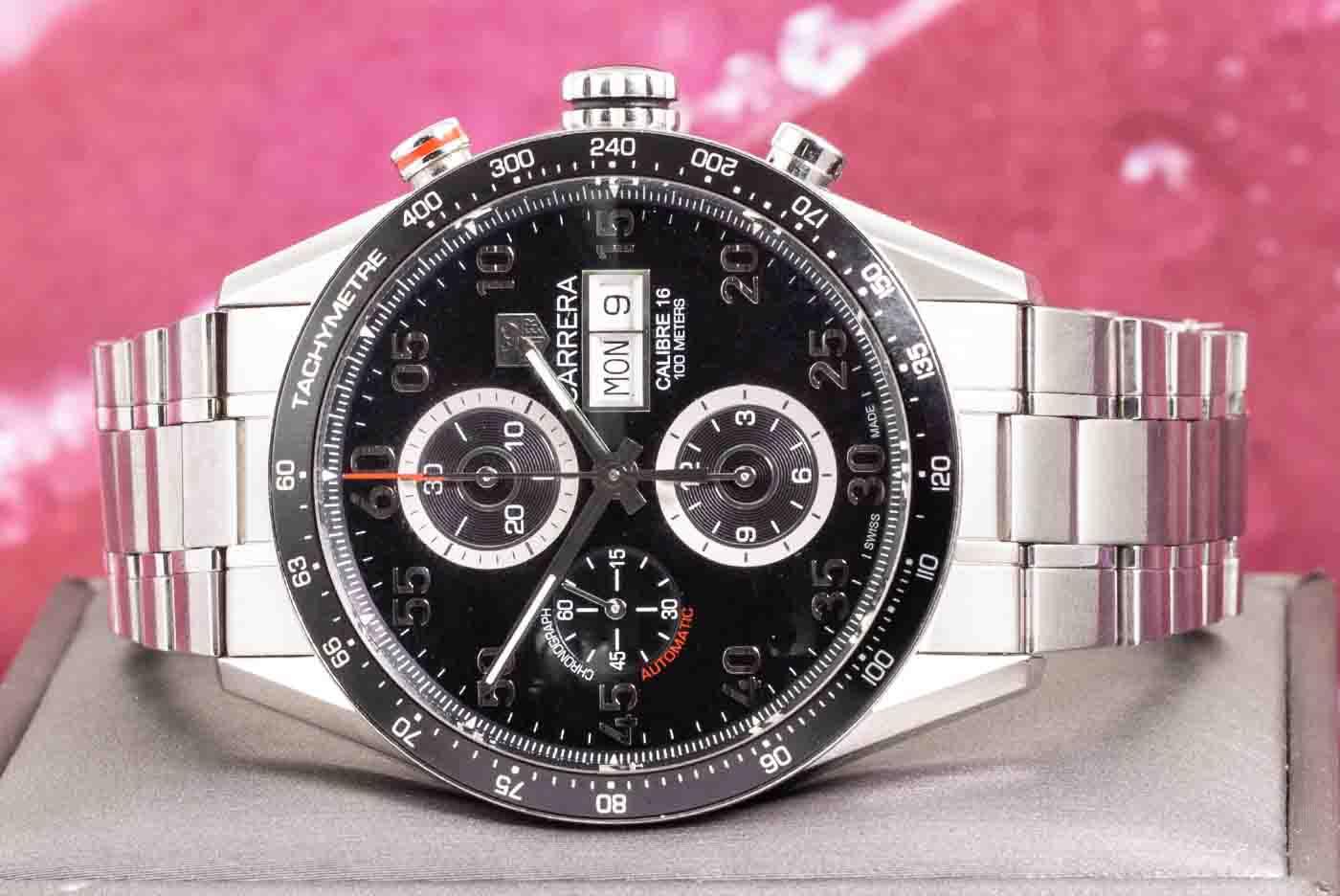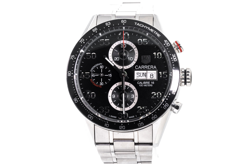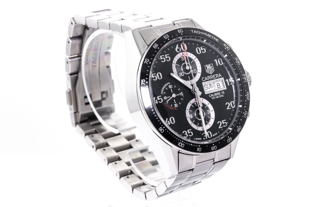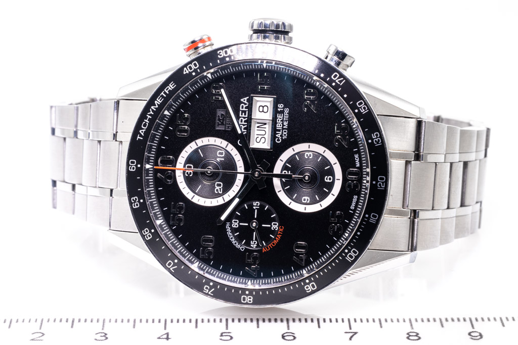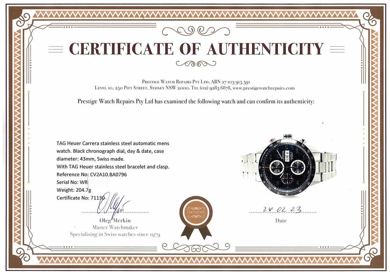TAG Heuer Carrera stainless steel automatic mens watch. Black chronograph dial, day & date, case diameter: 43mm, wrist size: 20cm, Swiss made. Ref# CV2A10.BA0796. With TAG Heuer stainless steel bracelet and clasp. With Certificate of Authenticity, TAG Heuer Limited International Guarantee card dated 30/12/2014 and TAG Heuer box. 3 month FSA warranty. (Pre-owned)
