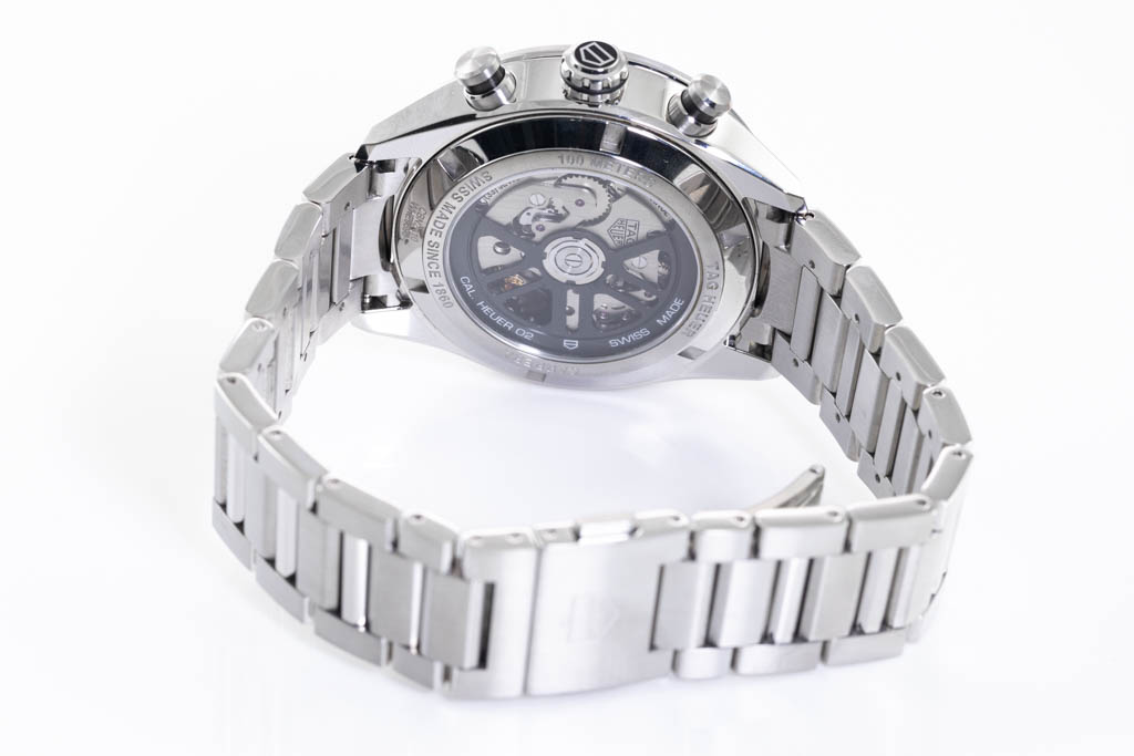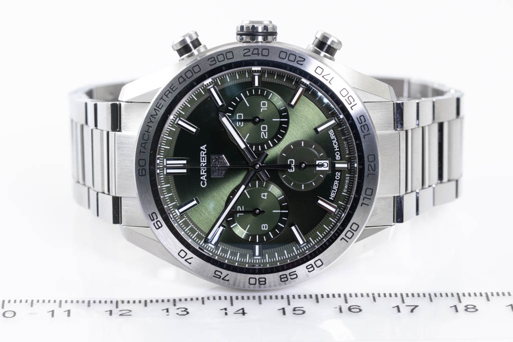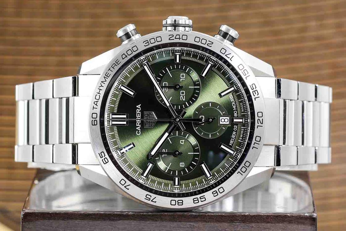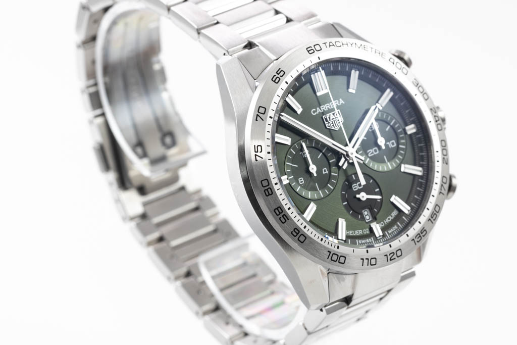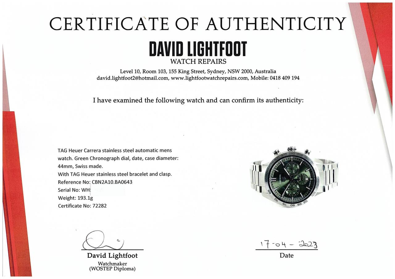 TAG Heuer Carrera stainless steel automatic mens watch. Green Chronograph dial, date, case diameter: 44mm, wrist size: 20cm, Swiss made. Ref# CBN2A10.BA0643. With TAG Heuer stainless steel bracelet and clasp. With Certificate of Authenticity, TAG Heuer International Warranty card dated 12/12/2021 and TAG Heuer box. Balance of 2 year TAG Heuer manufacturer warranty applies. (Pre-owned)